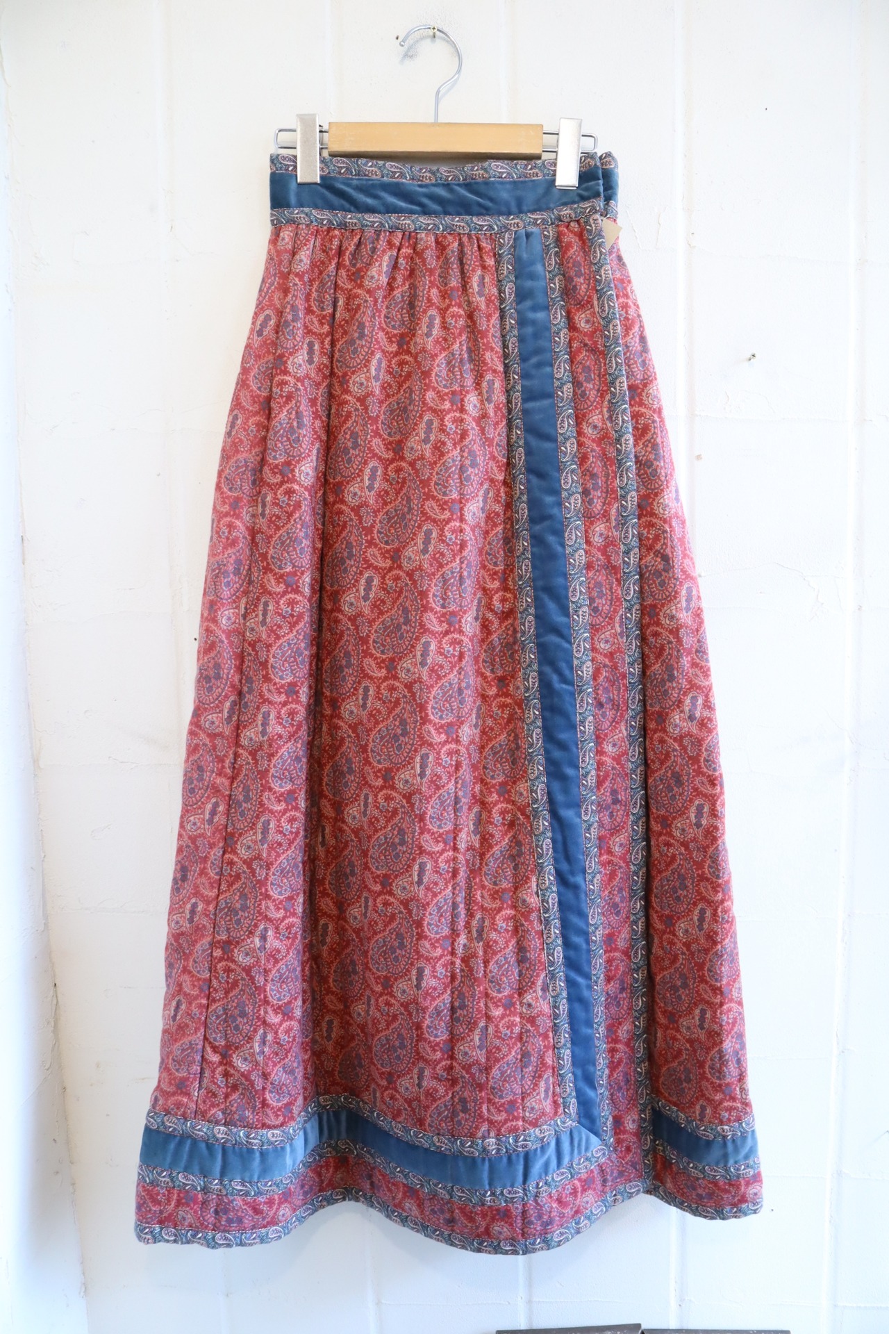 70s dullpink×blue paisley pattern quilting skirt [l-1461]