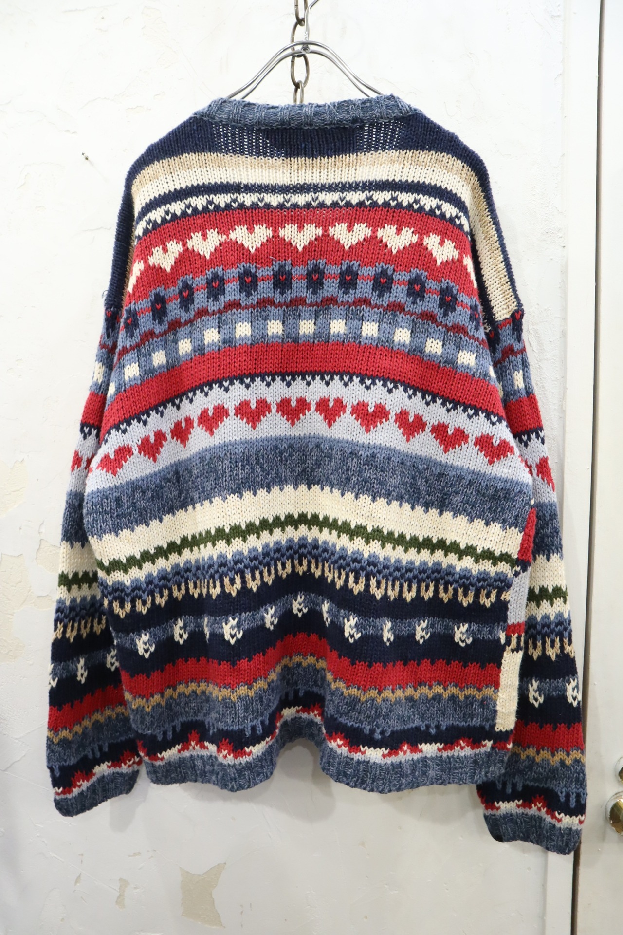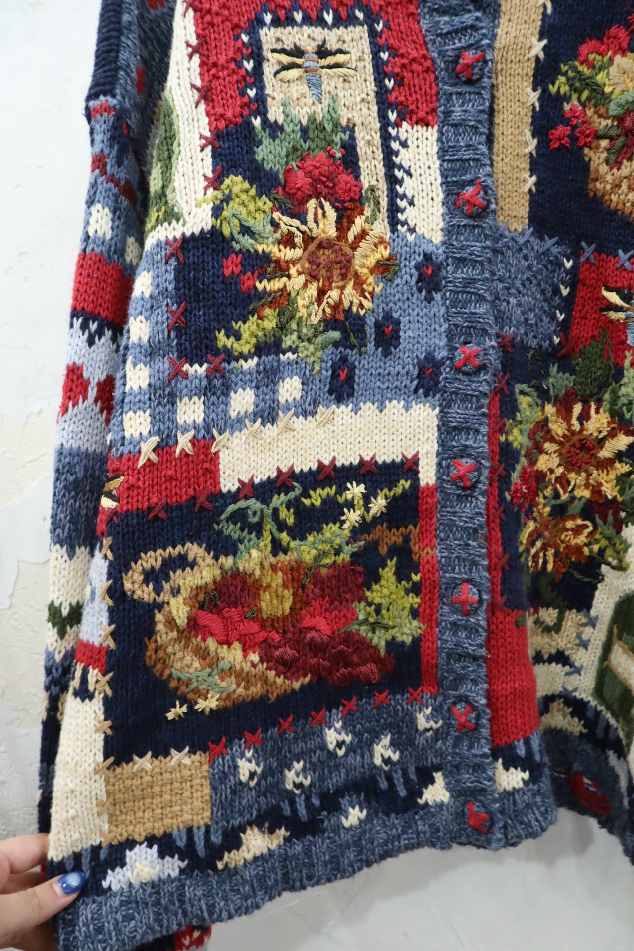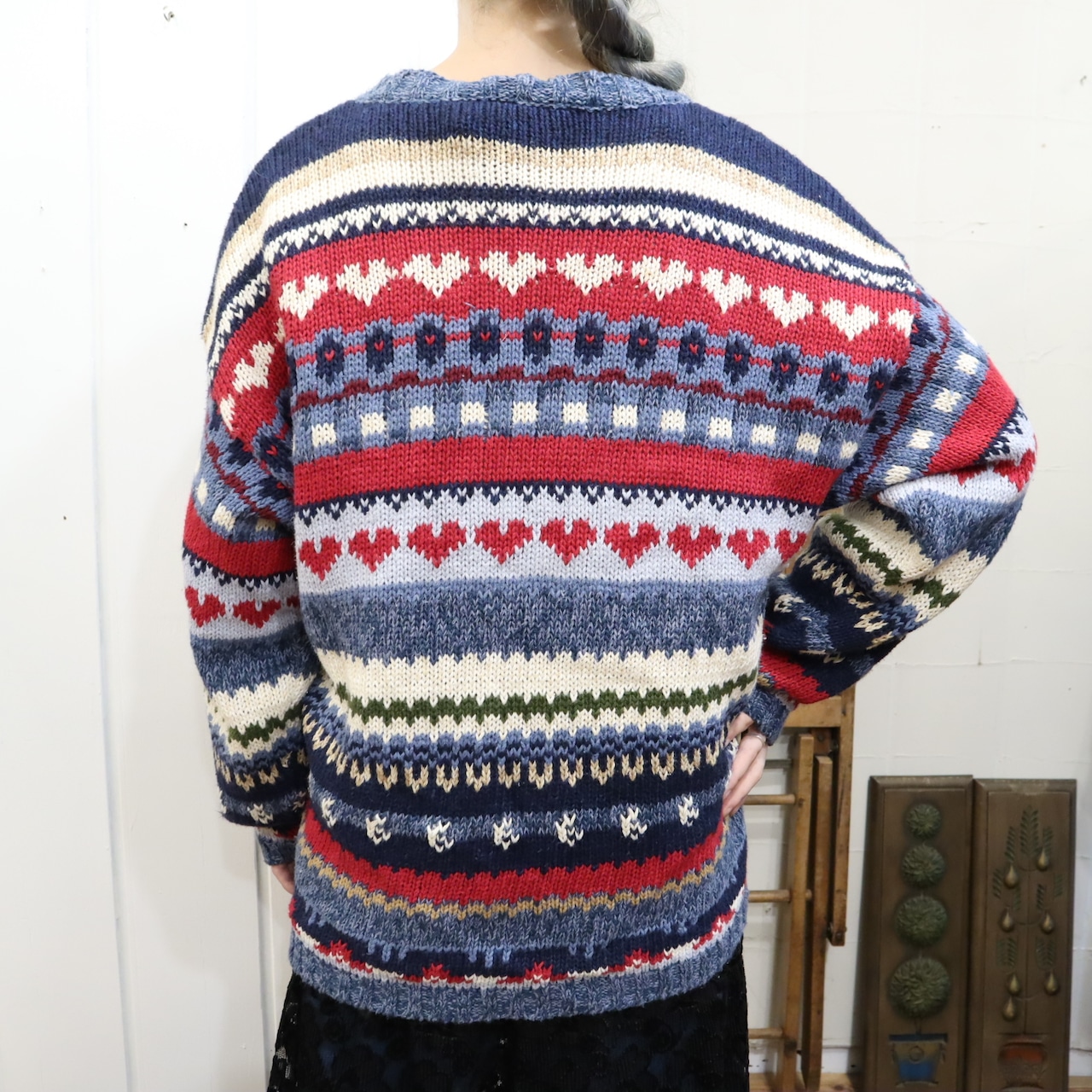 dull blue×red flower & heart cotton knit cardigan [l-1467]