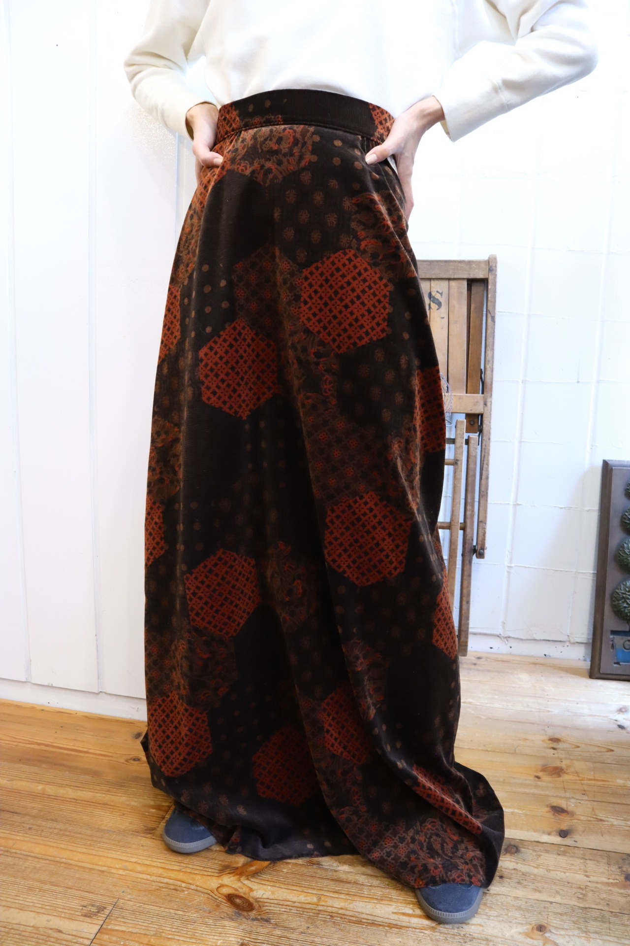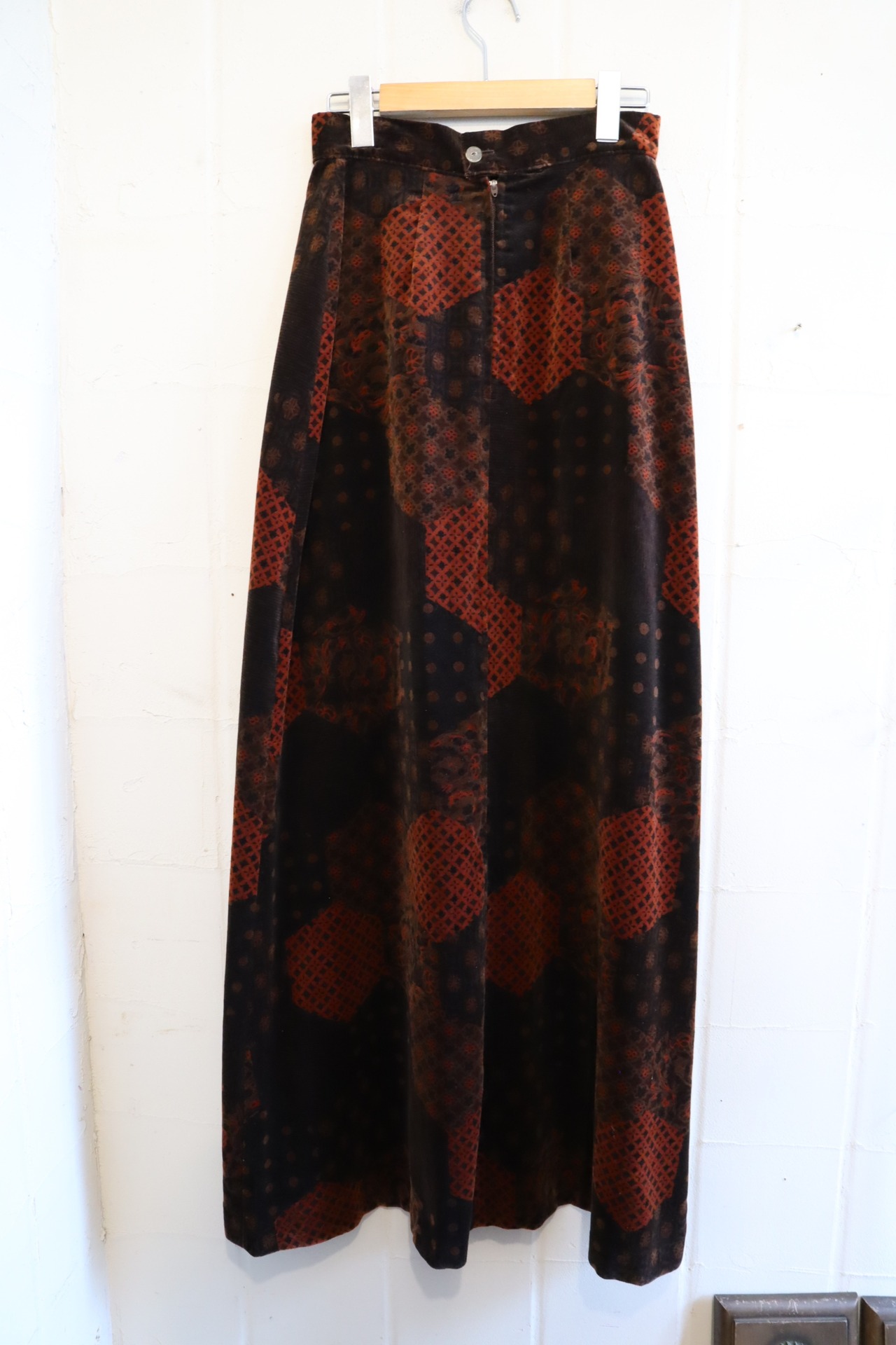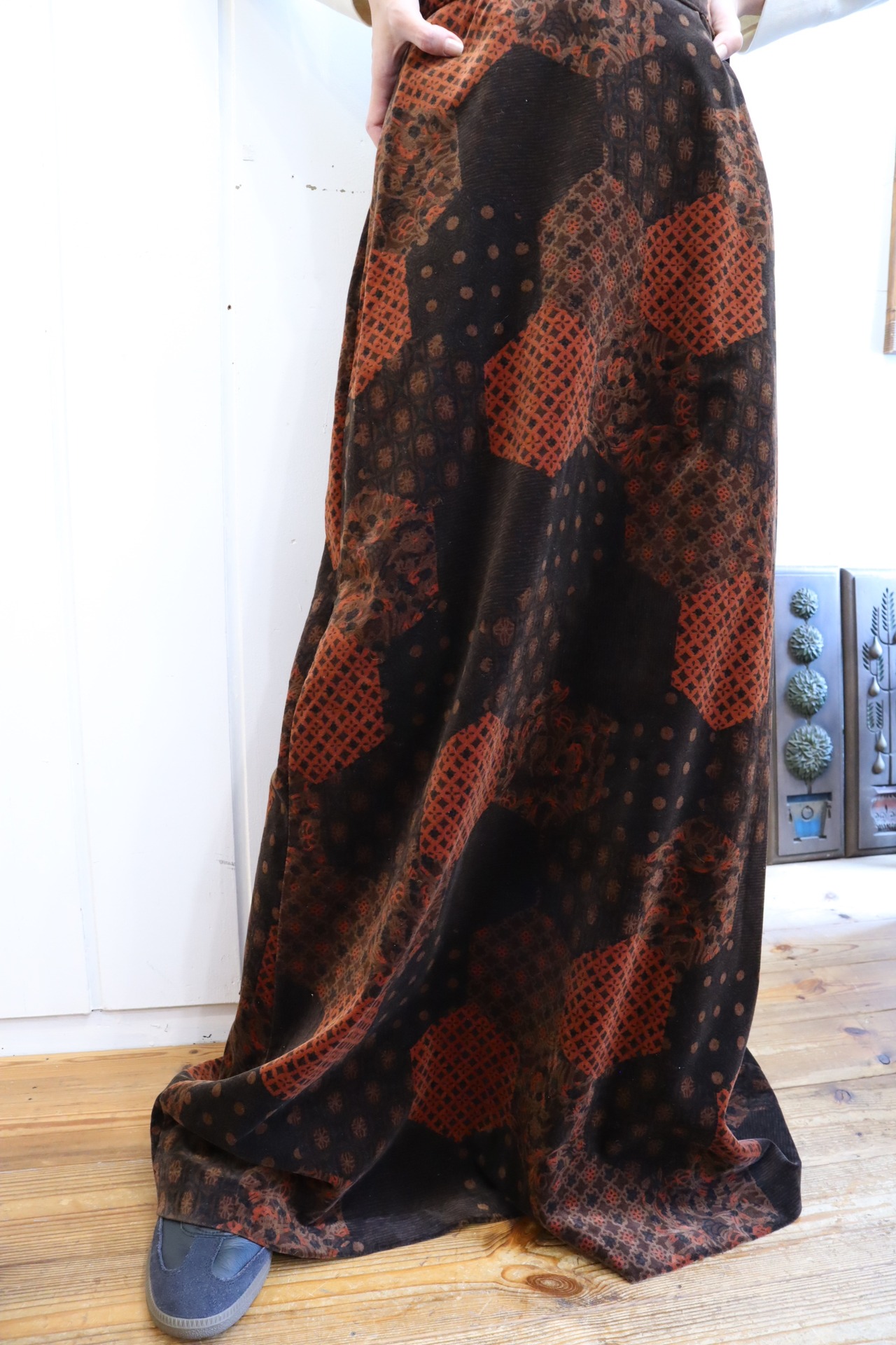 70s brown×orange hexagon pattern velour long skirt [l-1514]