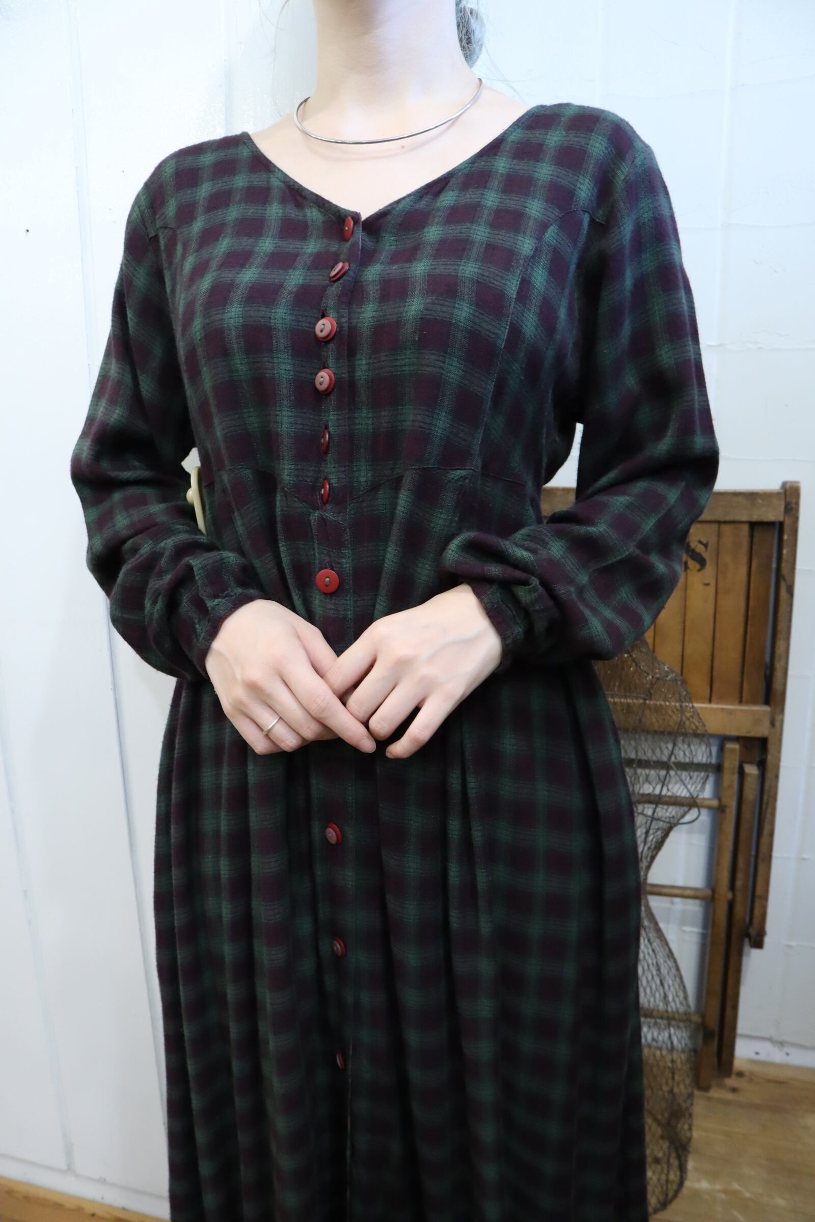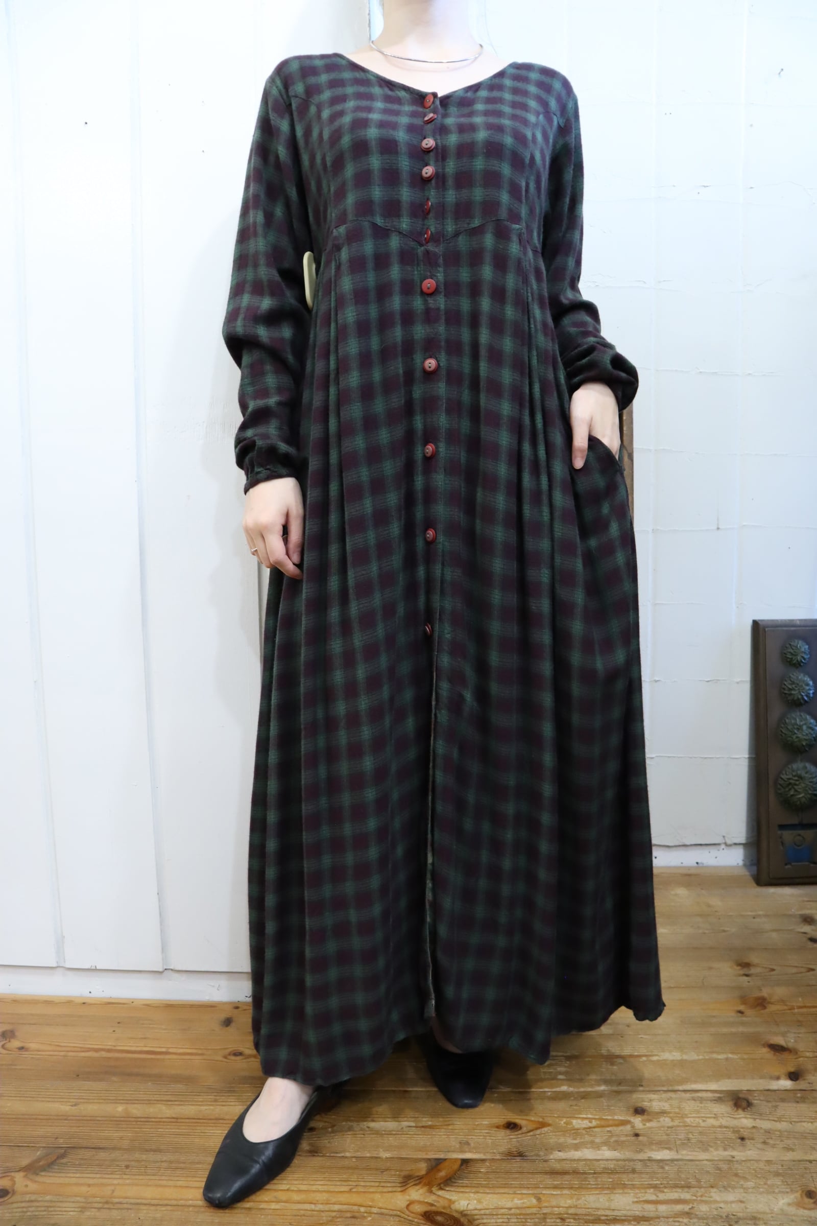 green×red plaid pattern long sleeve India rayon dress [l-1522]