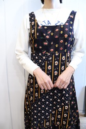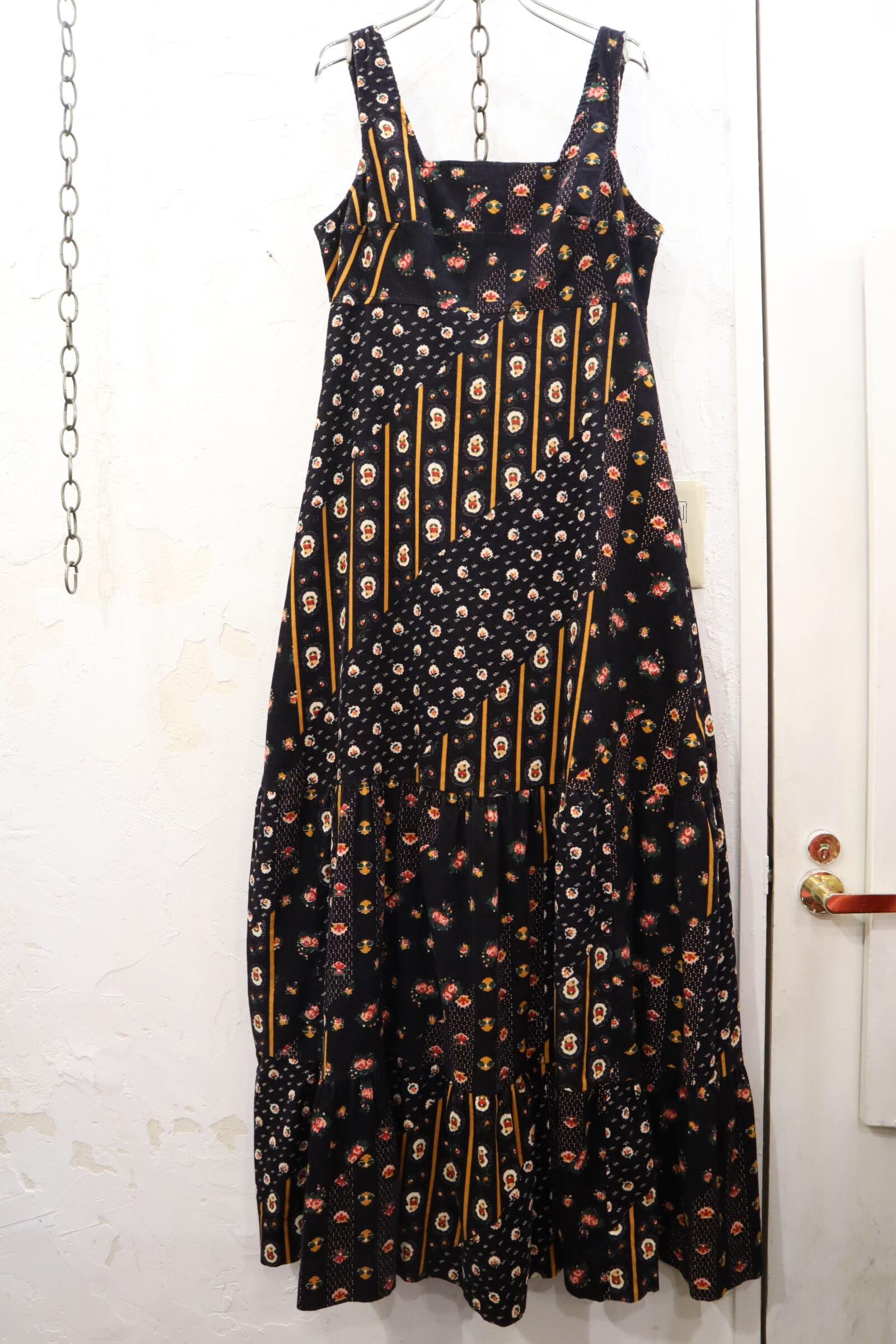 70s black×yellow×red flower pattern sleeveless corduroy dress [l-1523]