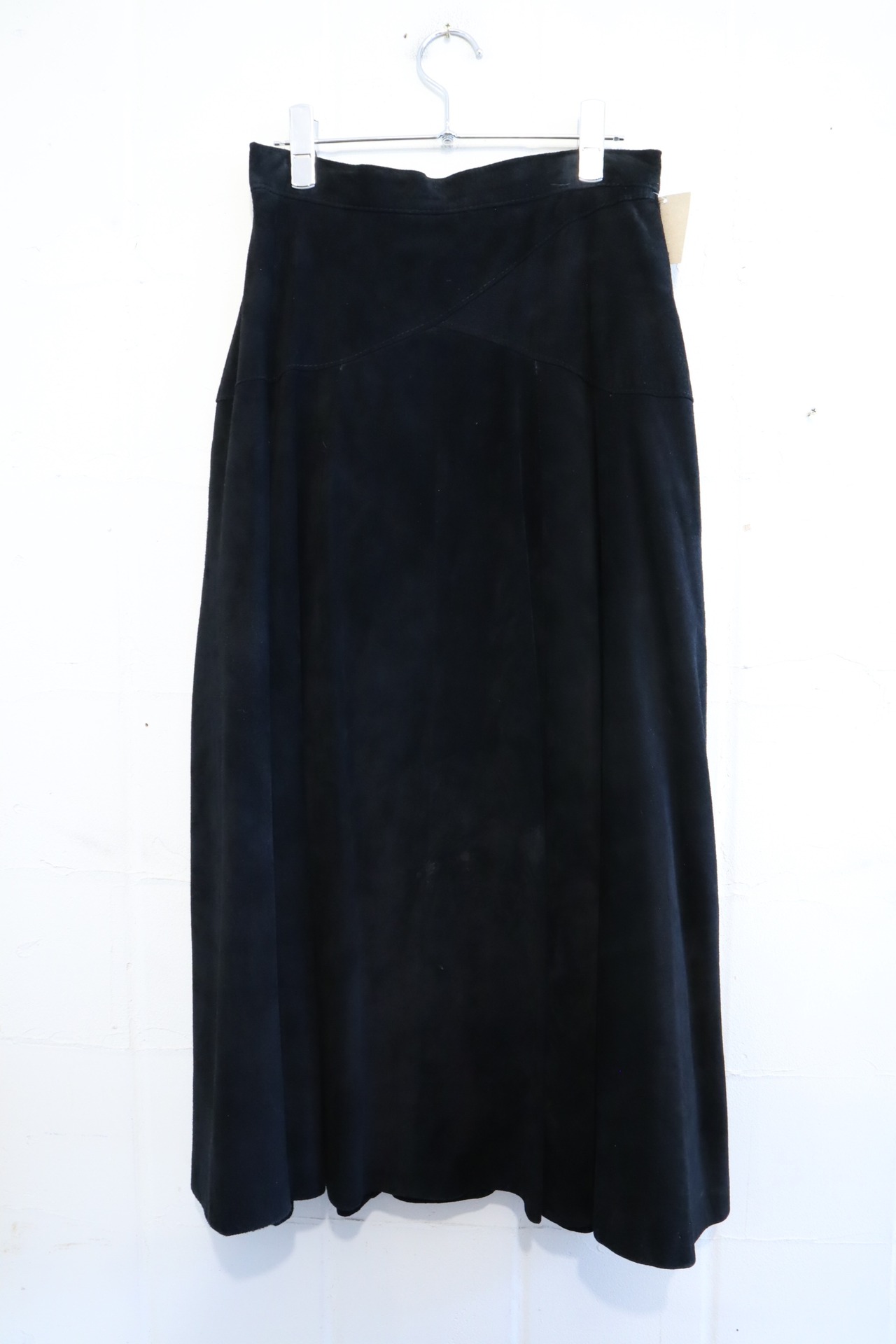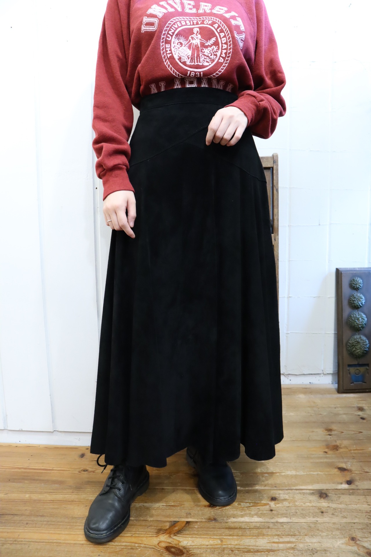 ブラックカラーのレザーが大人っぽく、さりげない切替デザインが素敵なロングスカート。