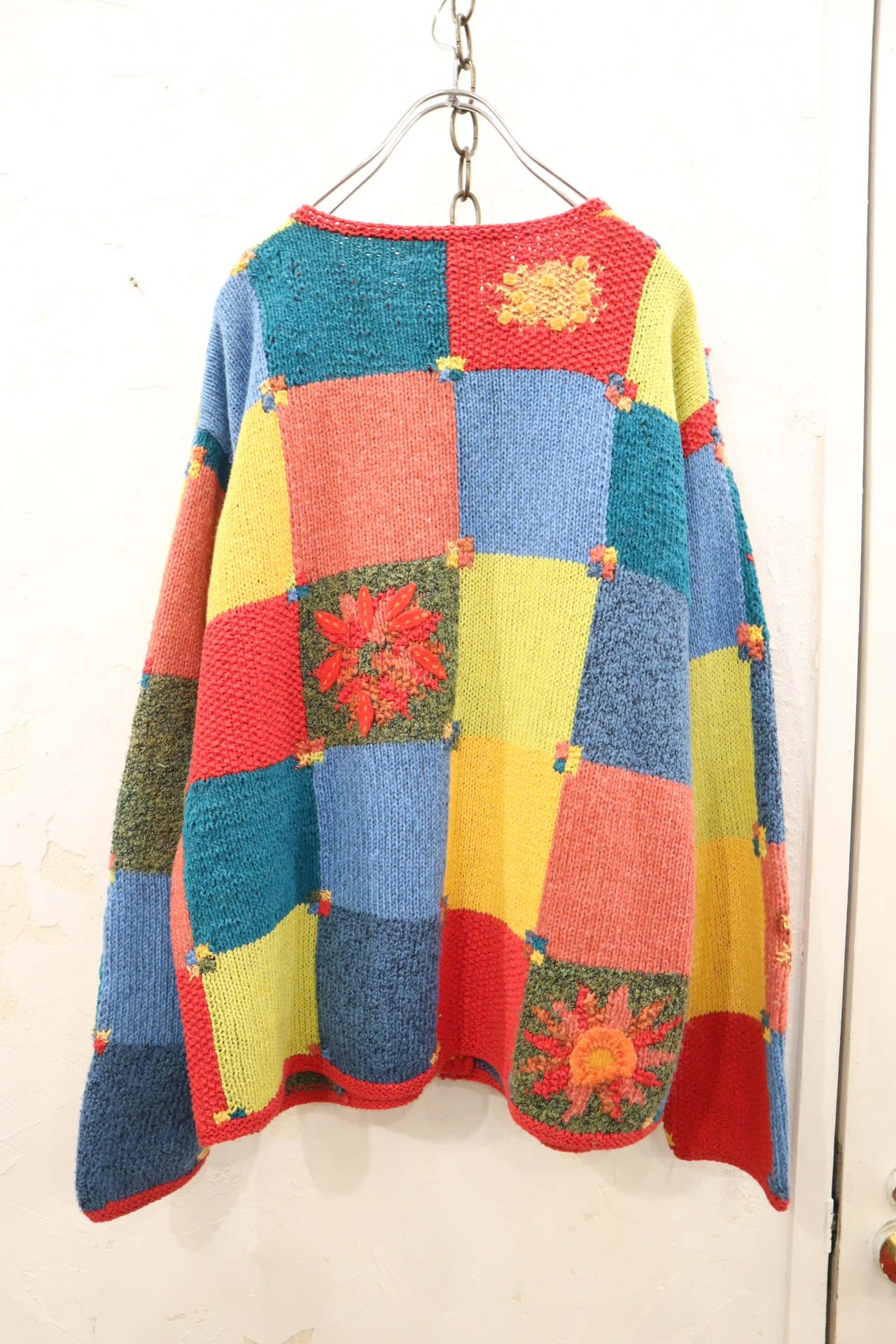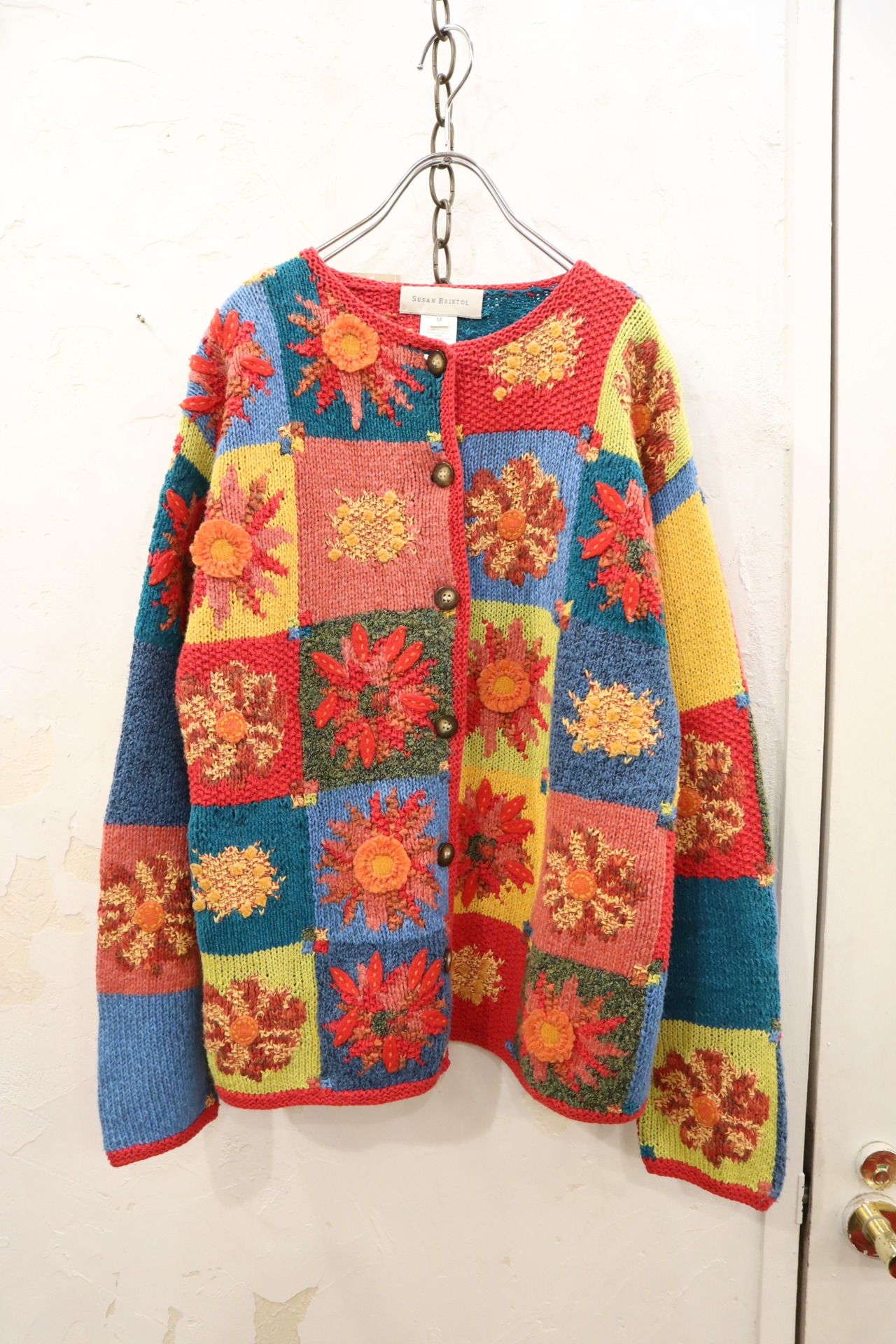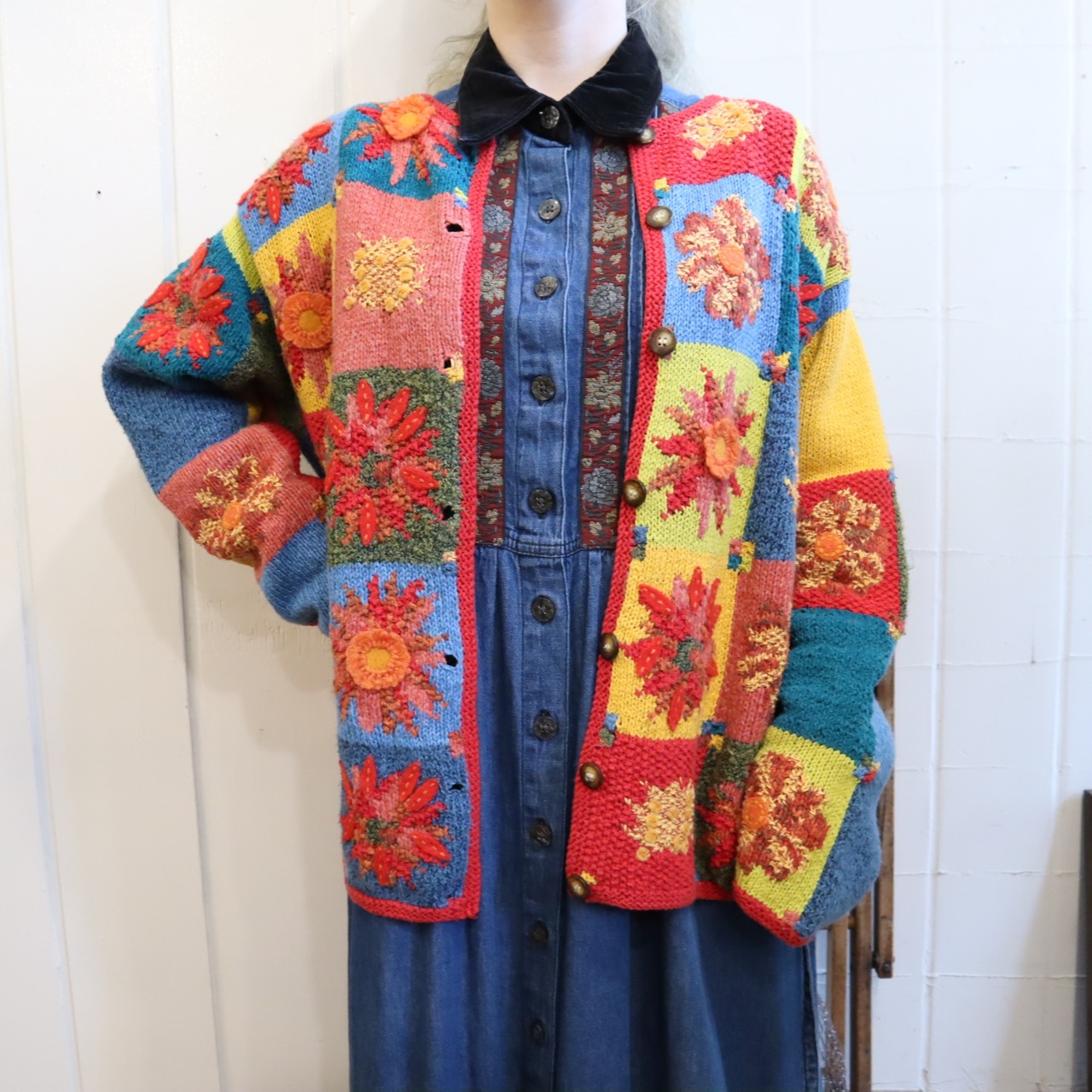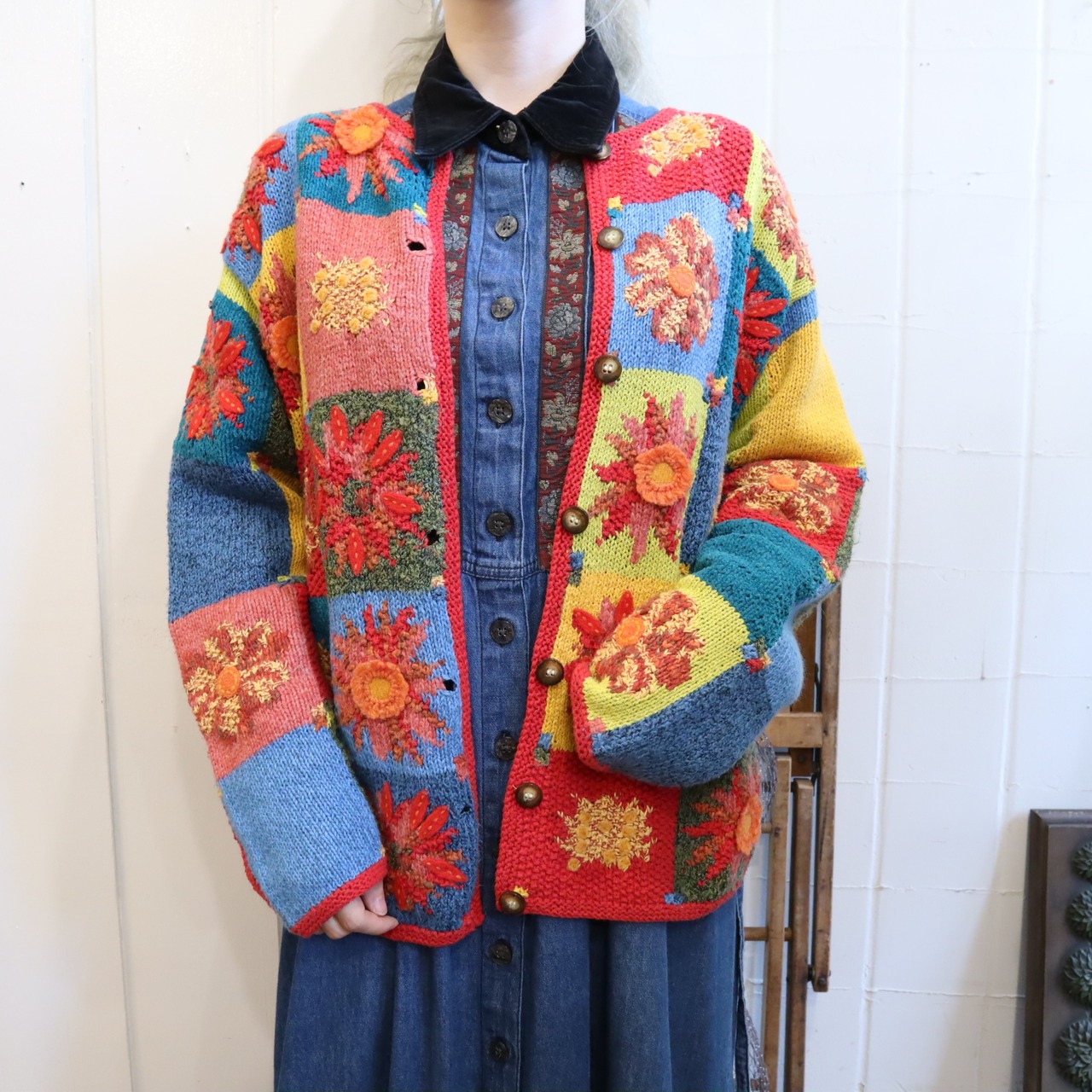 orange×blue×yellow flower ramie cotton knit cardigan [l-1551]