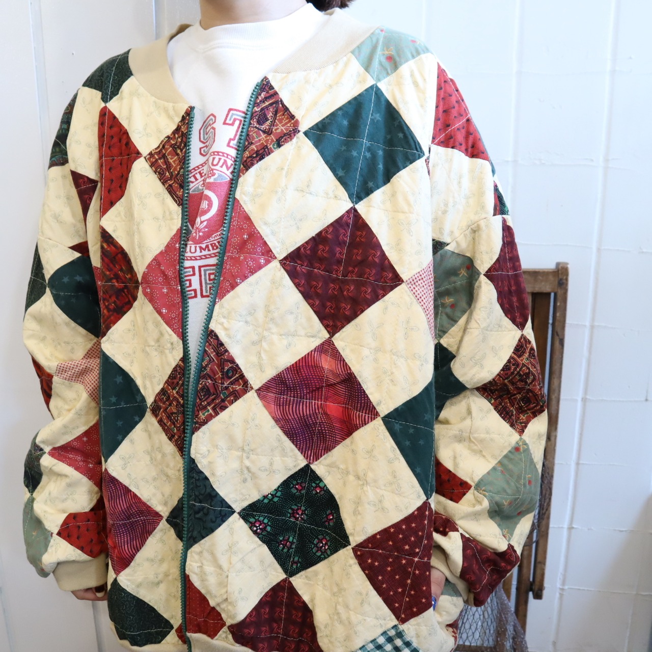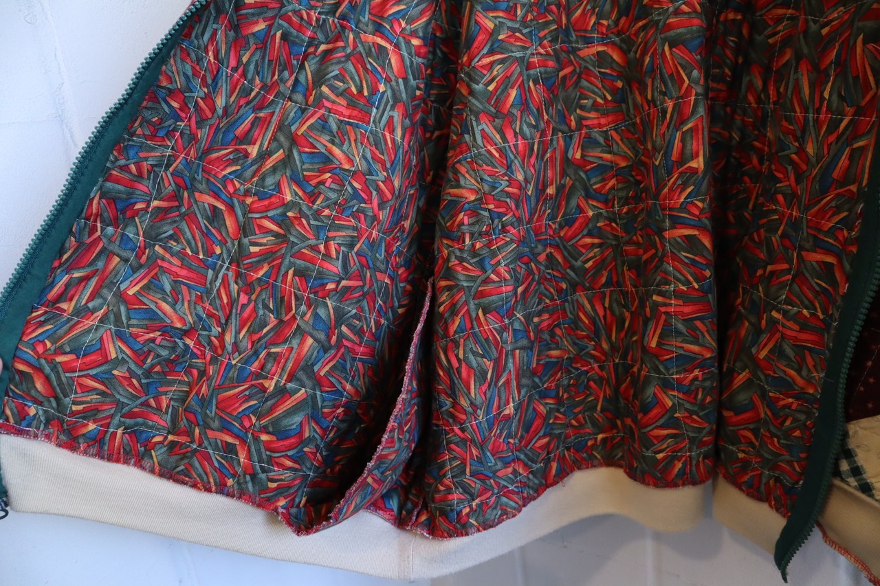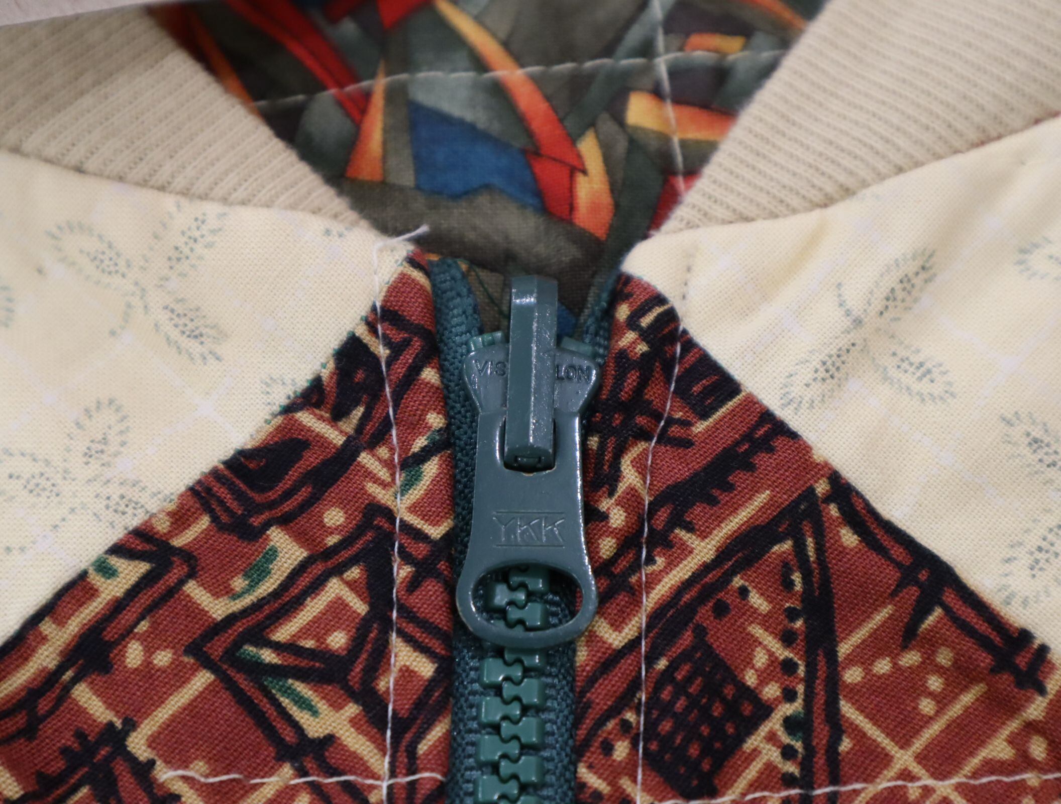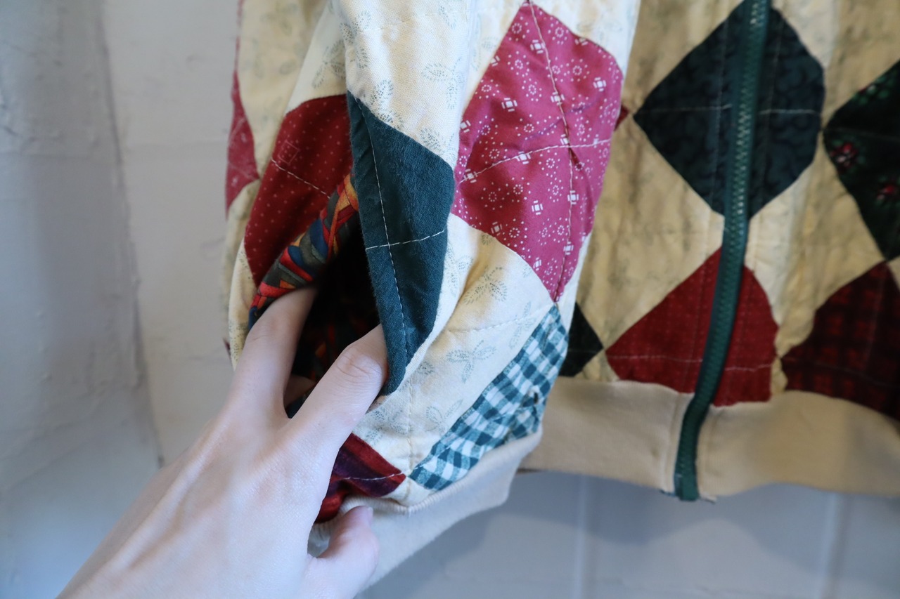 カラーリングやダイヤ型のパッチワークが可愛いジャケットです。
