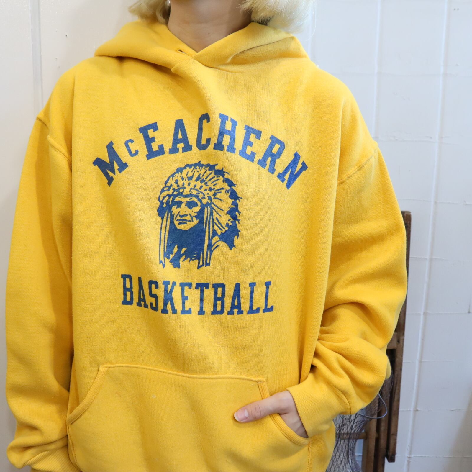 70-80s"Russell athletic"yellow×blue rubber print hoodie sweat [l-1558]