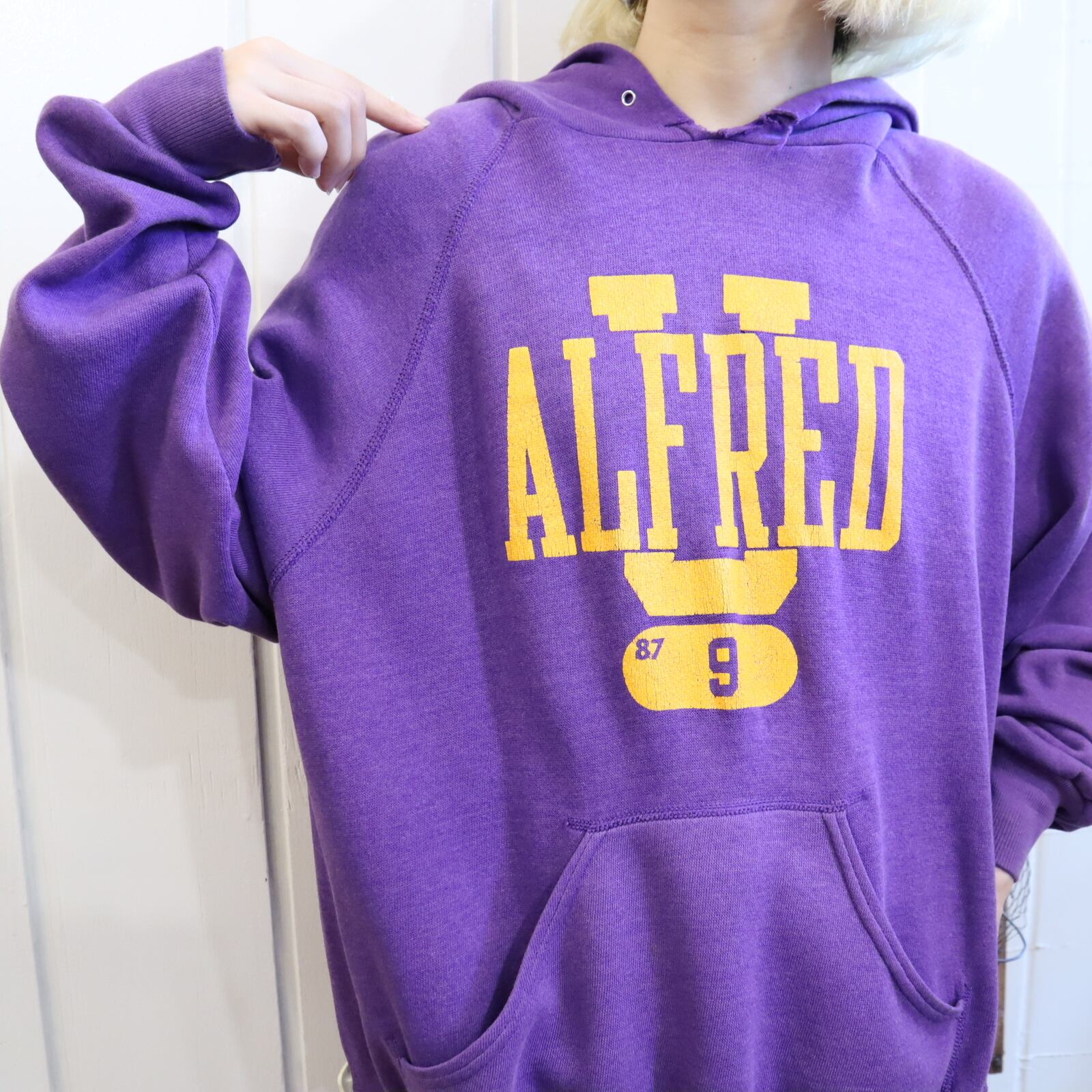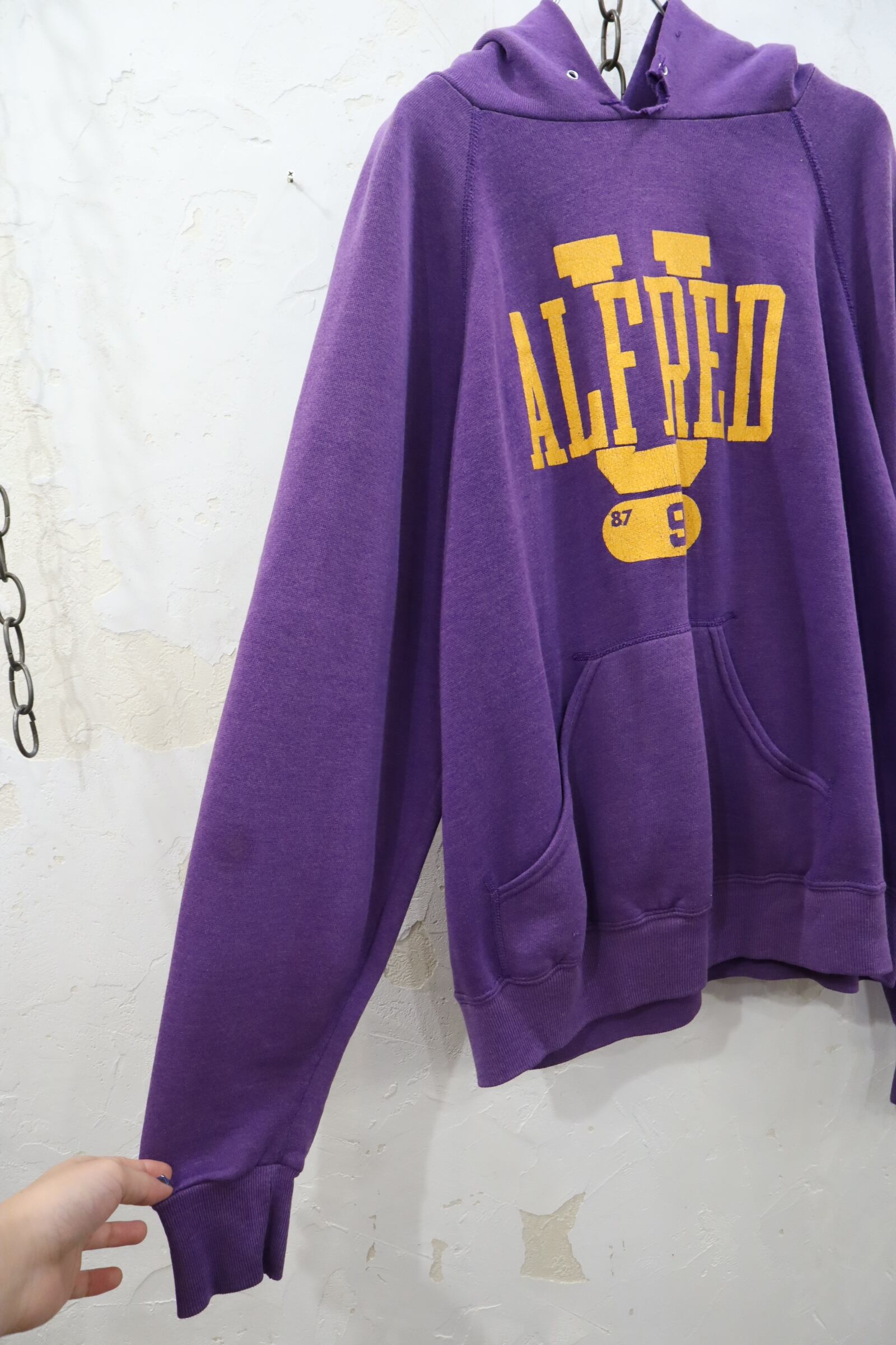 70-80s"champion"purple×yellow rubber print hoodie sweat [l-1559]