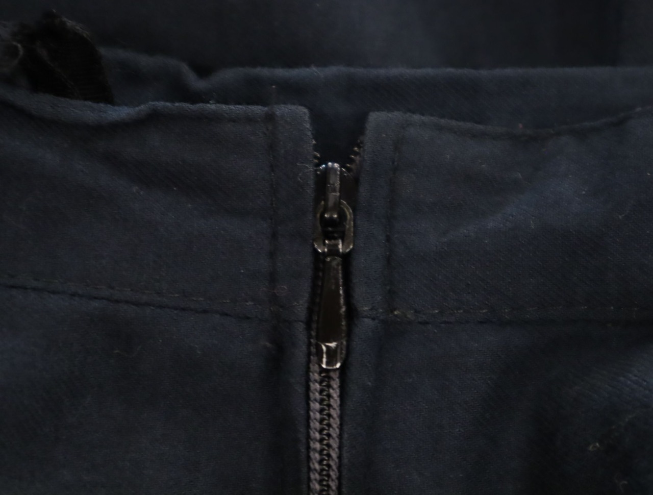 ウエスト部分に生地の癖や茶色い汚れ、シワに添って色褪せが見受けられます。