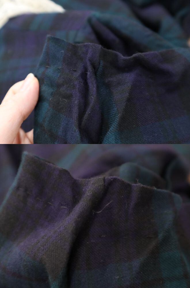 裾に若干の色抜け、シワ、一部生地のホツレ、両袖縫い目にややリペア跡とリペアによる生地のツレがございますが、あまり気にならないかと思われます。