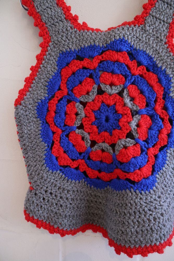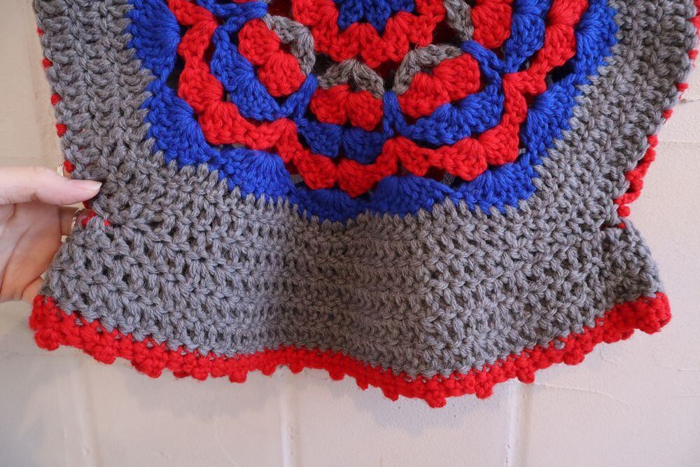 グレーをベースにしたカラーリングとお花モチーフのかぎ編みが可愛いベストです。