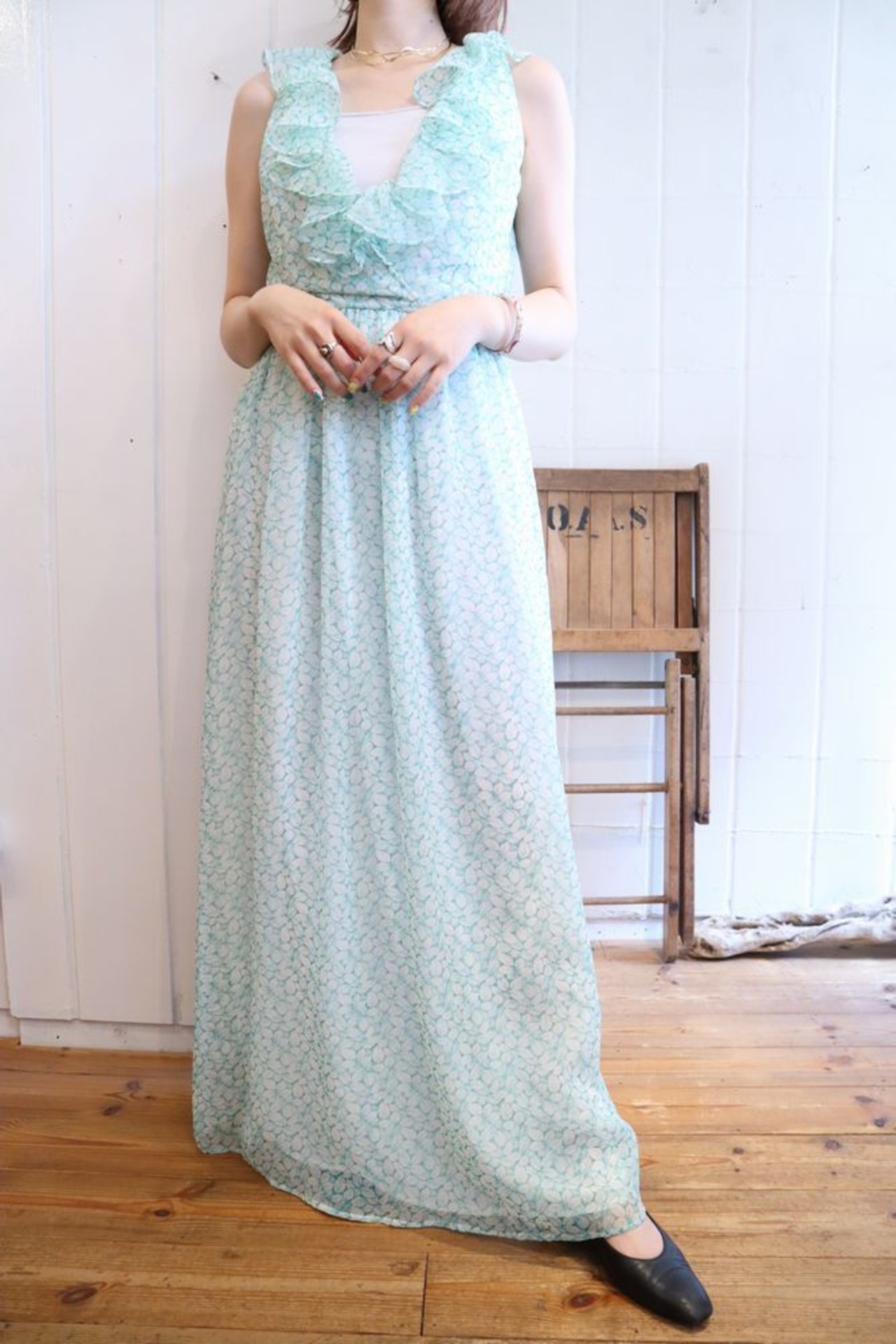 涼しげなお色味が素敵な70sドレスです。