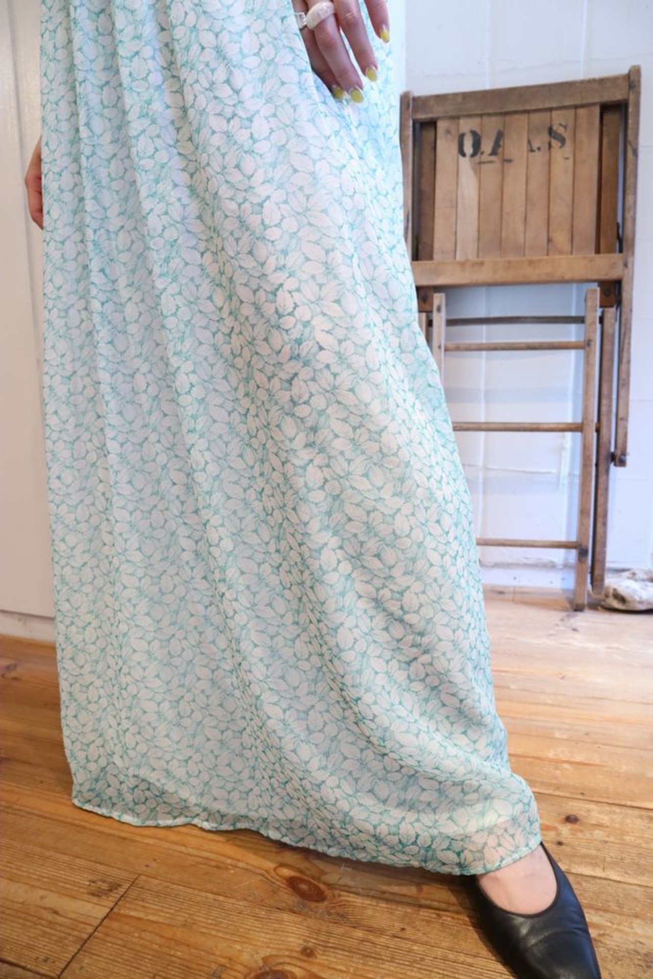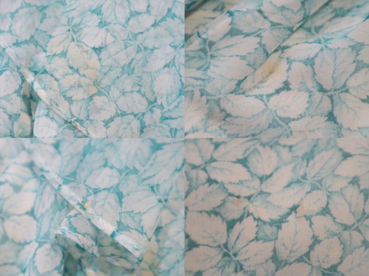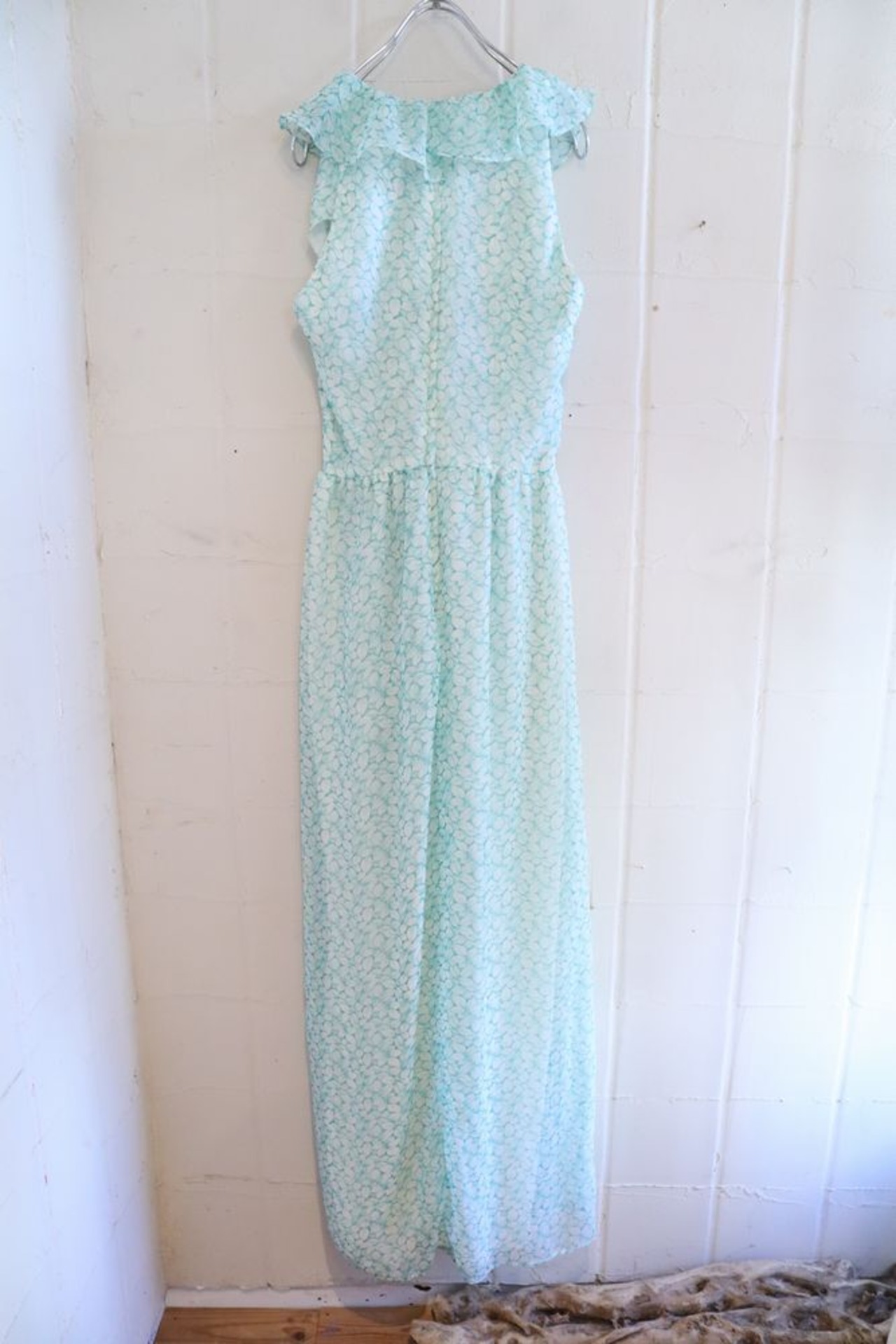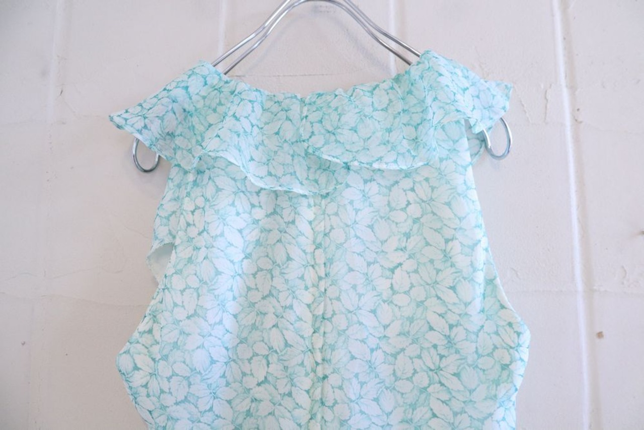 70s white×light blue green leaf pattern frill sheer dress [l-40511]