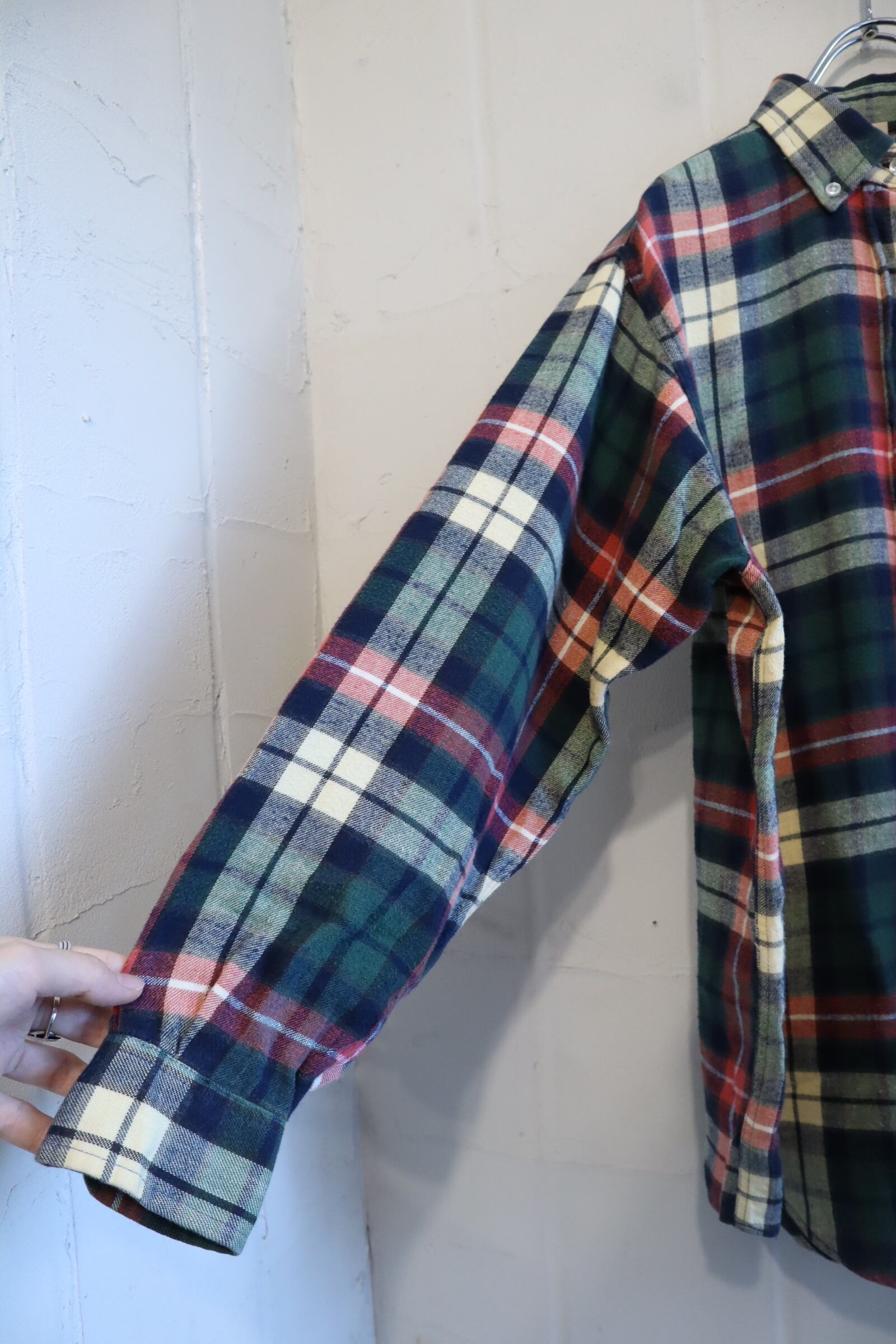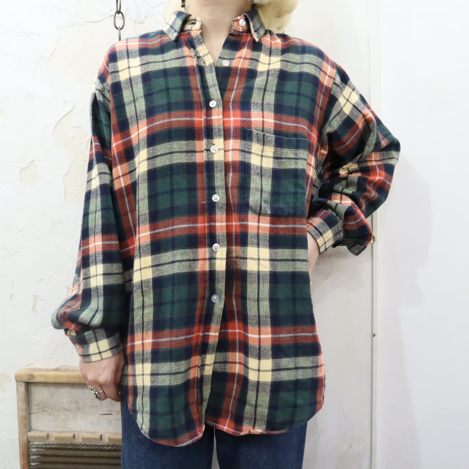 ”L.L.Bean” green×creamyellow×red plaid flannel shirt [l-1602]