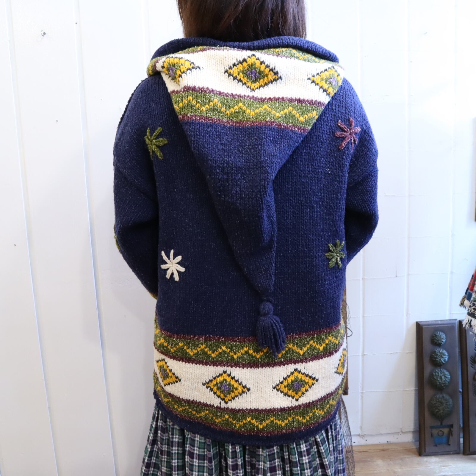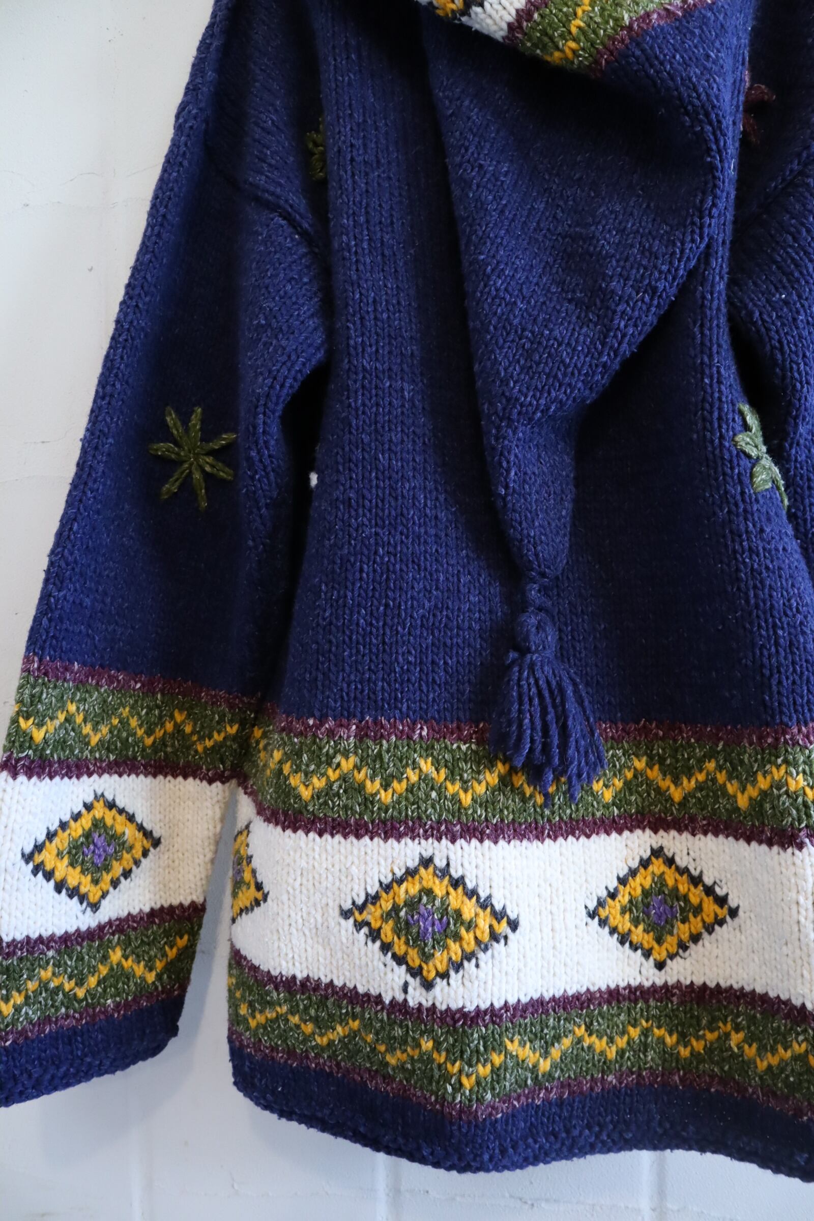 お花やダイヤ柄、大きなフードが可愛いエクアドルニットカーディガン♡