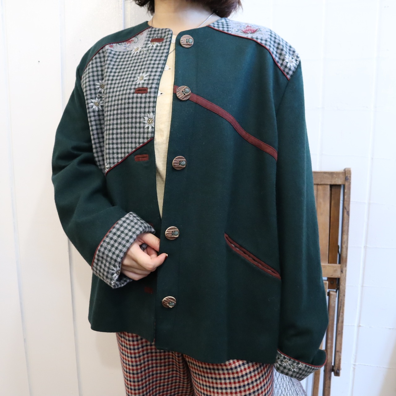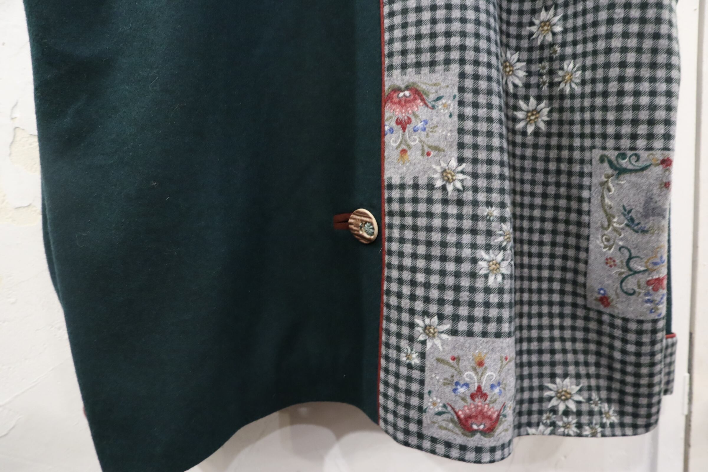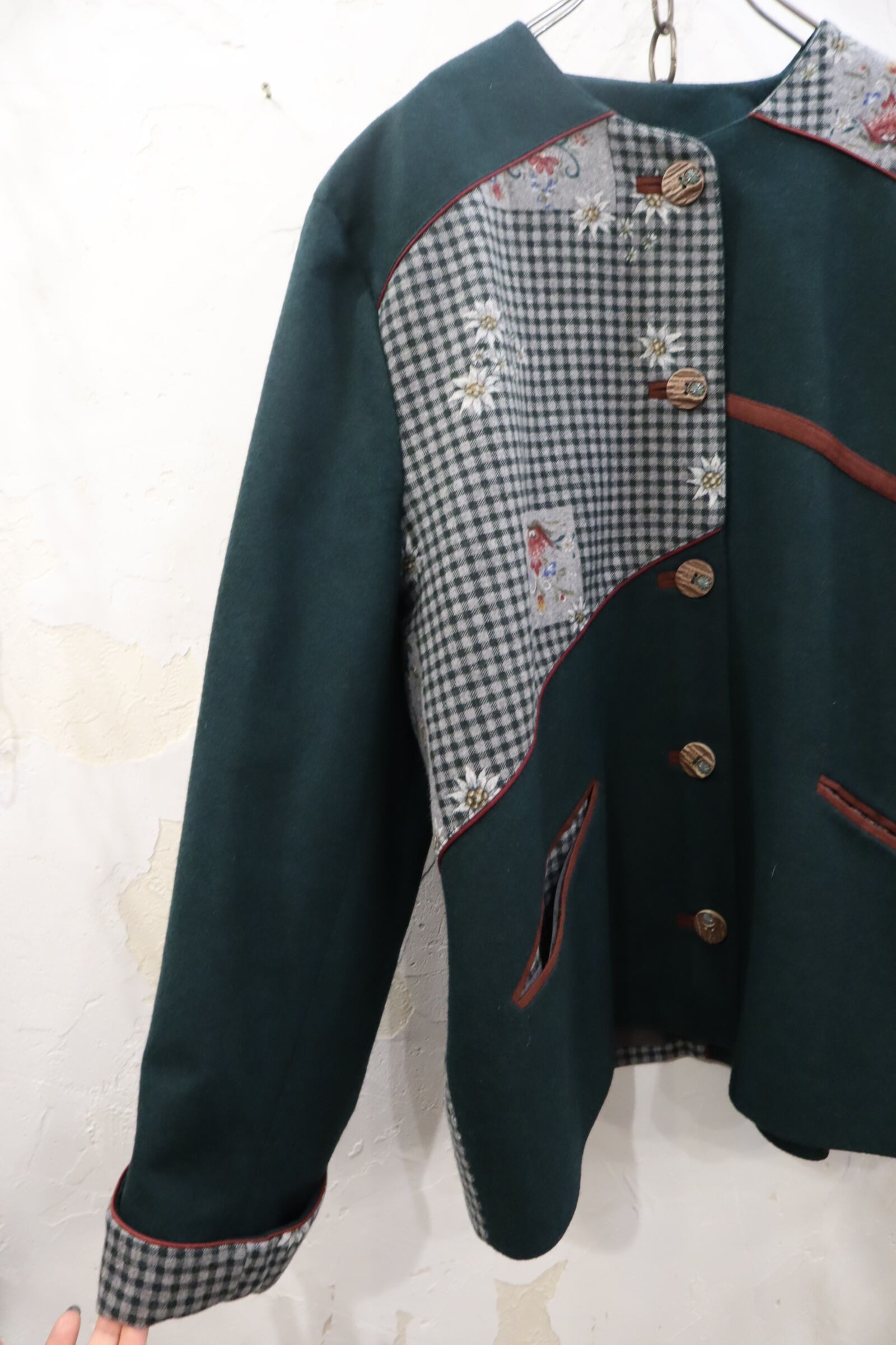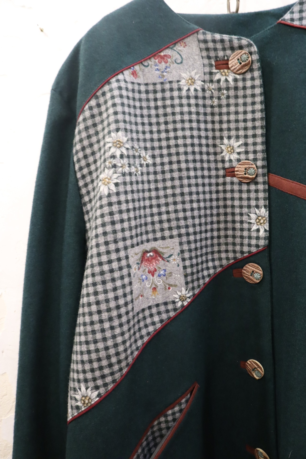 green gingham check flowers painting Tyrolean wool jacket[l-1626]