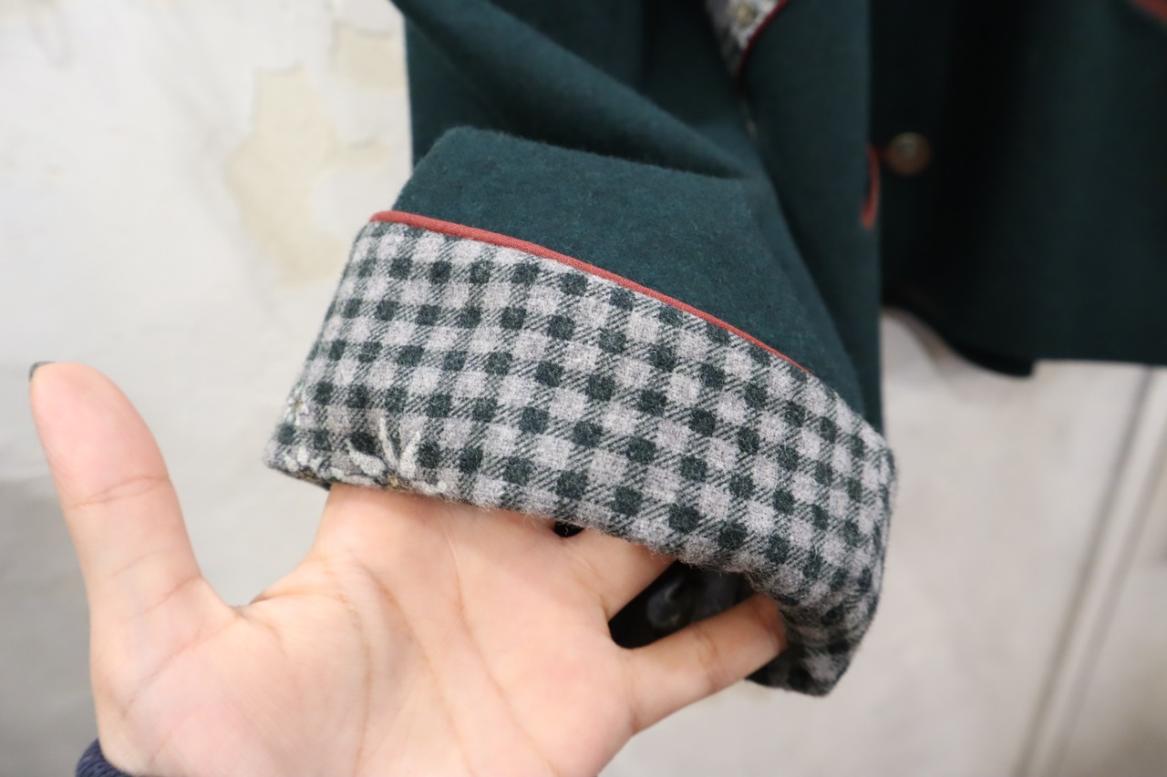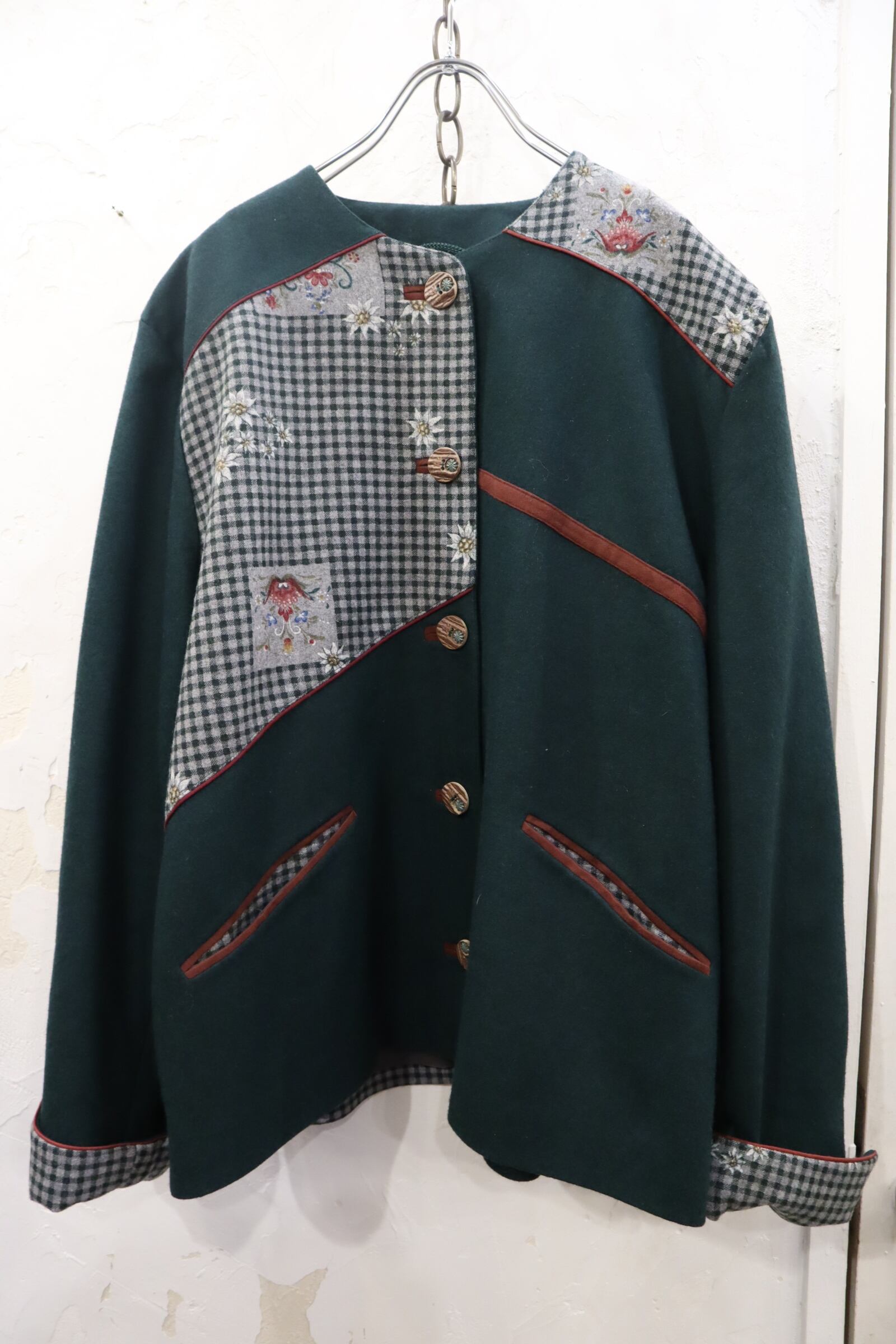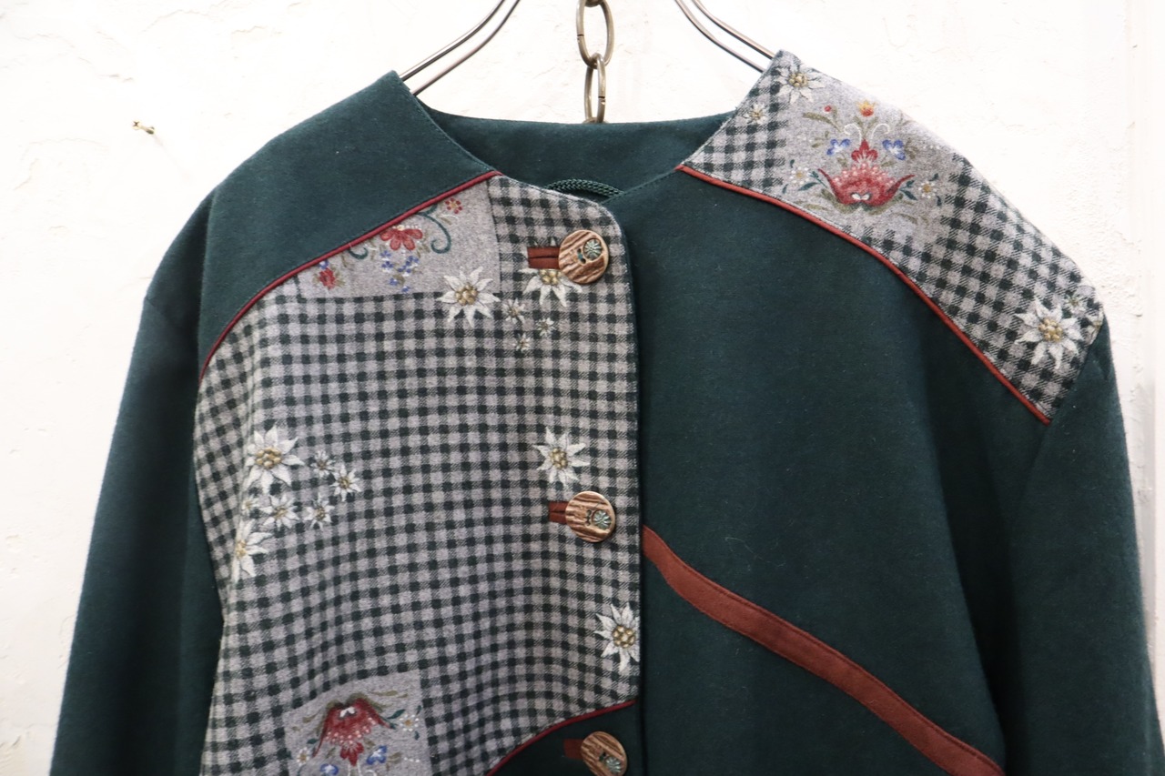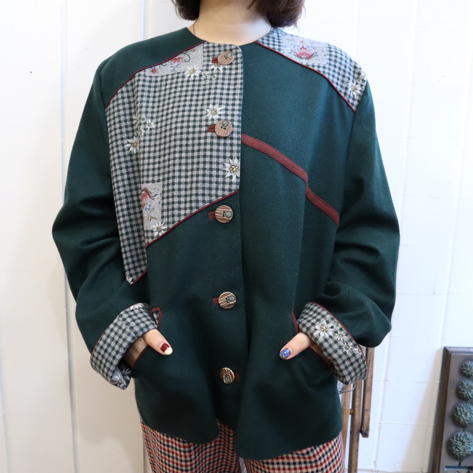 green gingham check flowers painting Tyrolean wool jacket[l-1626]
