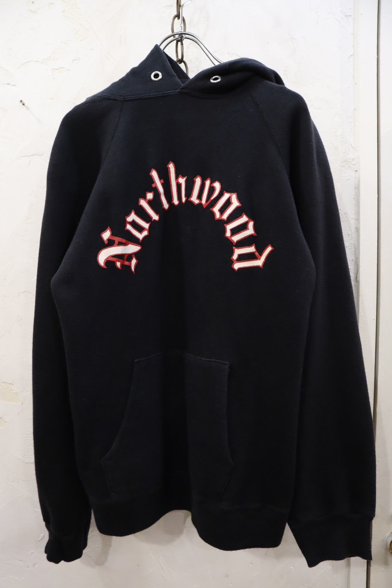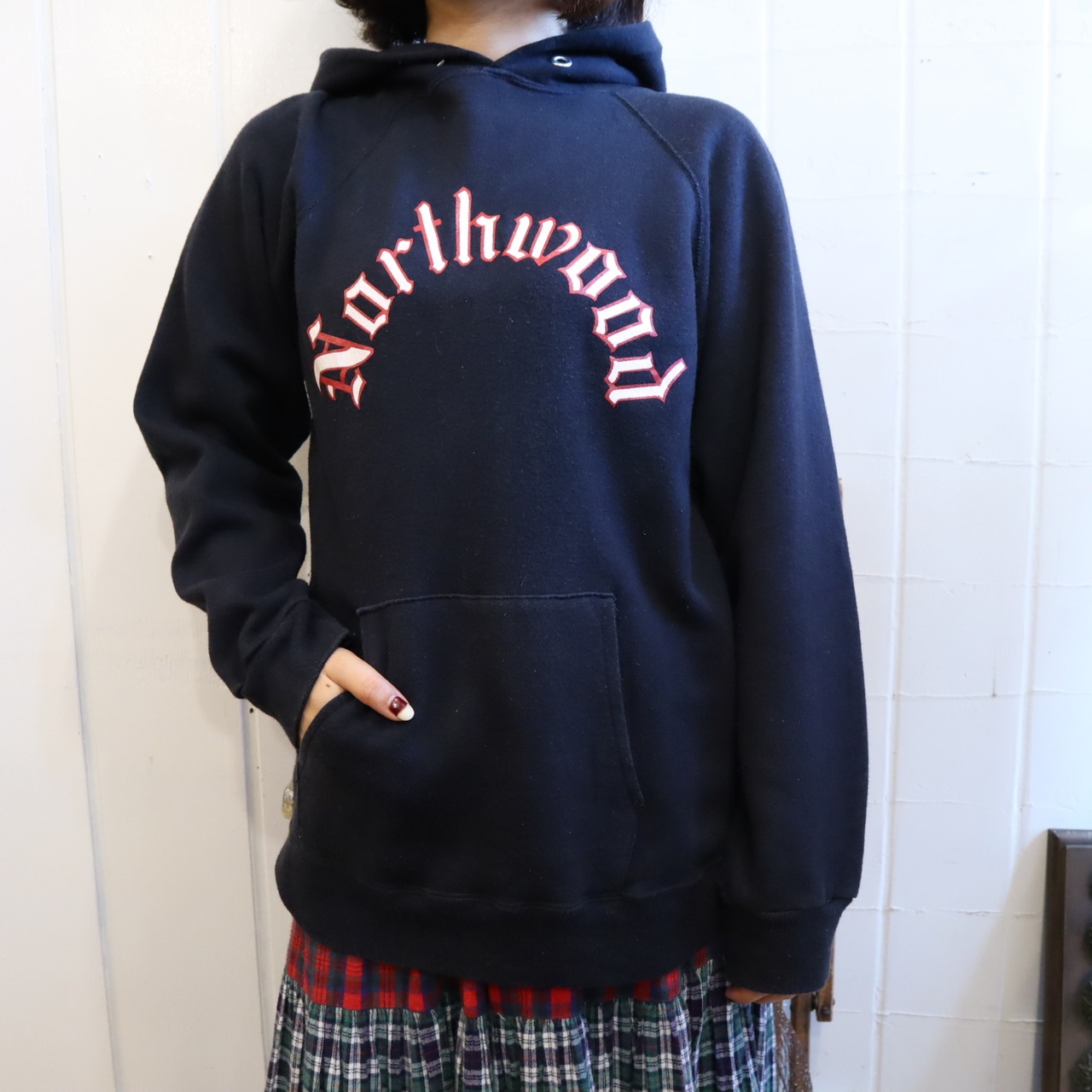 80s "champion" black×red×white rubber print hoodie sweat [l-1650]