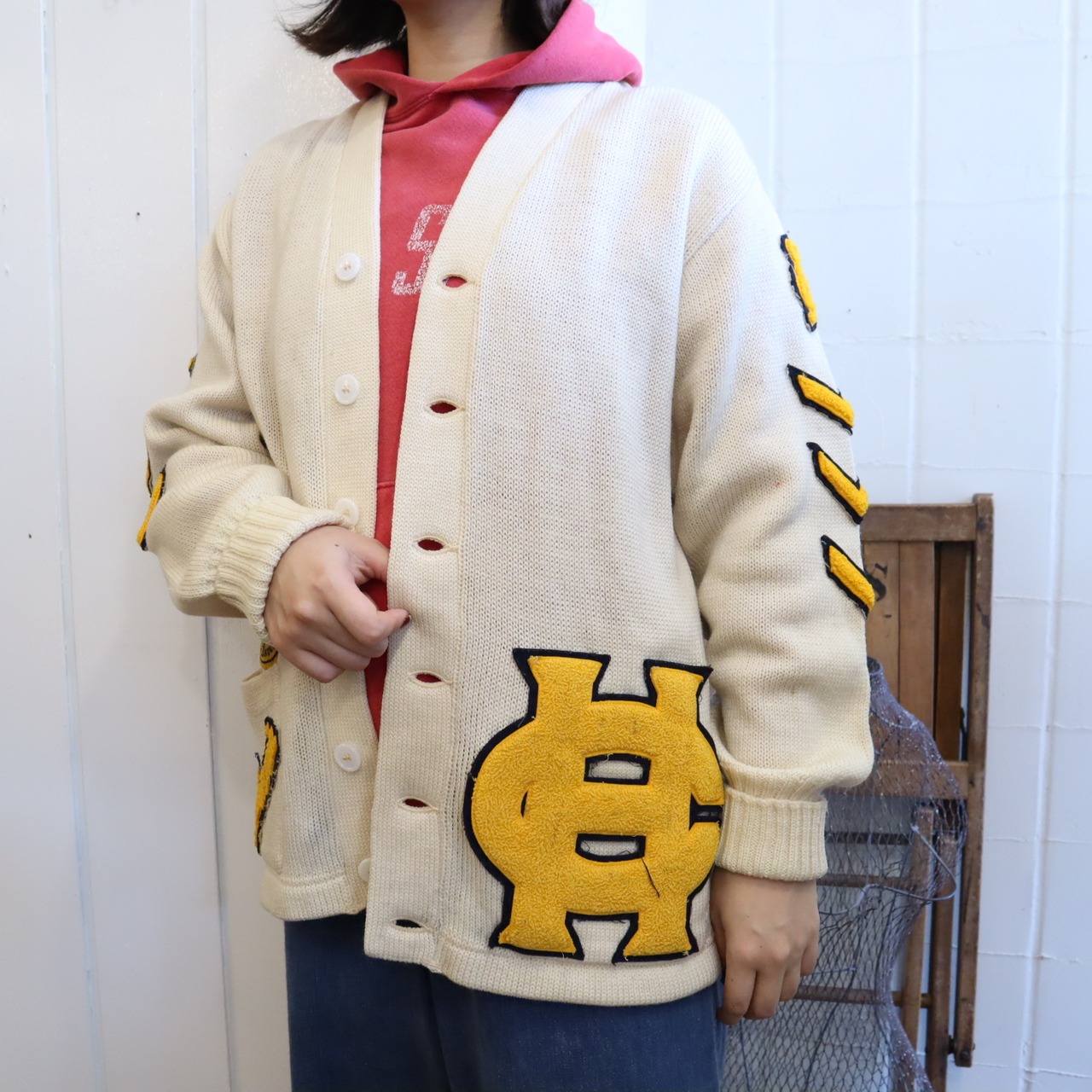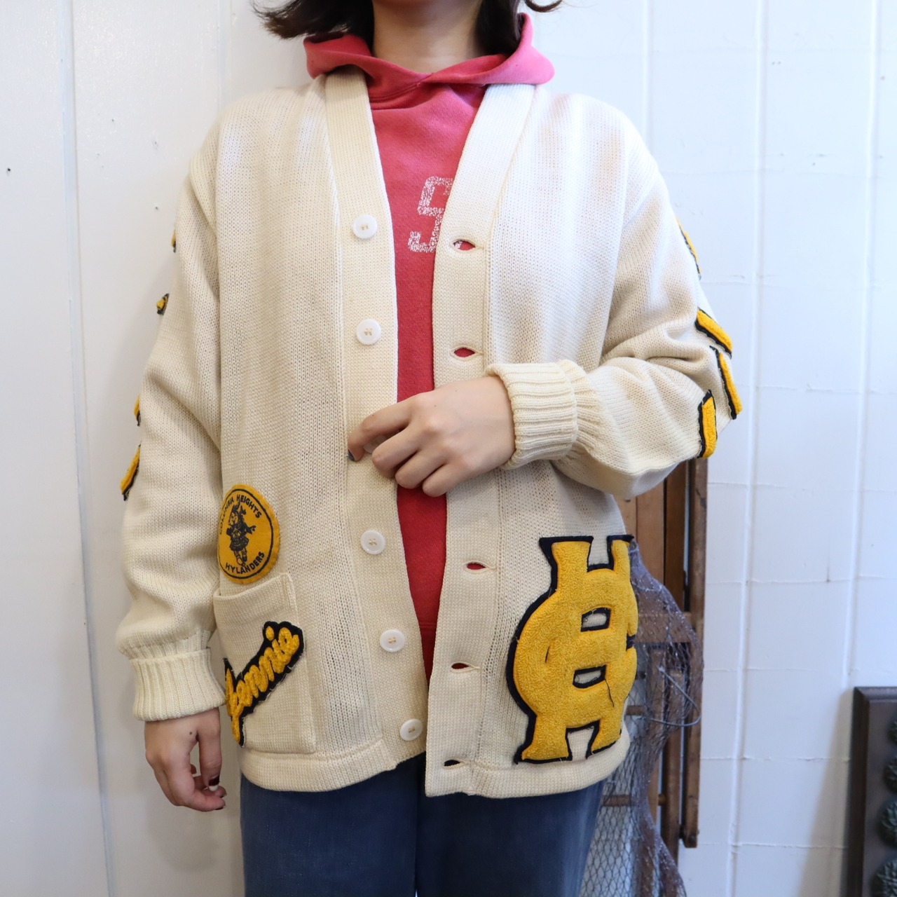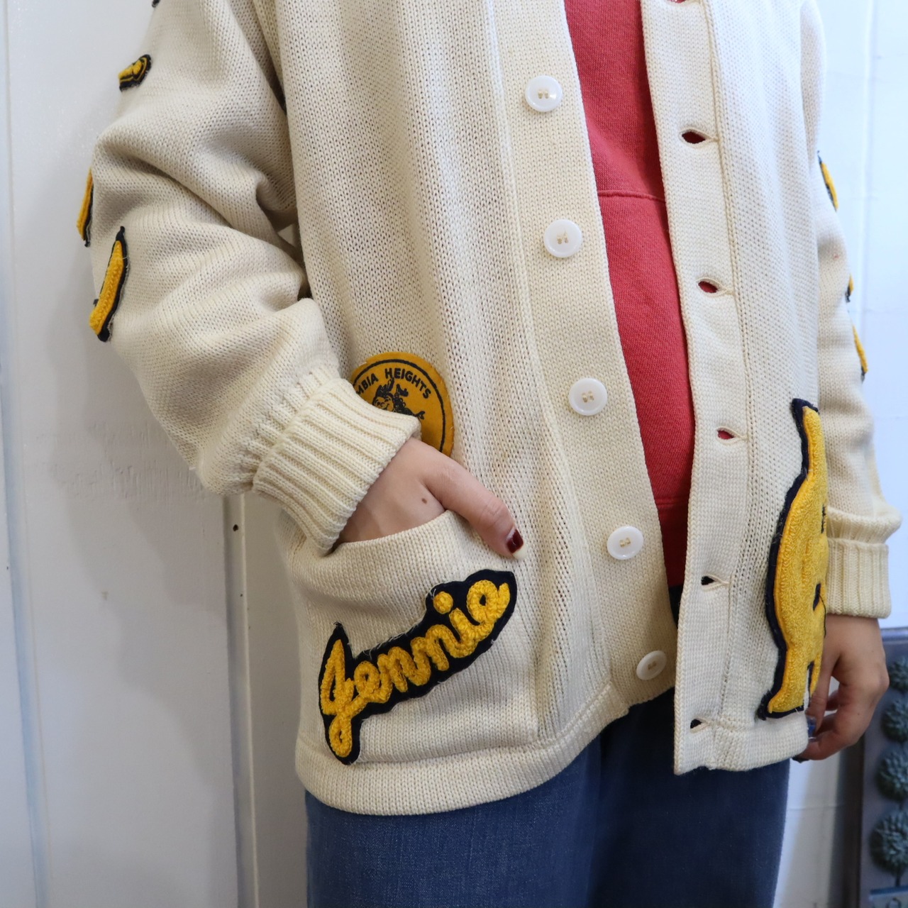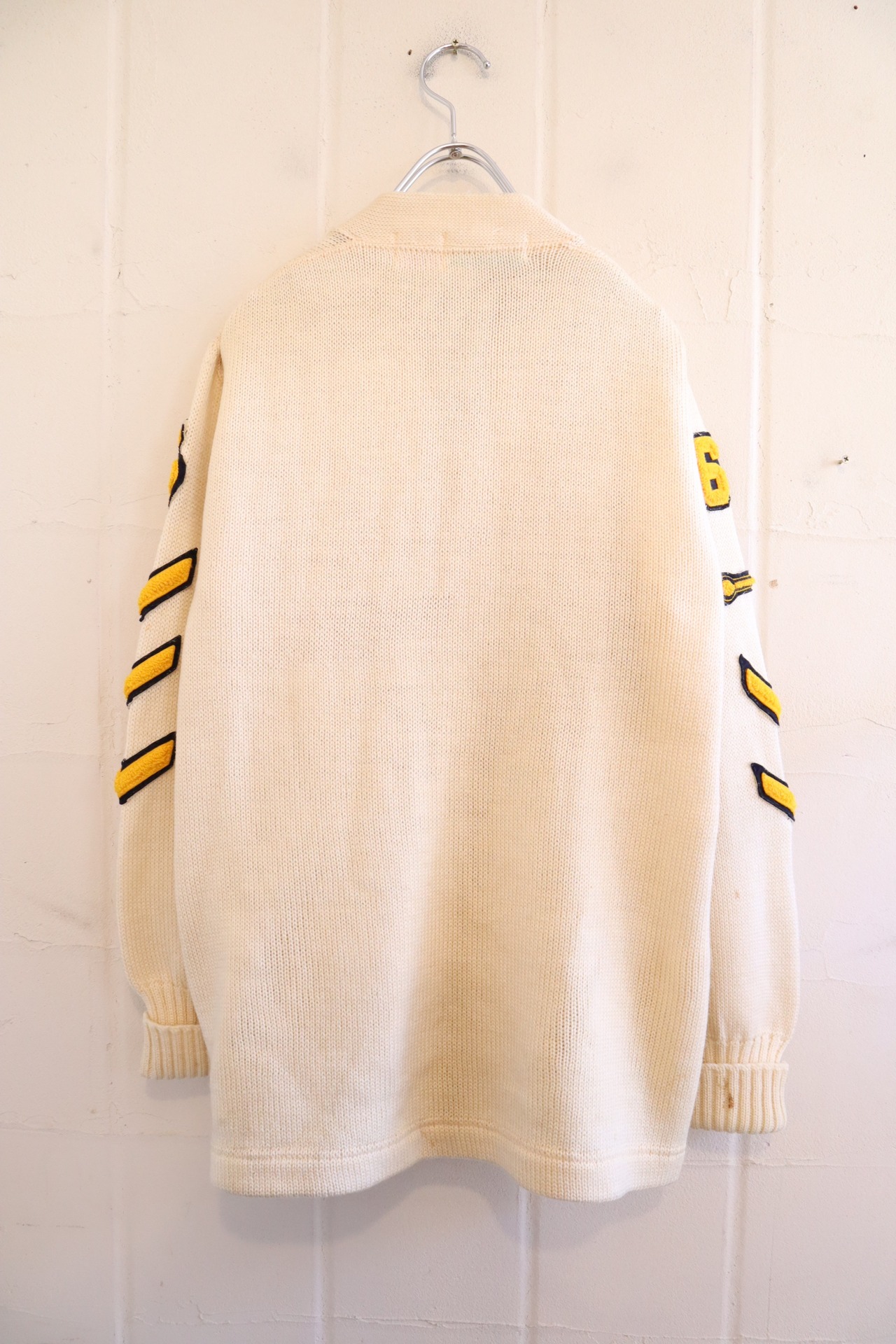 60s offwhite×yellow lettered wappen knit cardigan [l-1656]