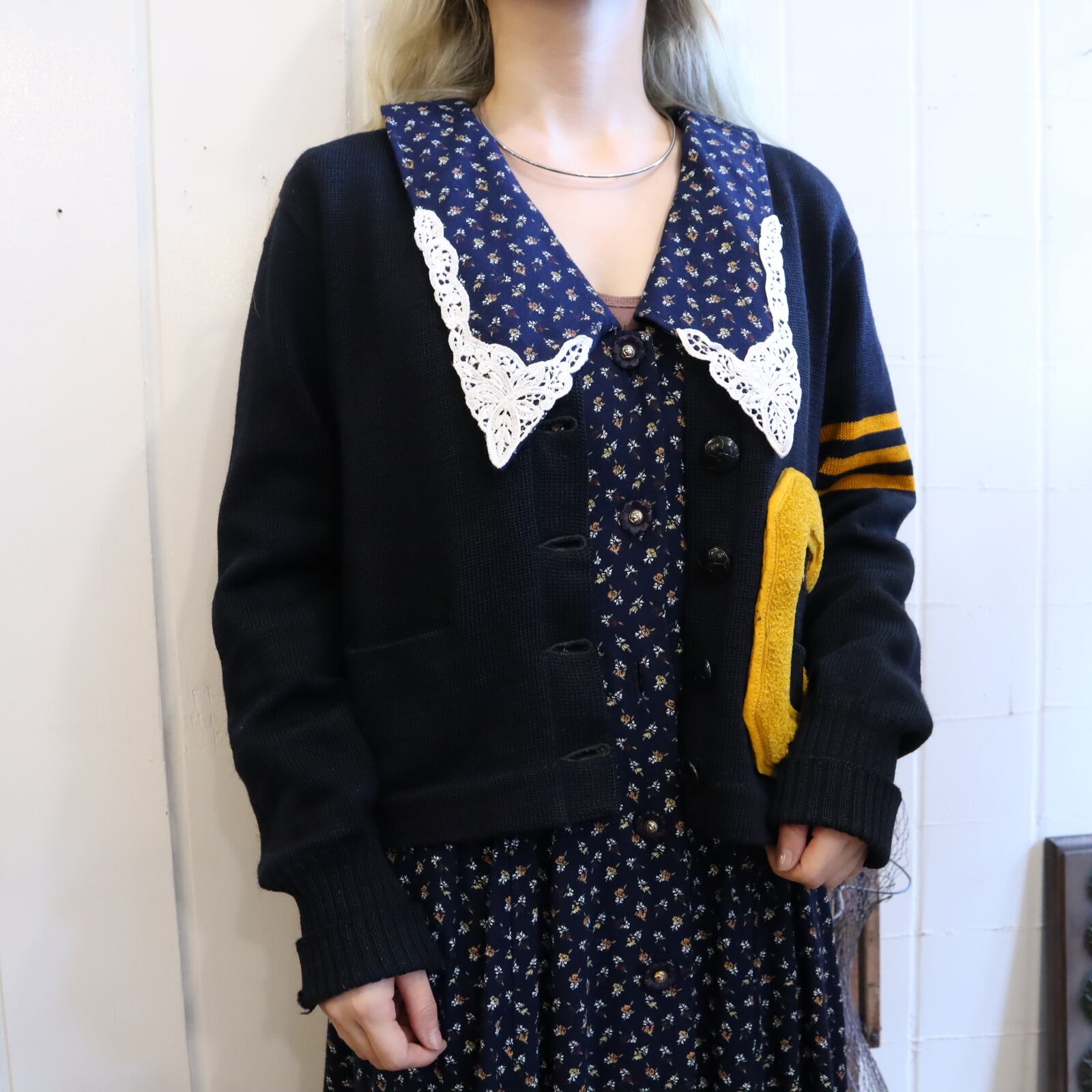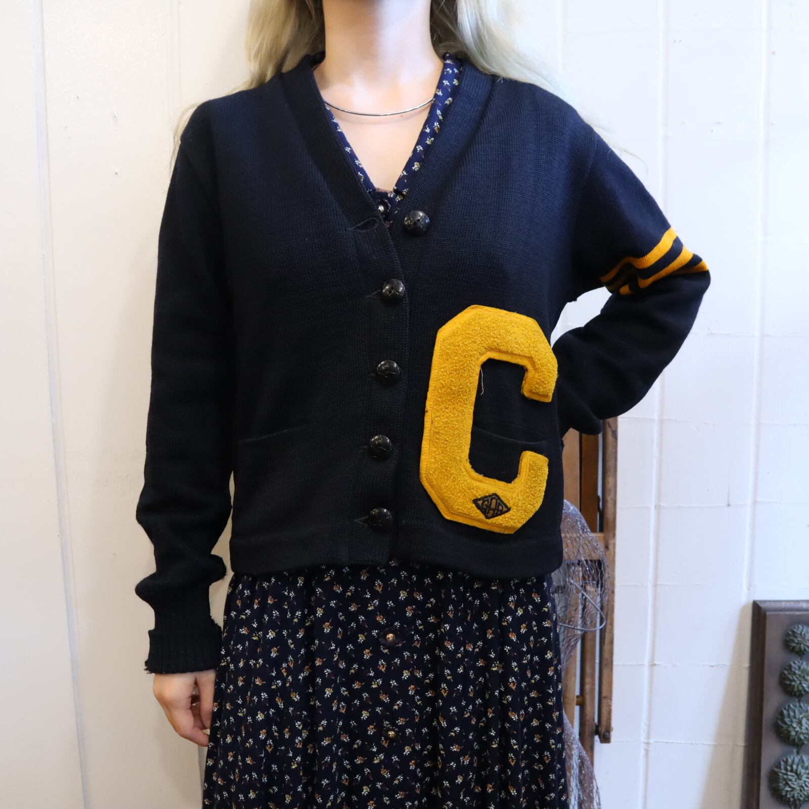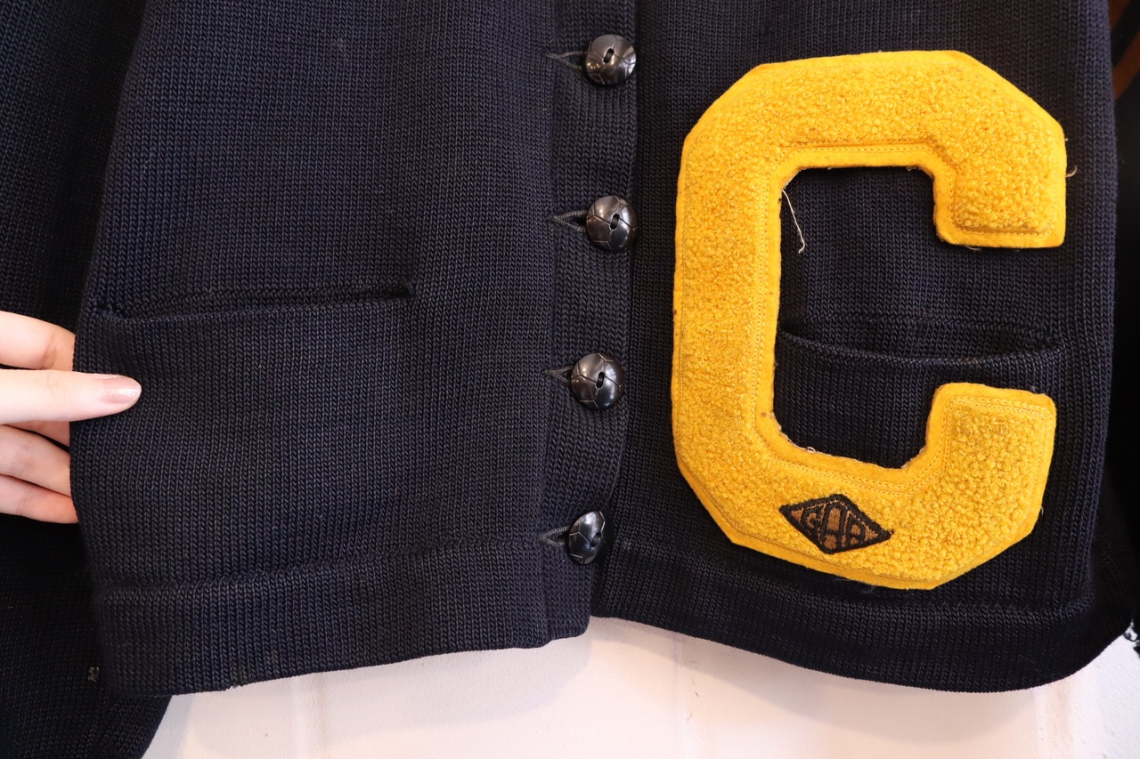50s darknavy×yellow lettered wappen knit cardigan [l-1658]