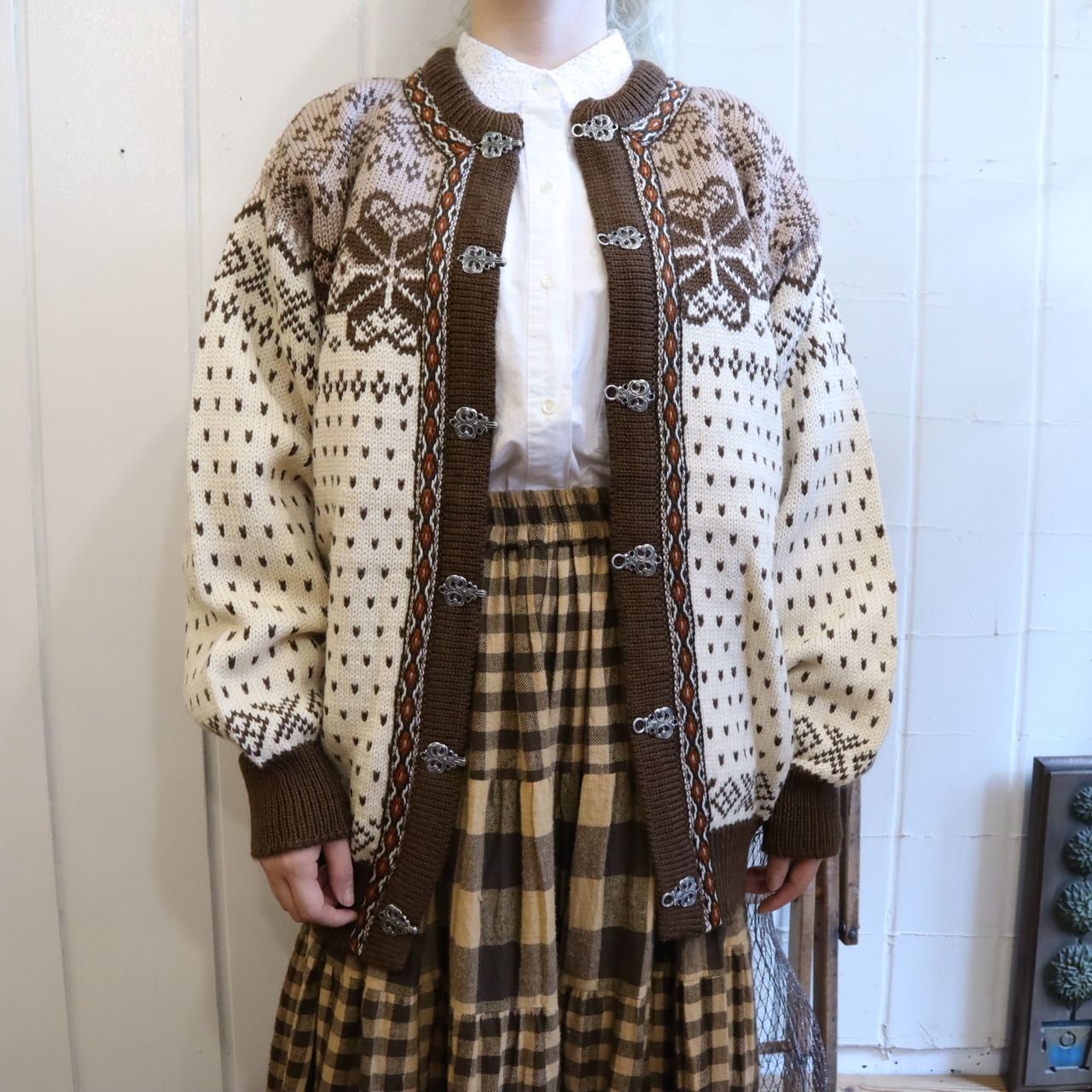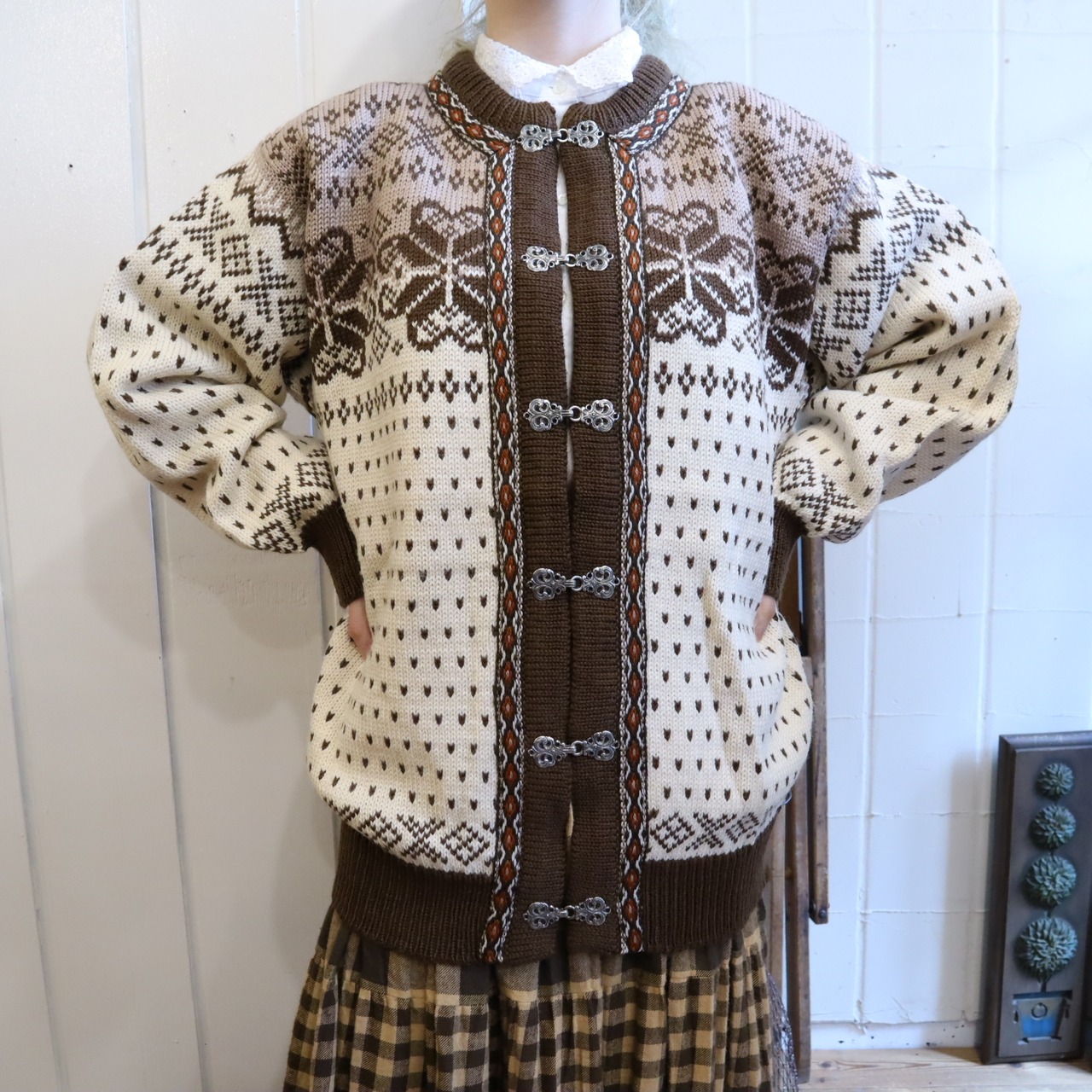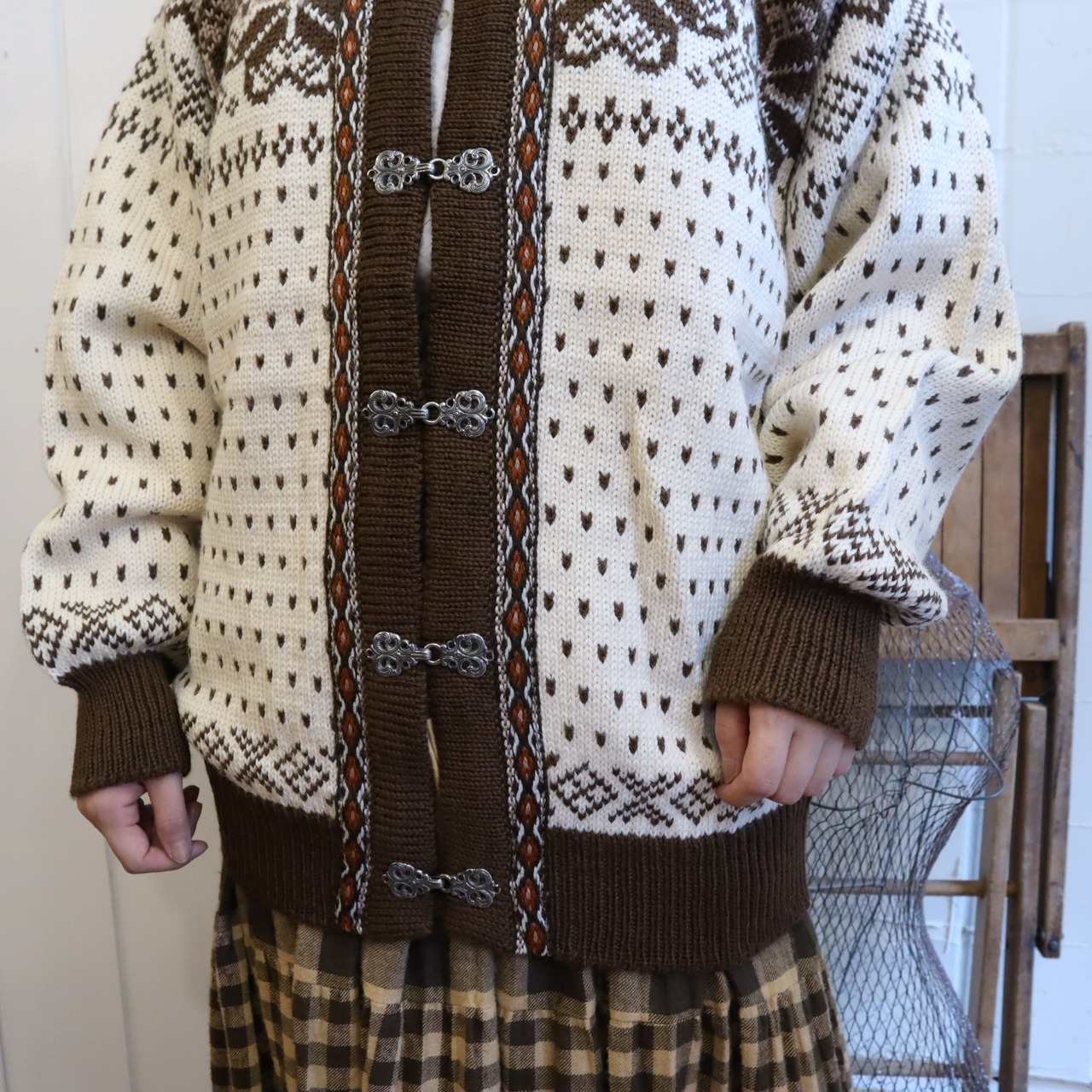金具フックやニットテープなどのディテール、ノルディック柄が可愛いニットカーディガン*