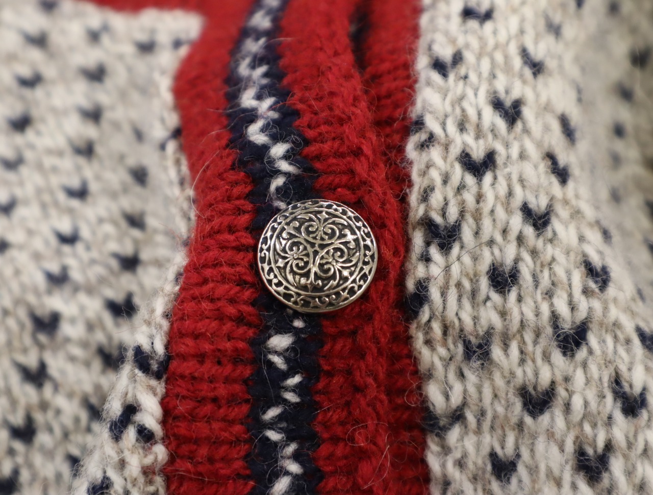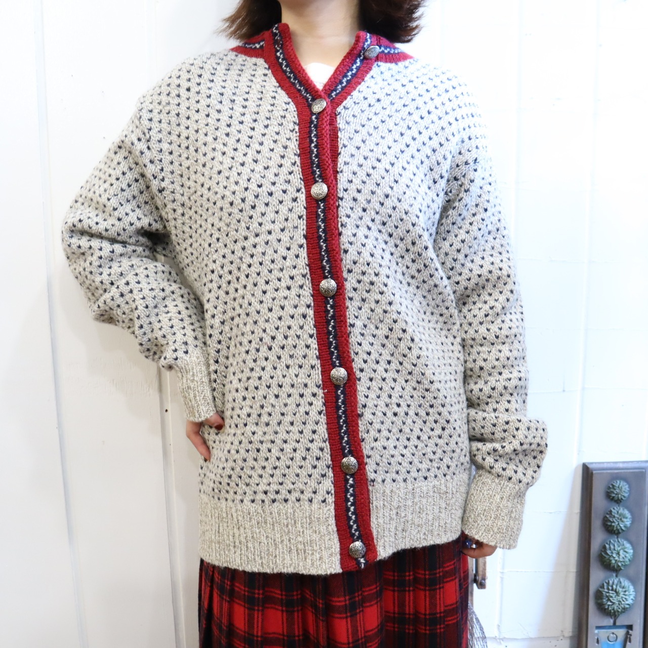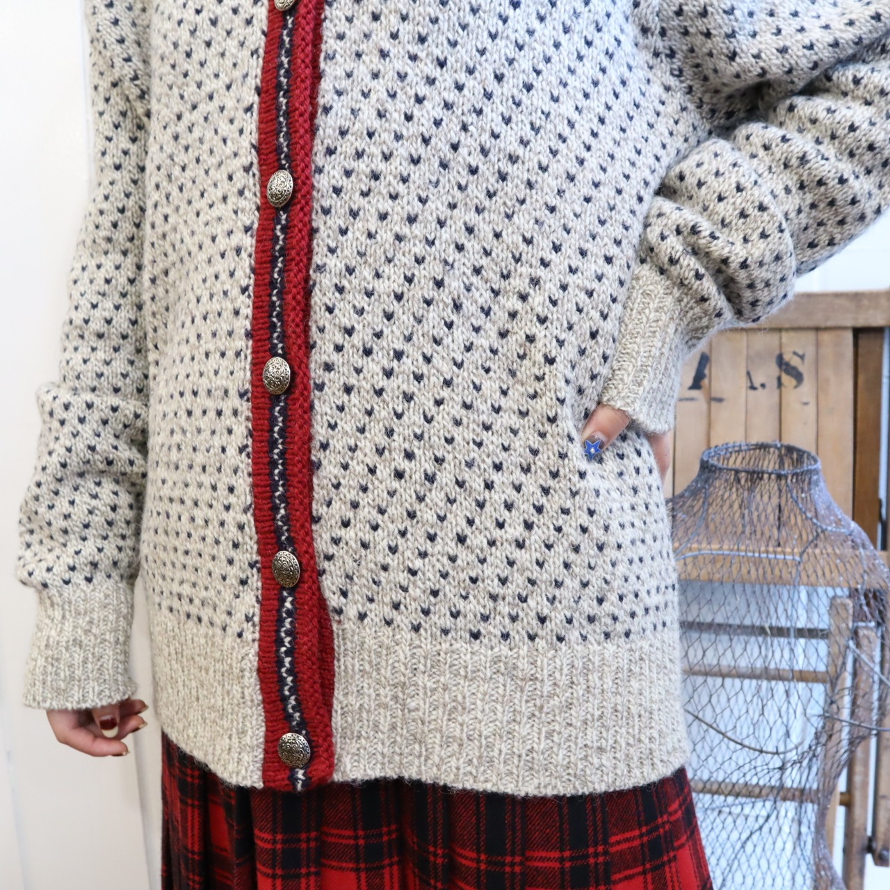 made in USA "L.L.Bean" beige×navy×red birdseye pattern knit cardigan [l-1717]