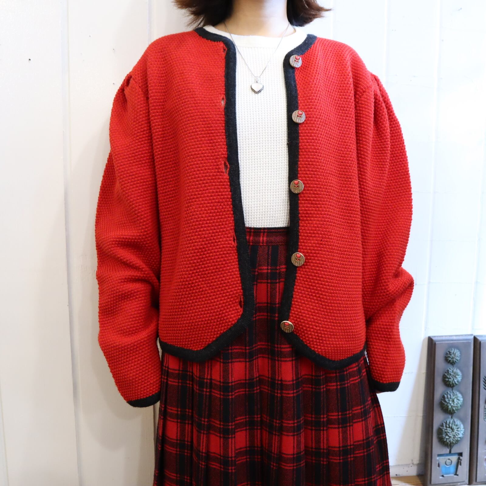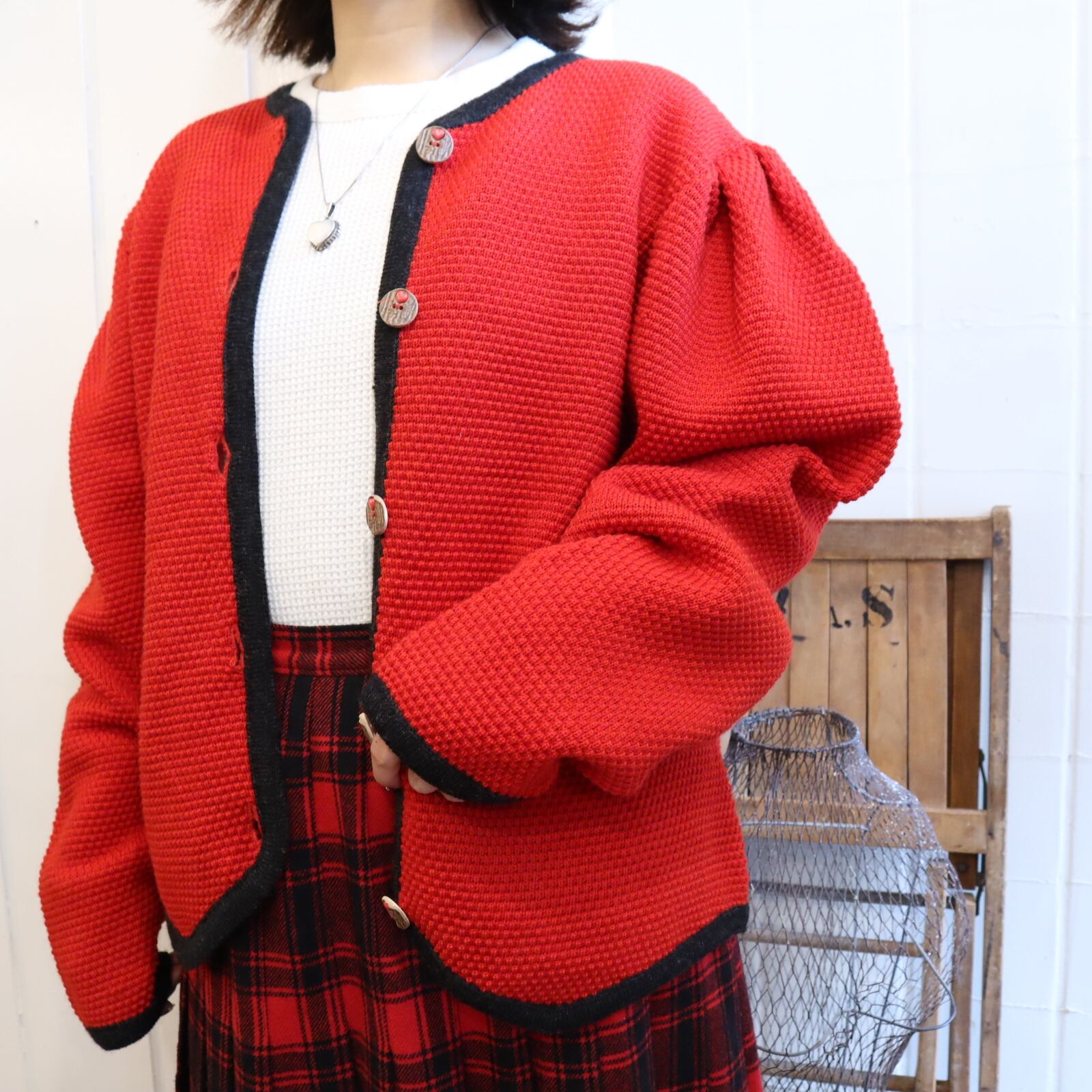 red×black piping puffsleeve tyrol knit cardigan [l-1728]