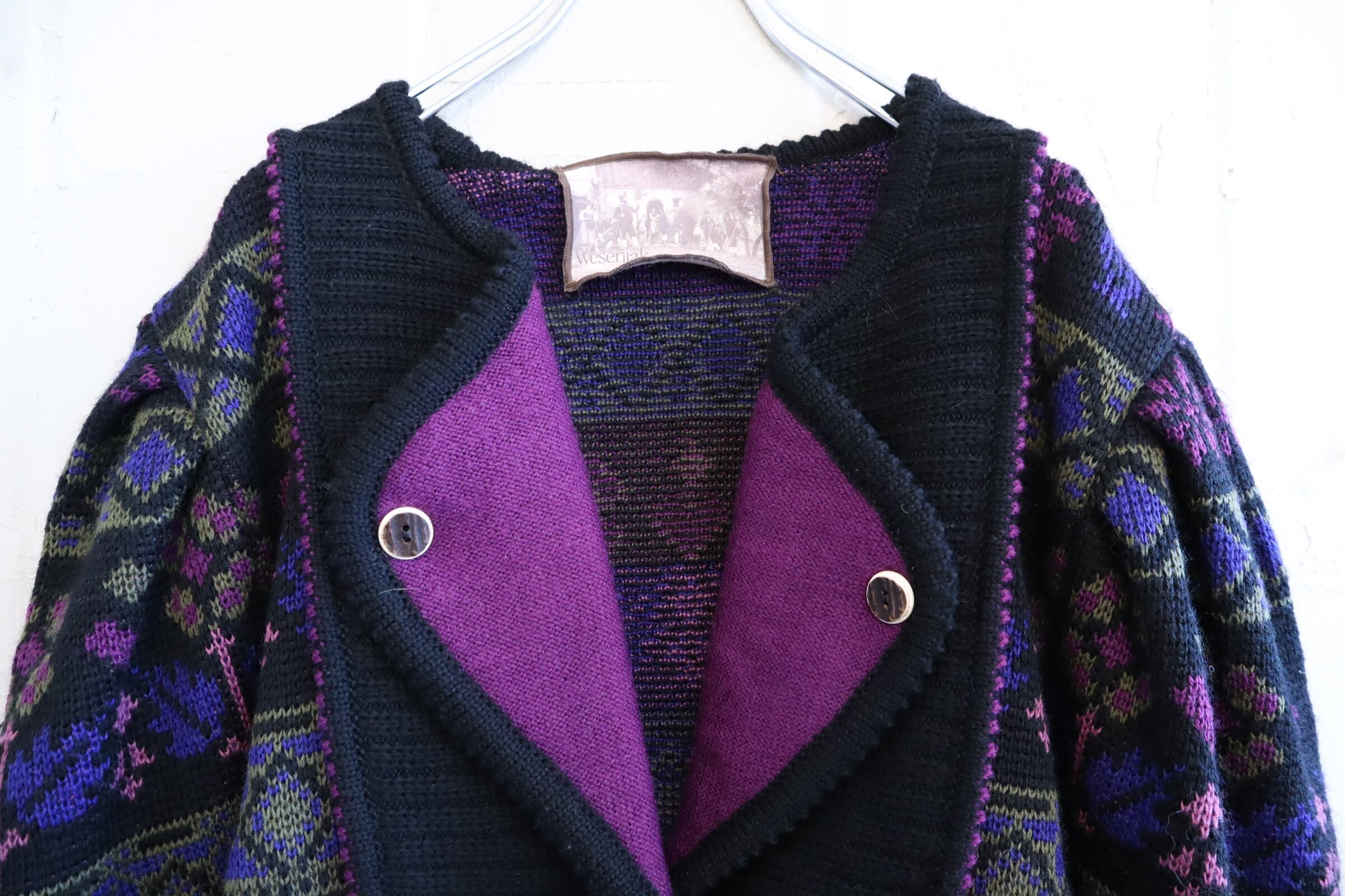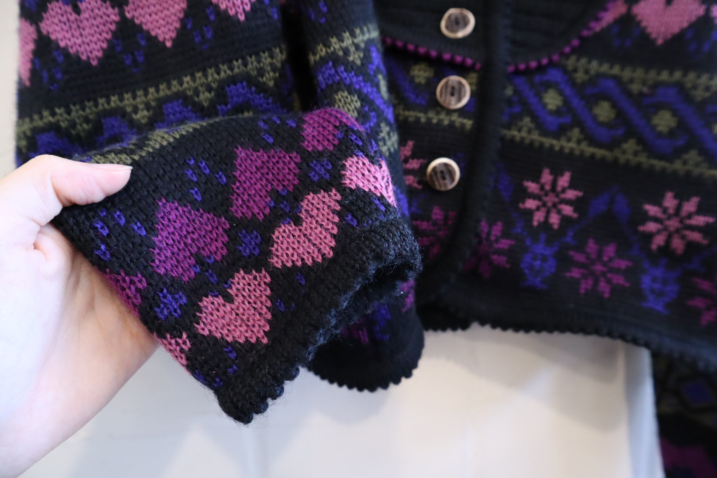 black×purple heart&snowflakes pattern puffsleeve knit cardigan [l-1729]