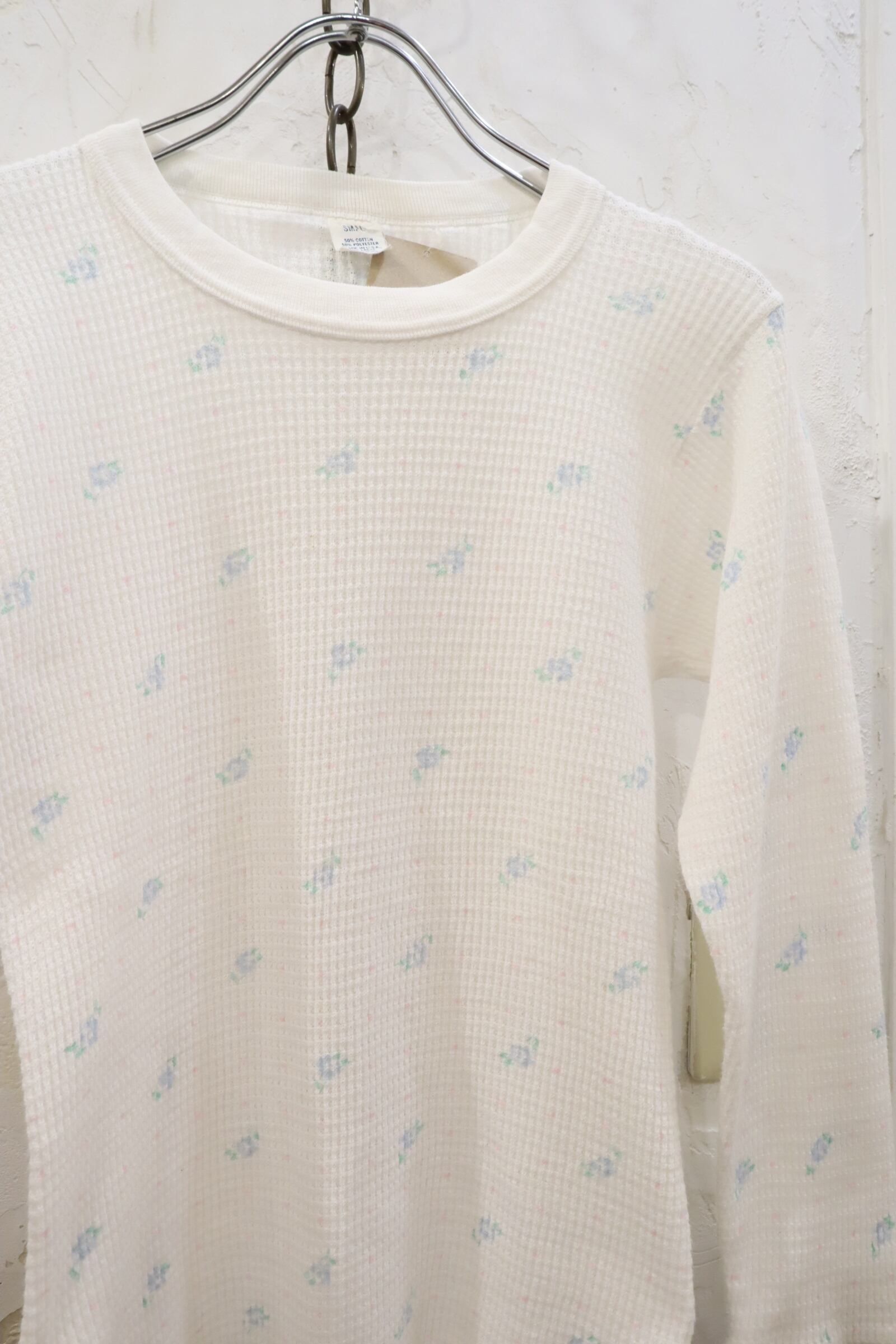 made in USA white×blue×green flower pattern thermal tops [l-1742]