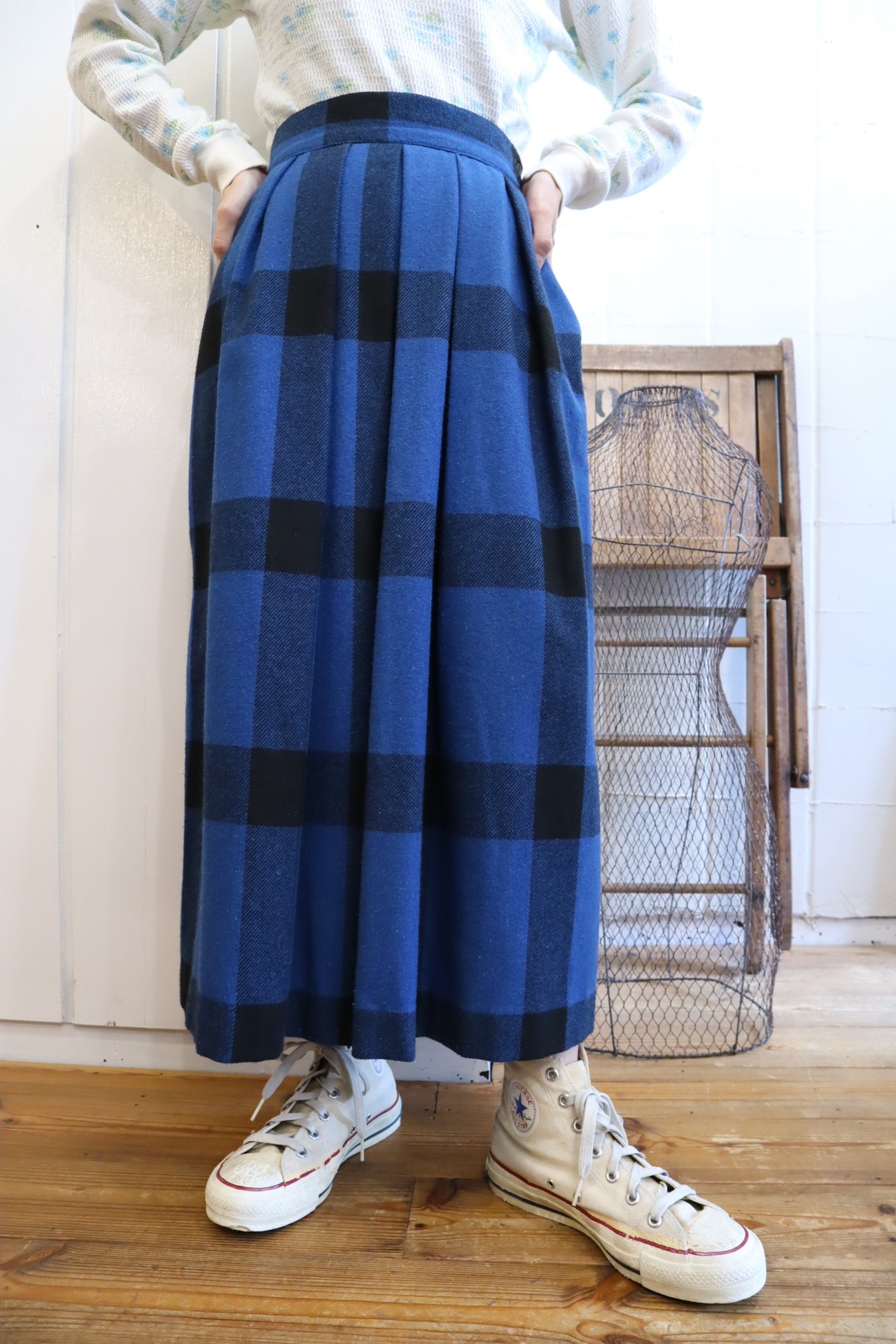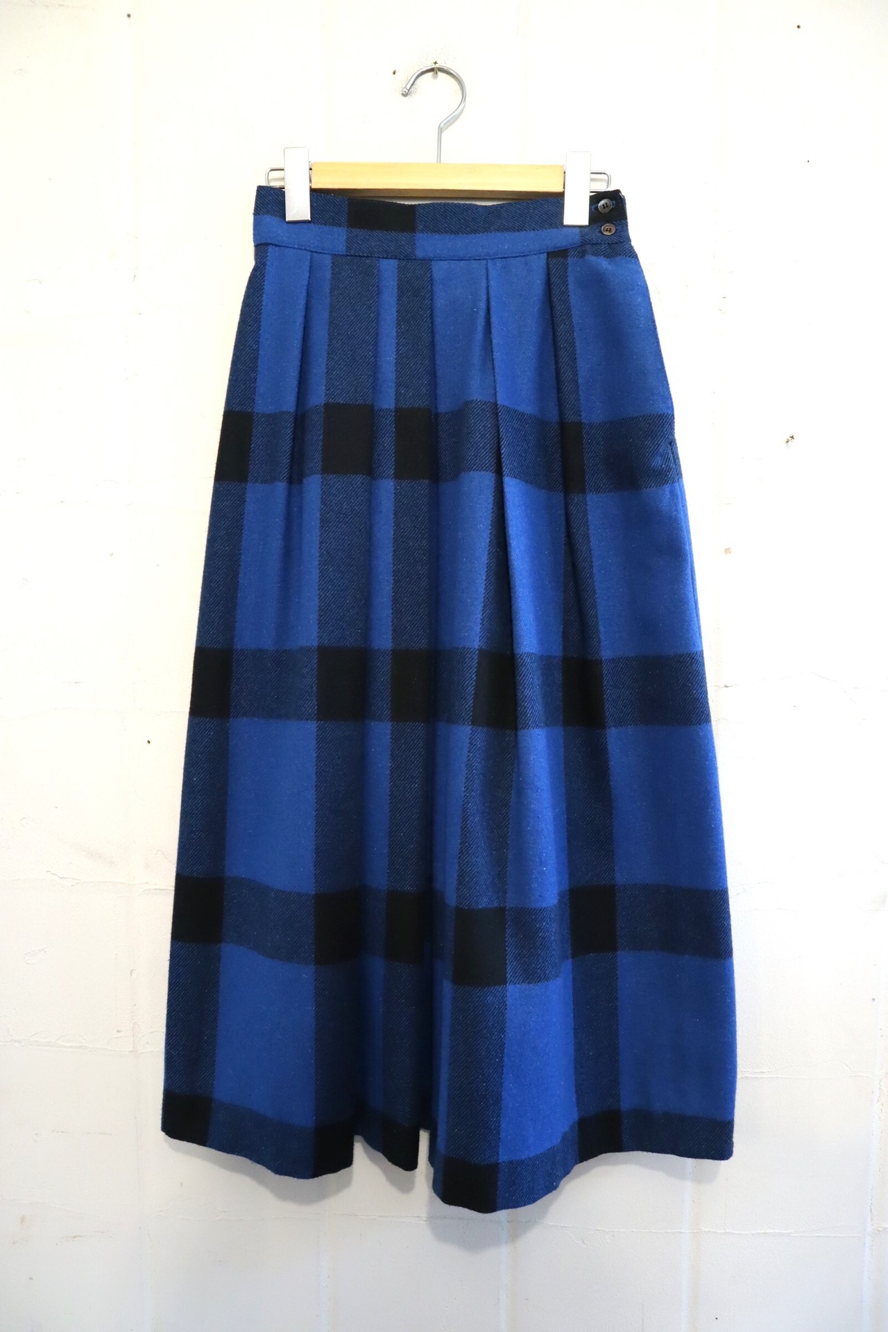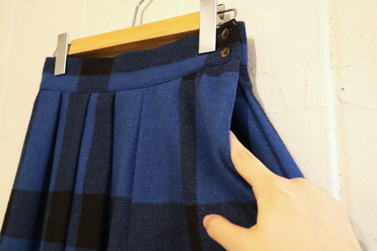 dull blue×black plaid pleats wool skirt [l-1767]