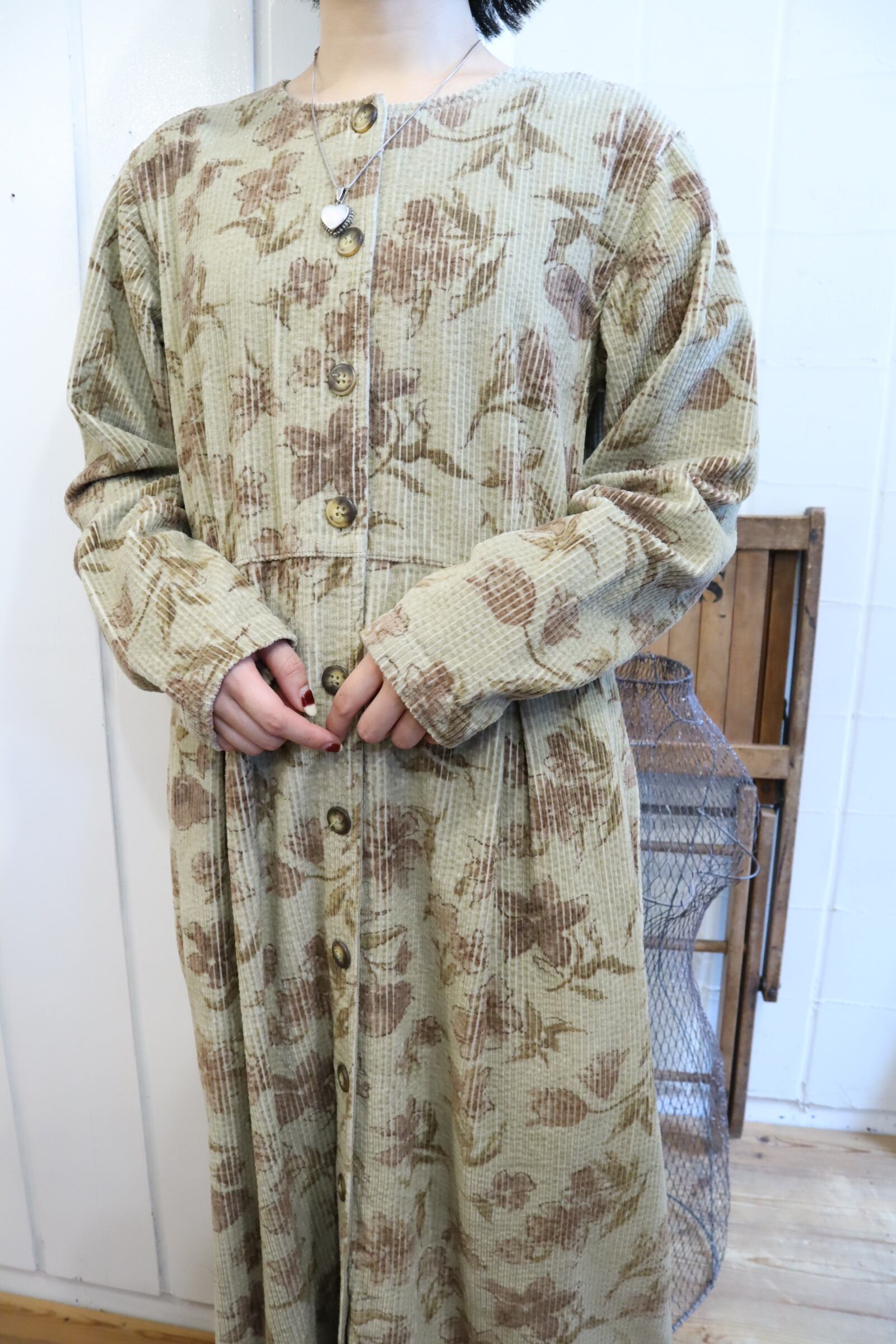 "Eddie Bauer" green beige×brown flower corduroy dress [l-1769]