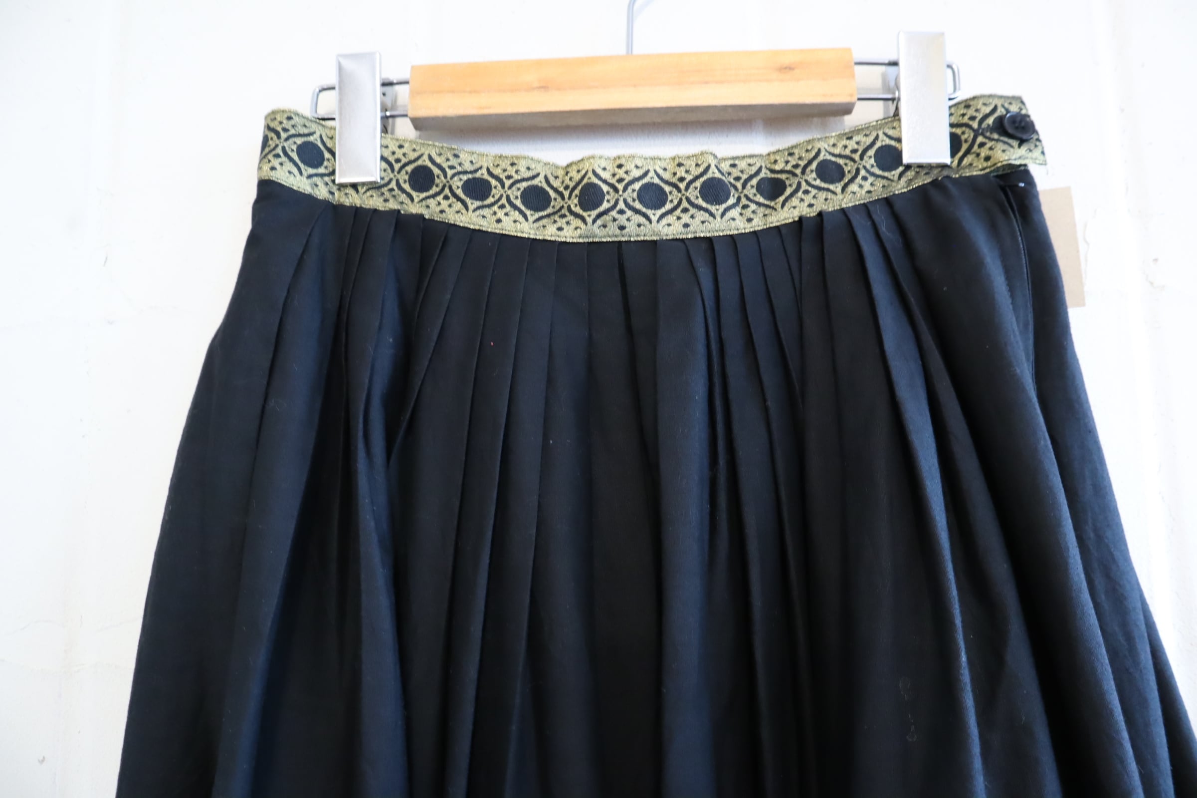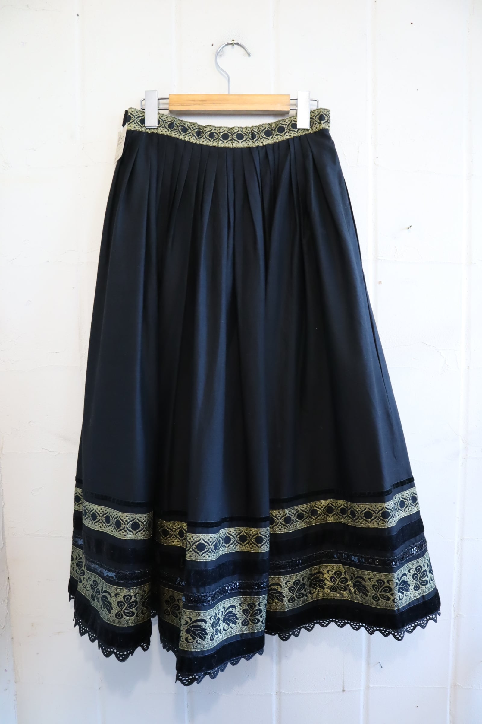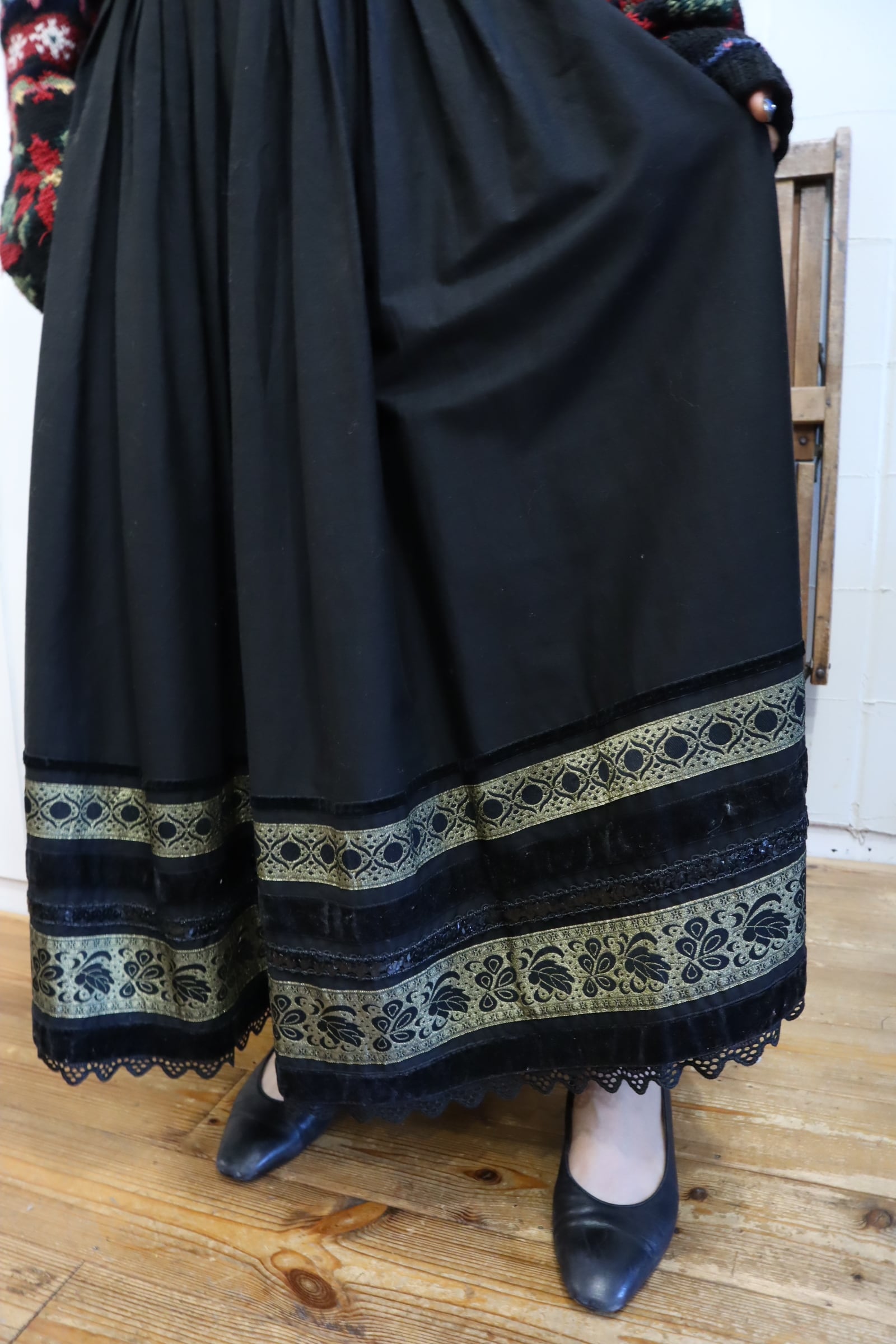 織りのようなゴールドのテープやベロア・スパンコールのテープが素敵なチロルスカートです。