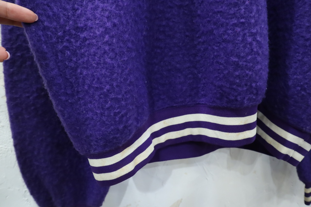 リブやワッペンの全体にシミ汚れ、一部毛羽立ちや生地の潰れがございますが、古着の味として着て頂けるかと思われます。