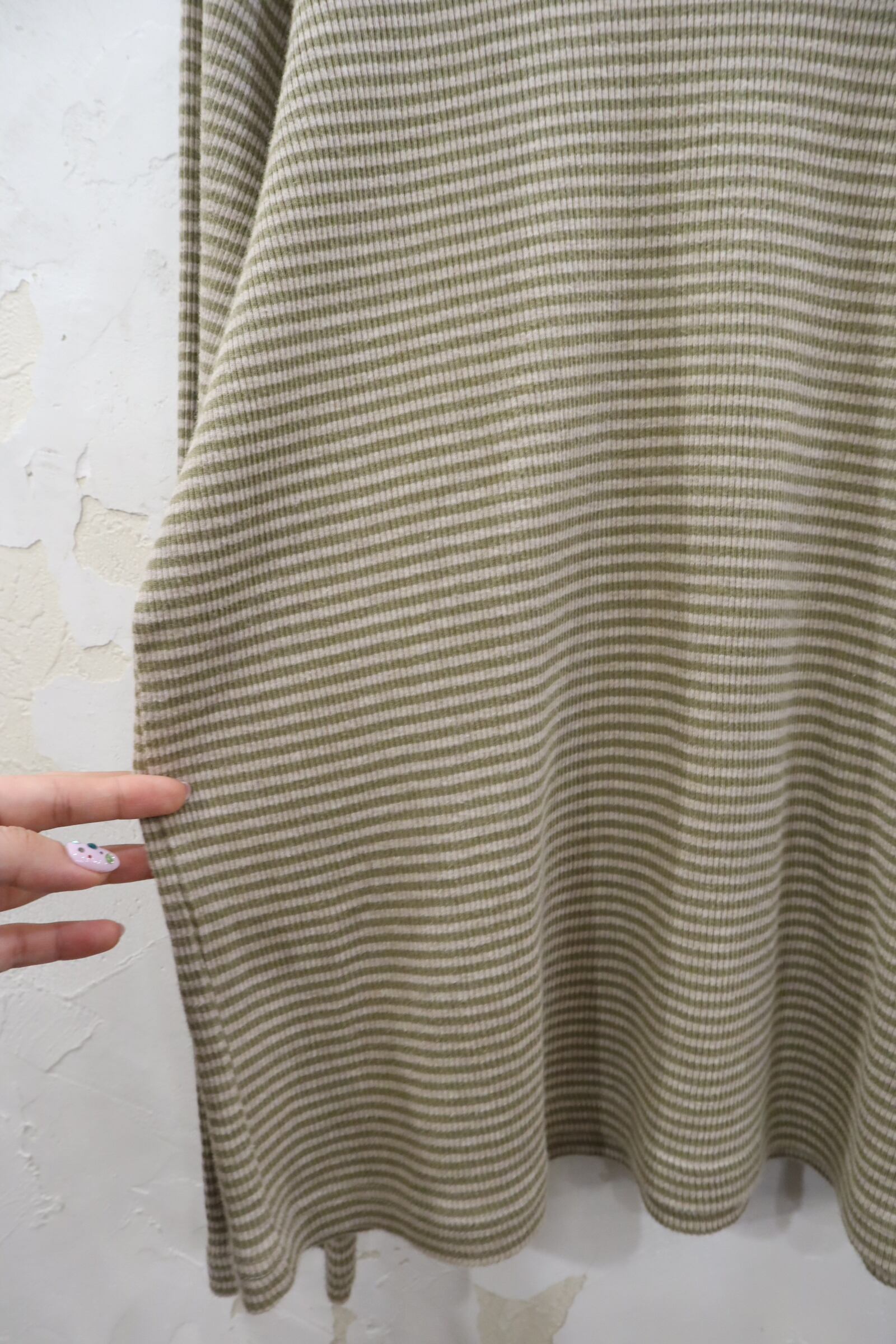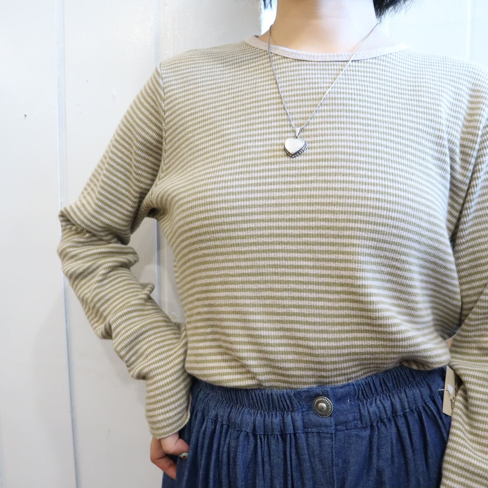 ”L.L.Bean” beige×green border cotton thermal tops [l-1859]