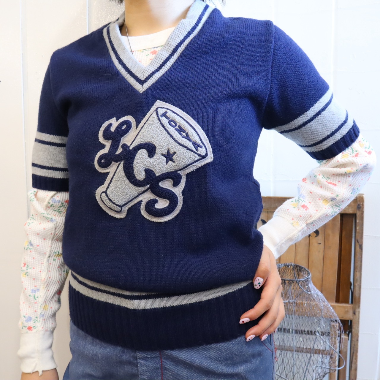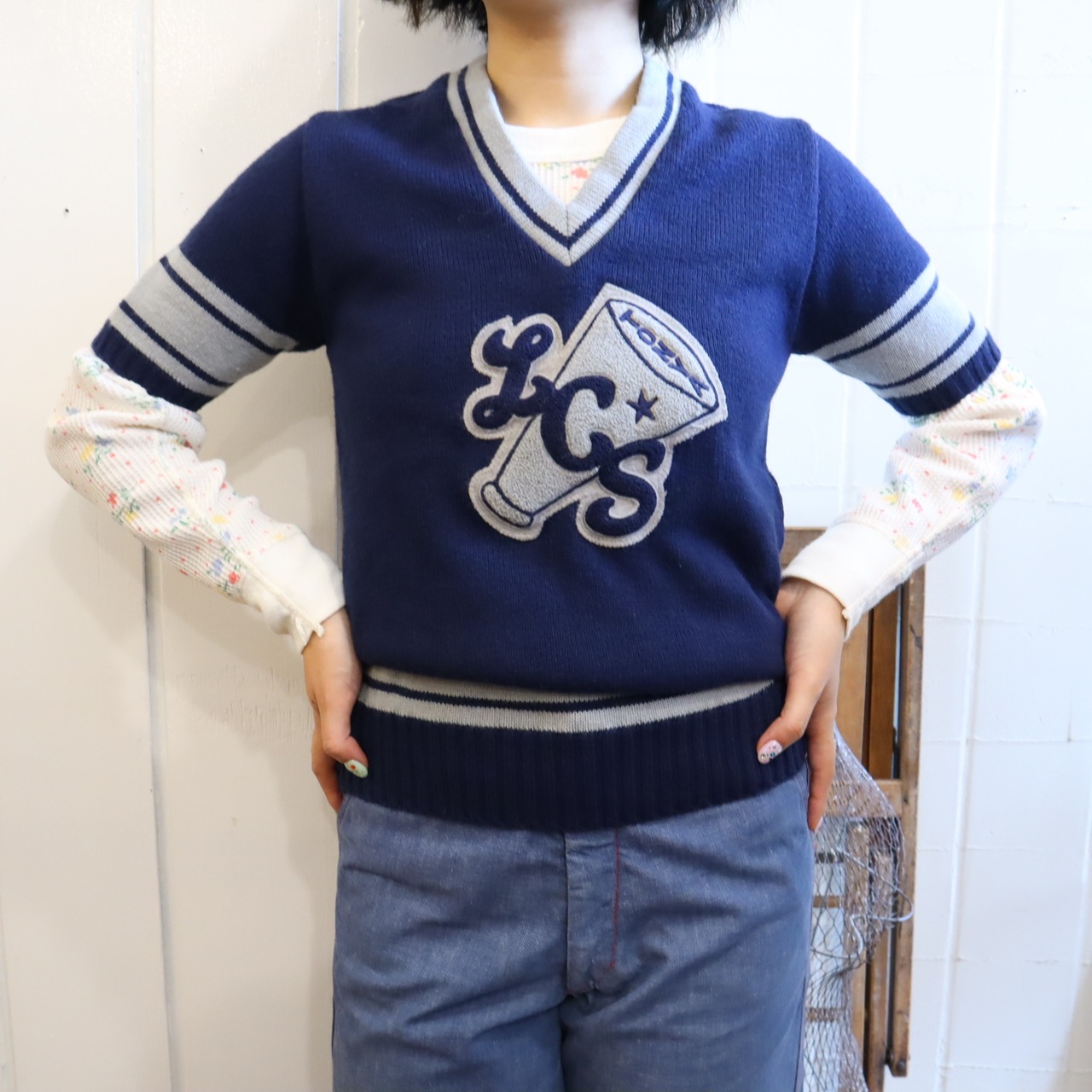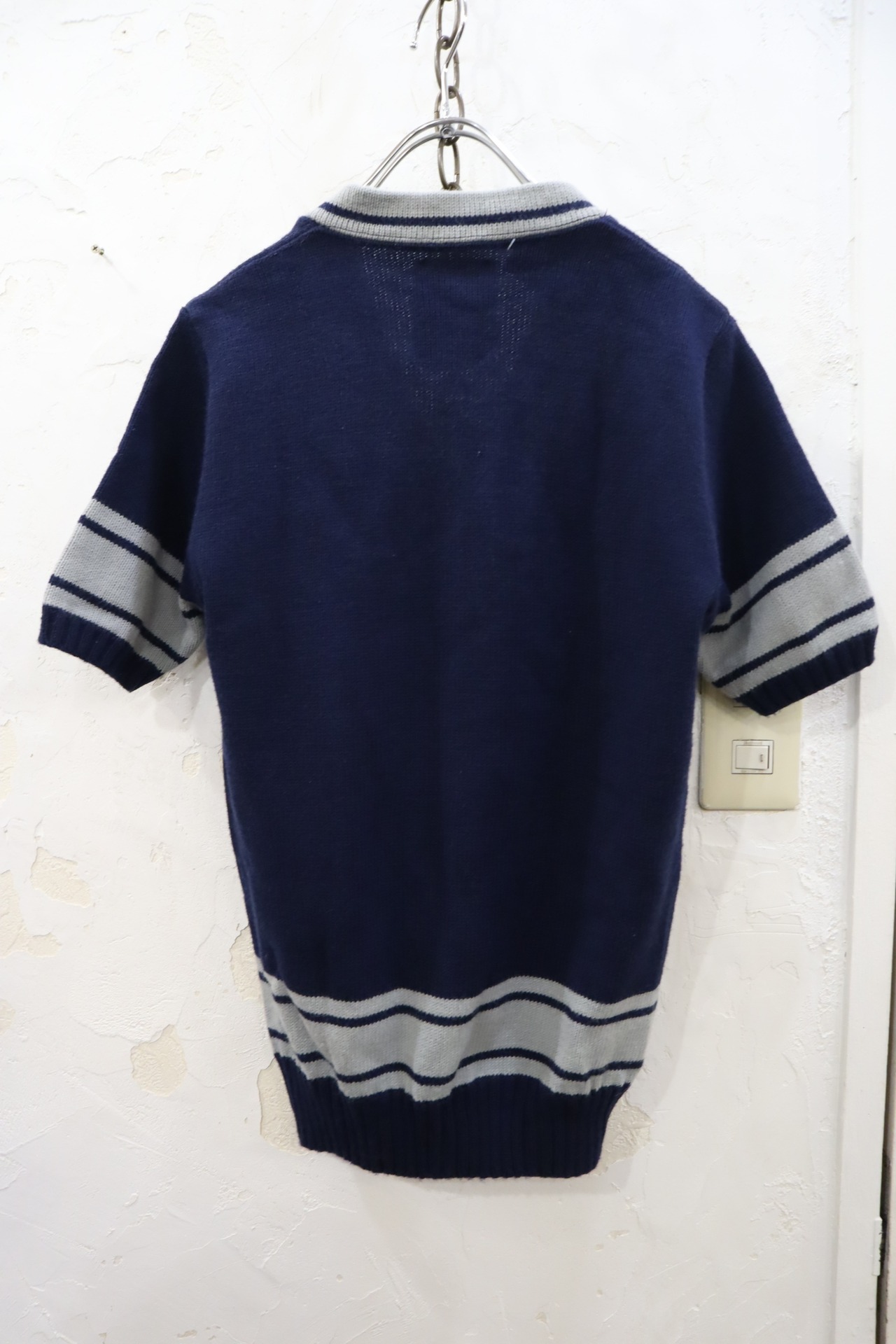 70-80s navy×gray short sleeve lettered knit pullover [l-1879]