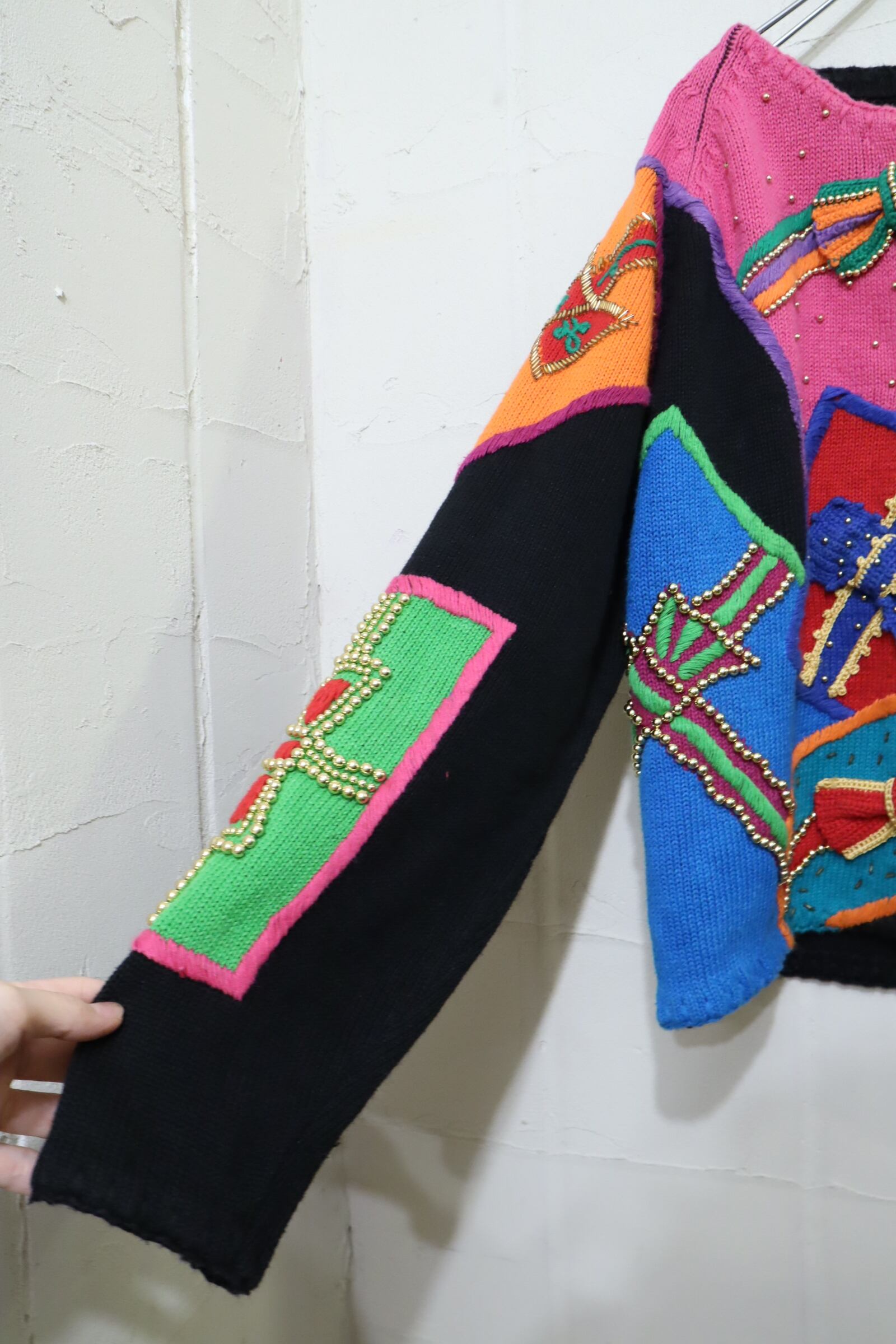 "Michael Simon" black×colorful present beads cotton knit cardigan [l-1893]