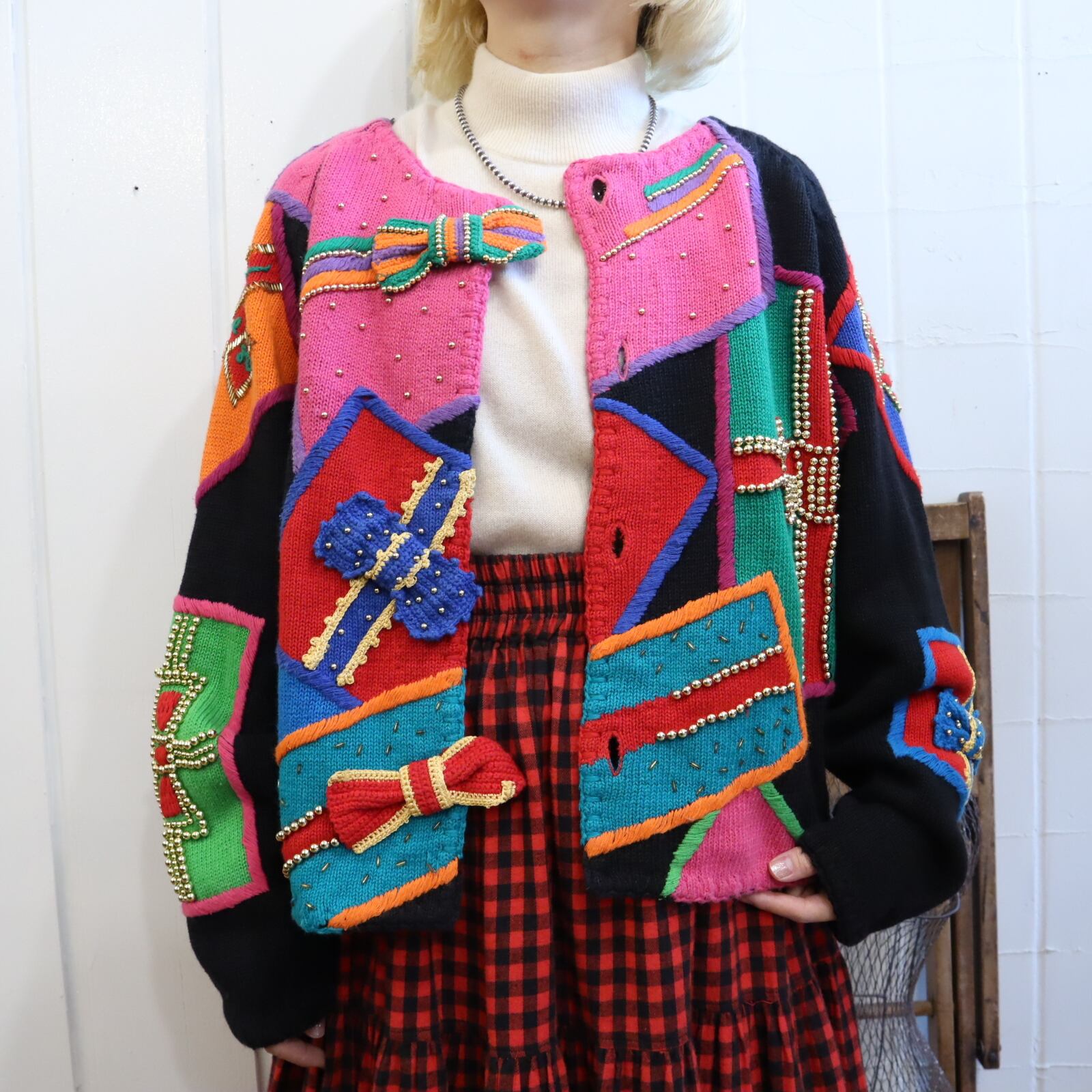 クリスマスを連想させるカラフルなプレゼントが可愛いコットンニットカーディガン♡