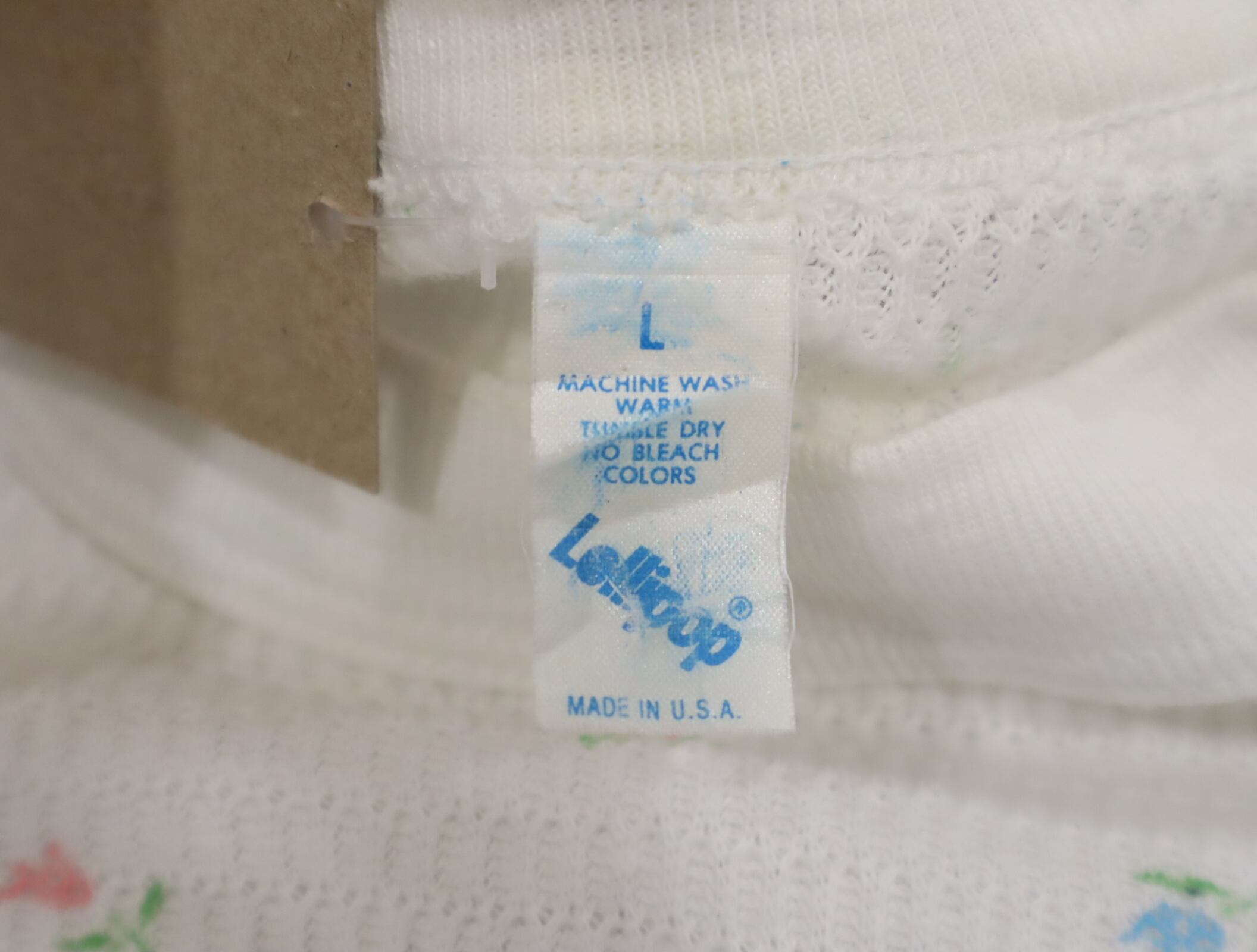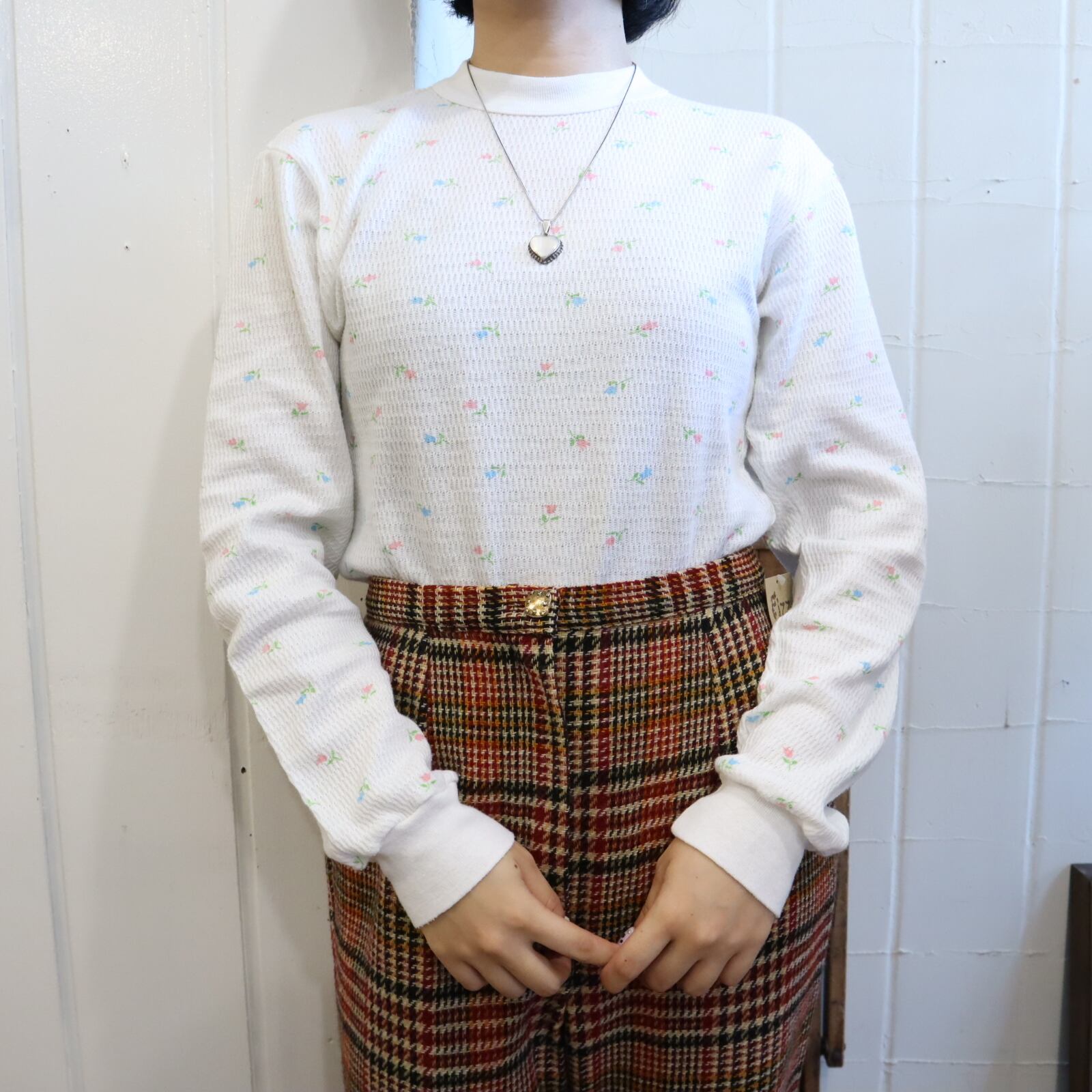 made in USA white×pink×blue flower pattern thermal tops [l-1894]