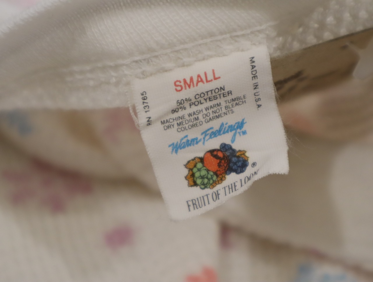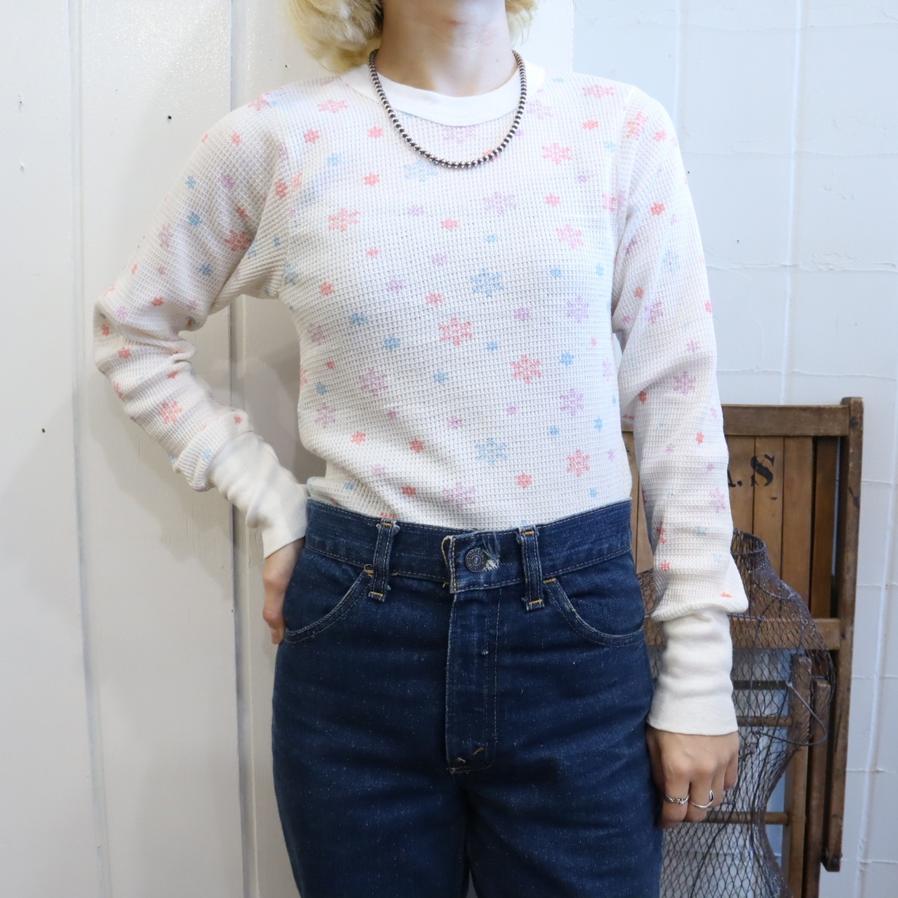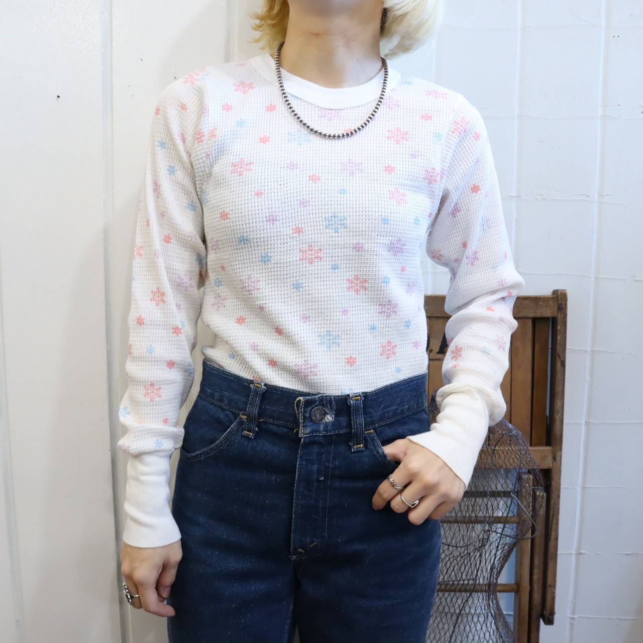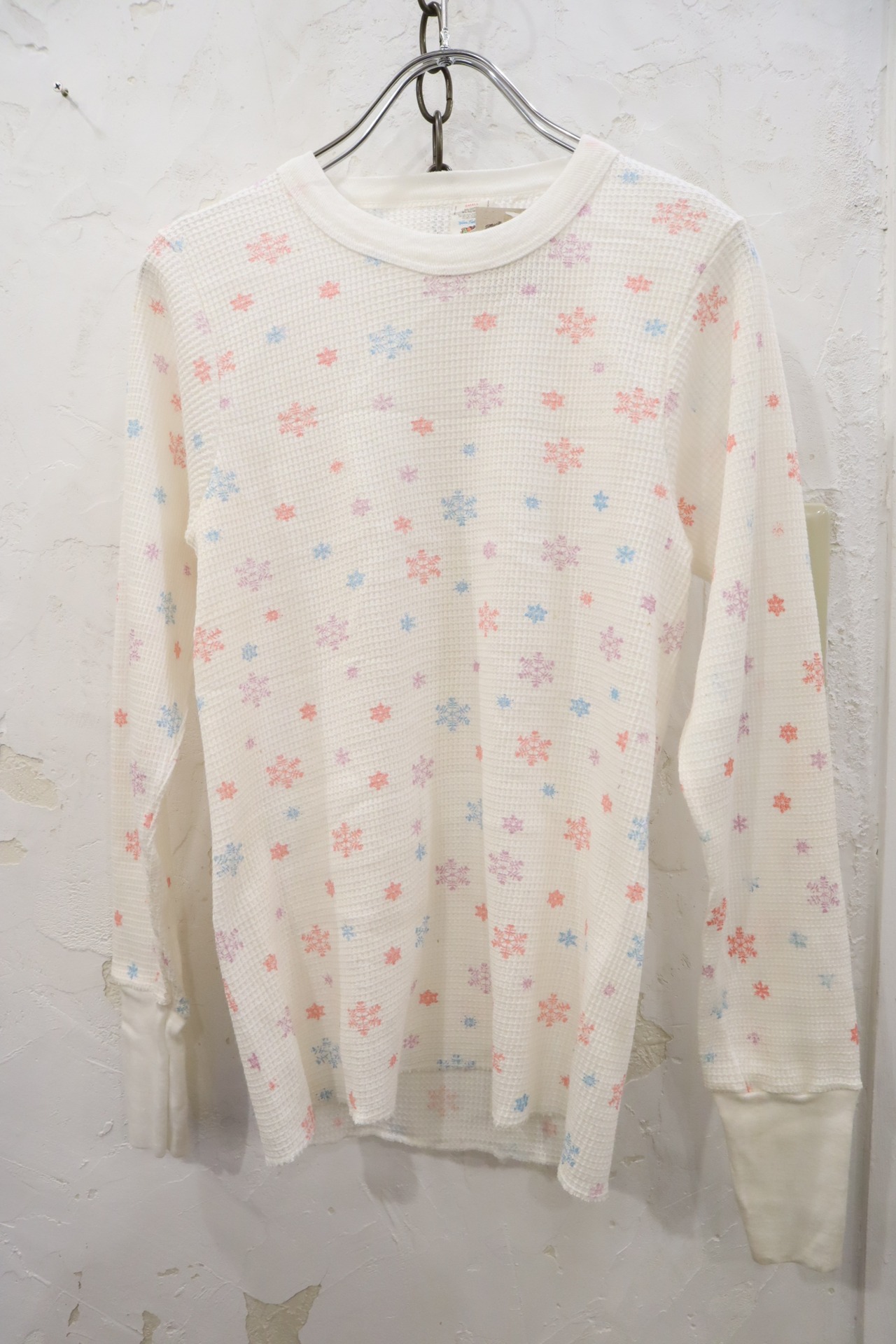made in USA"FRUIT OF THE LOOM" white×pink×purple snowflakes pattern thermal tops [l-1895]