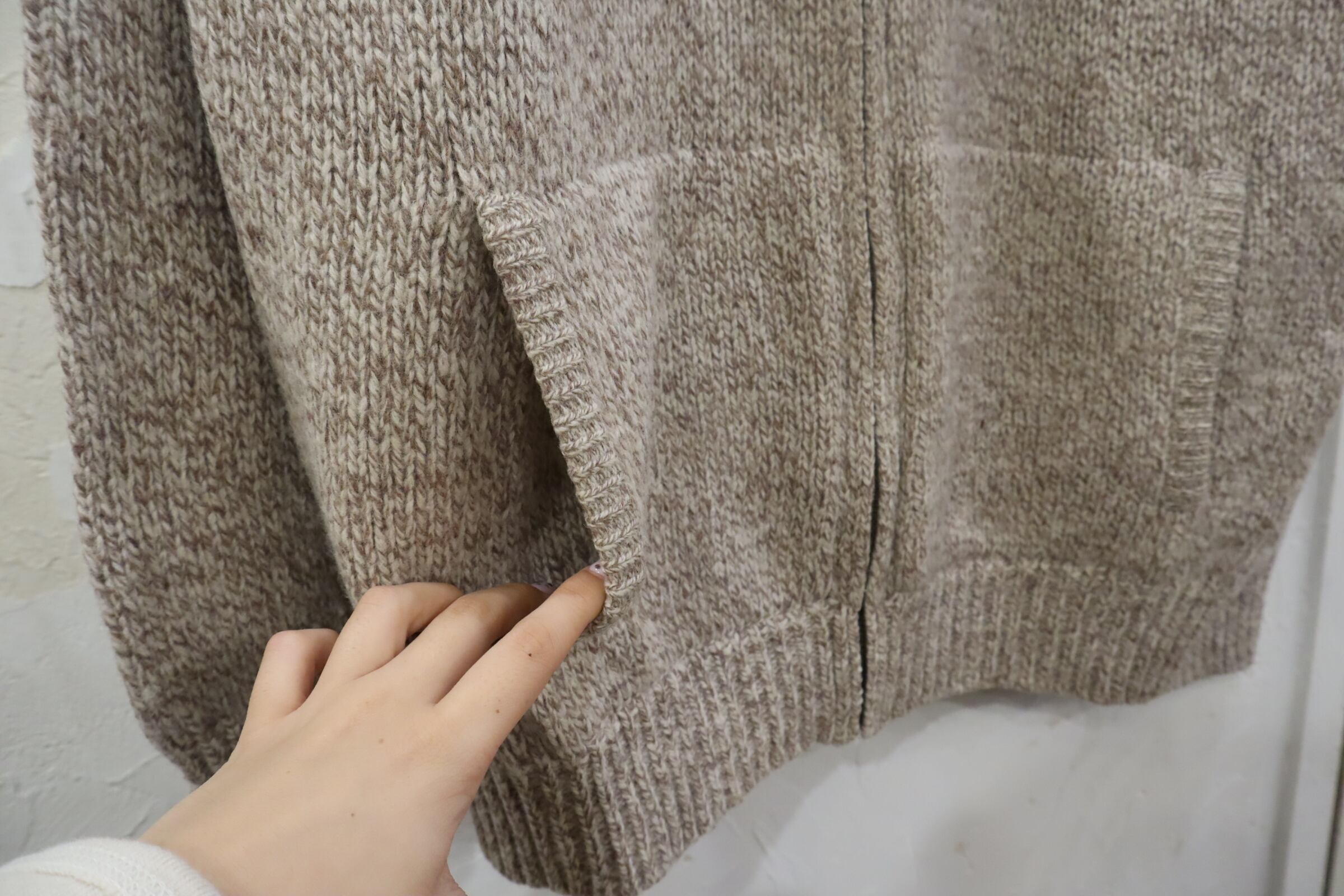 ブラウンとホワイトの混ざったカラーリングが可愛いニットカーディガン。