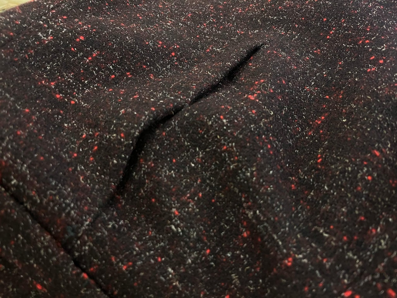 後ろ側真ん中の縫い目にホツレ、ホツレにより少し滑脱が見受けられます。