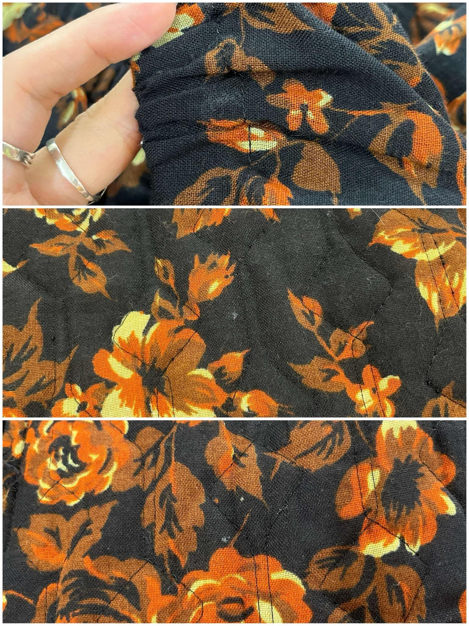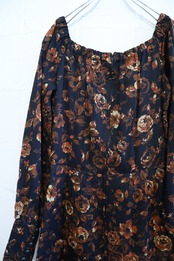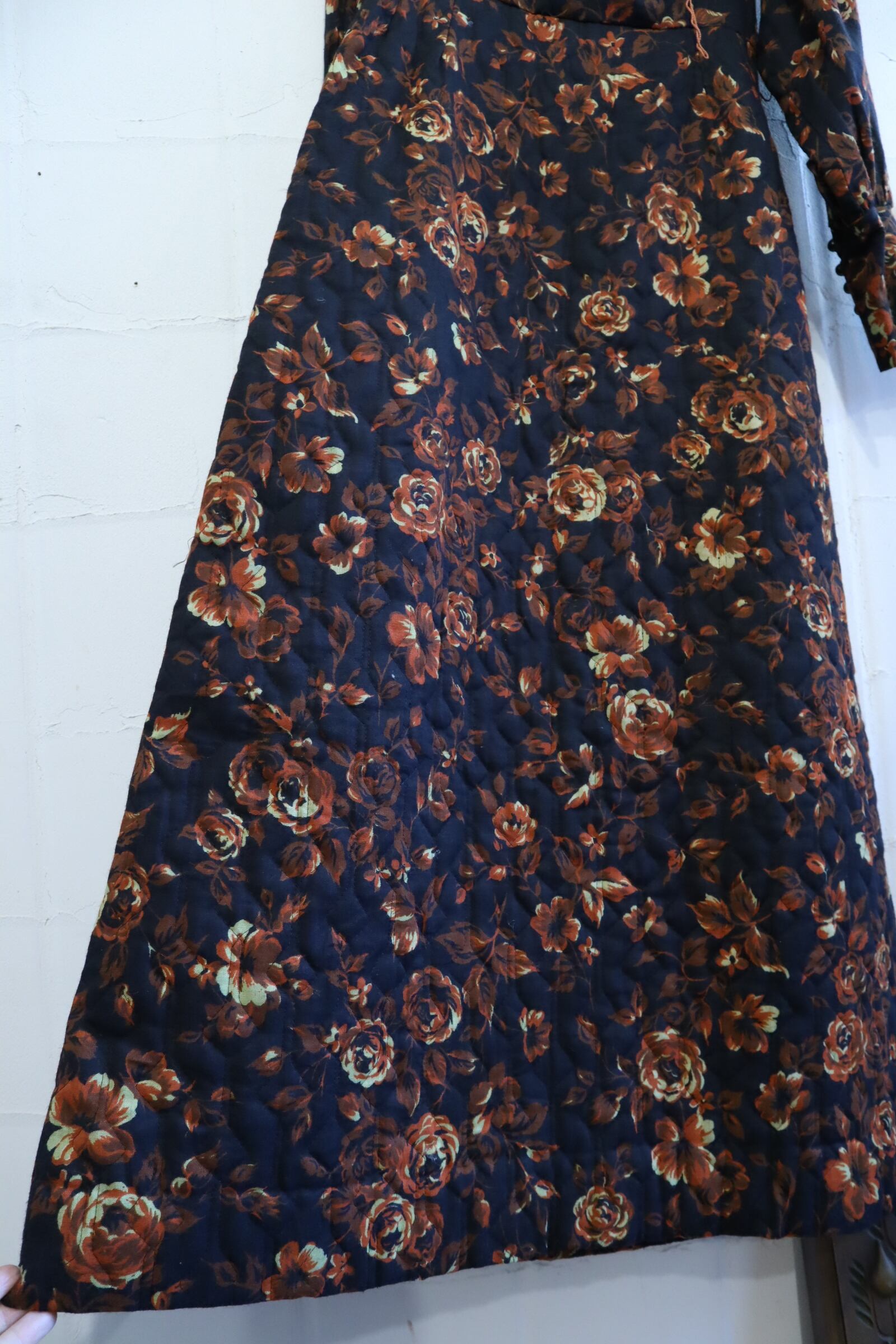 60-70s black×brown flower pattern quilting dress [l-1973]