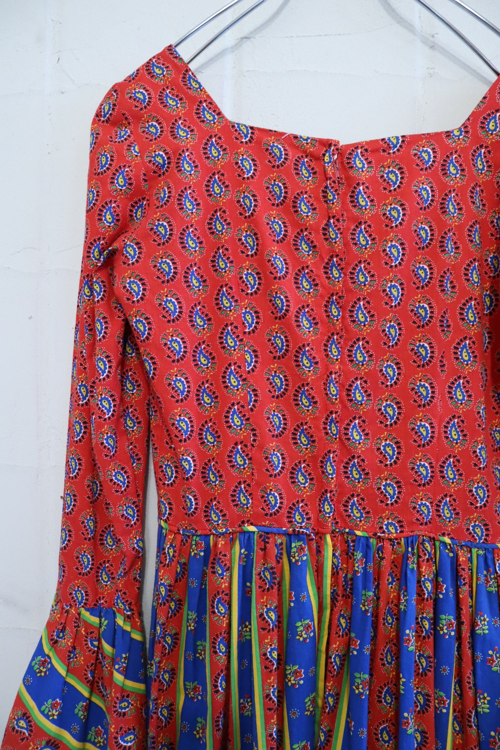 60-70s red×blue flower&paisley lace frill hem dress [l-1974]
