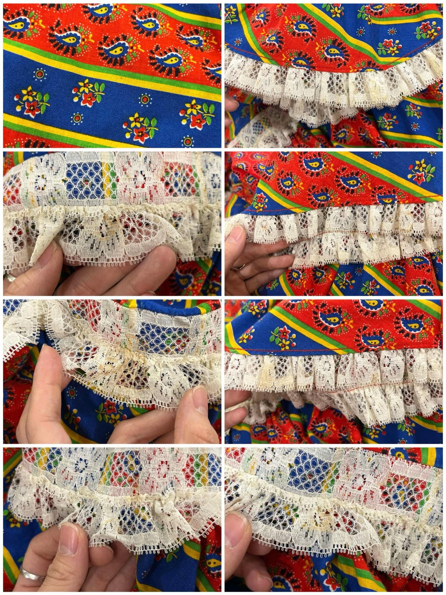 いくつかキズや小穴、レース部分にいくつかシミ汚れがございますが、古着の味として着て頂けるかと思われます。