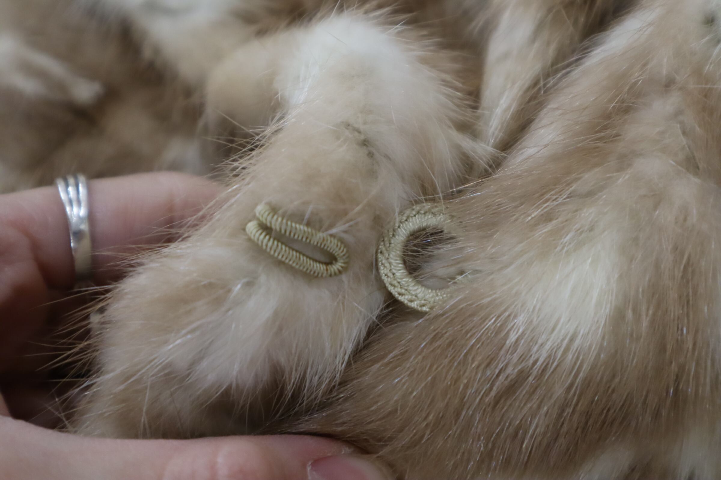 裏地にいくつか汚れやキズ、ボディに一部汚れ、いくつか毛足の剥げなどにより内側が見えている箇所がございますが、あまり気にならないかと思われます。
