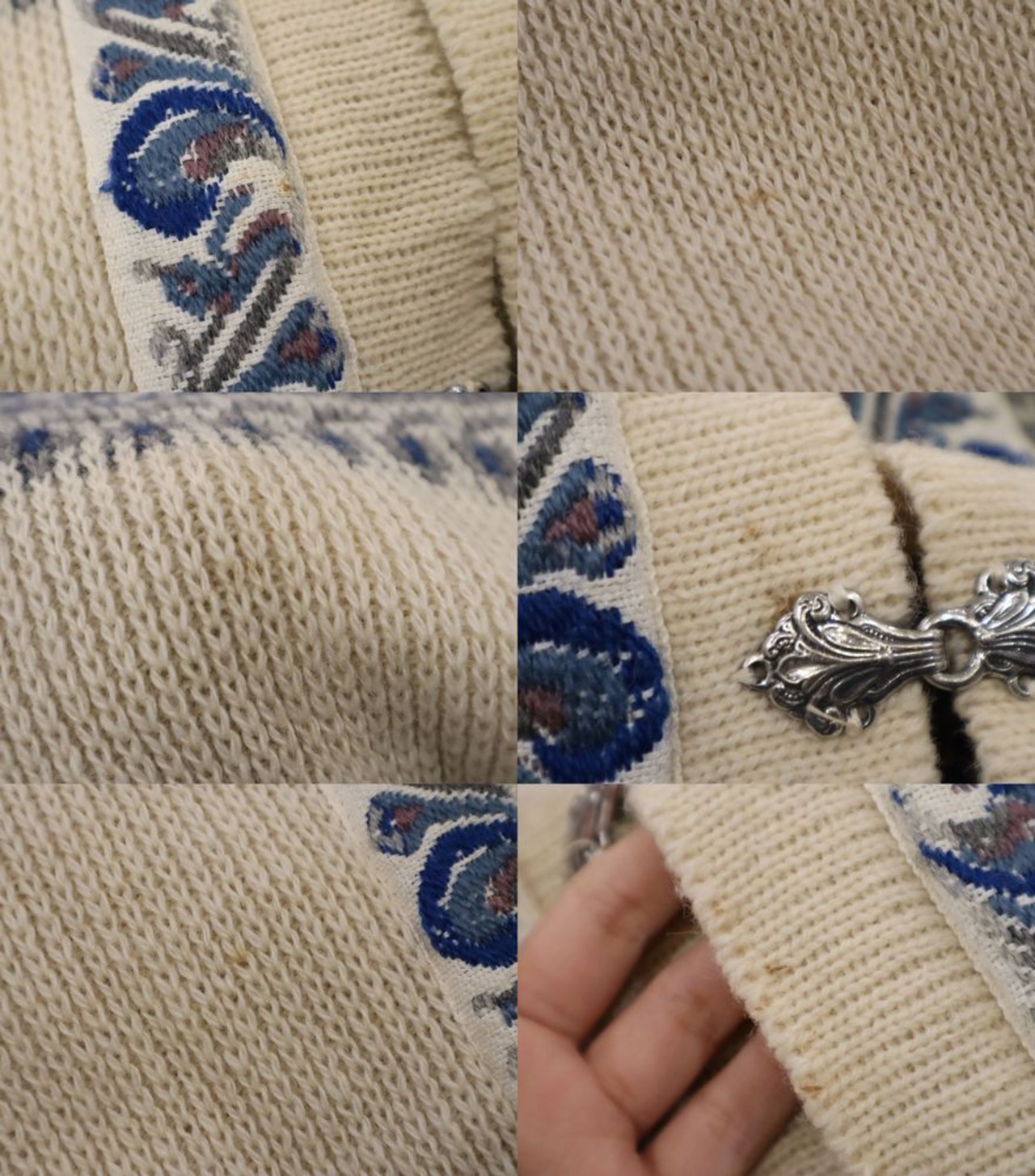 いくつかシミ汚れや糸の飛び出しがございますが、古着の味として着て頂けるかと思われます。