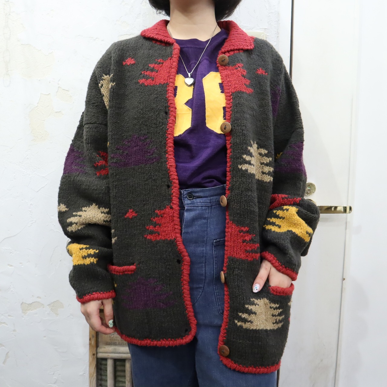 カラーリングや木のような柄が可愛いウールニットカーディガン*