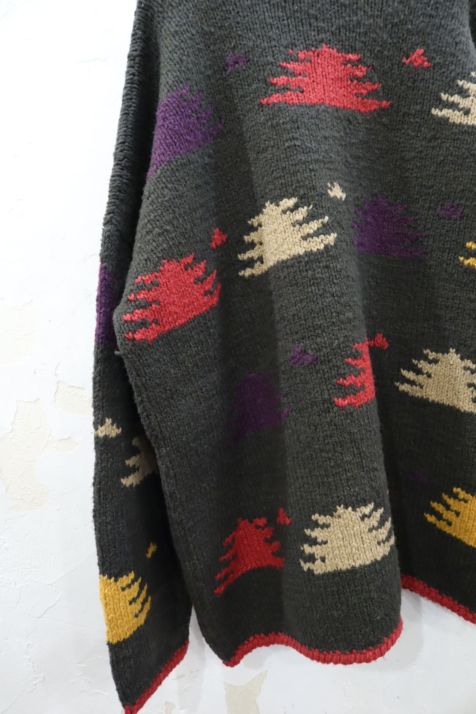 charcoal gray×red motif pattern wool knit cardigan [k-1994]