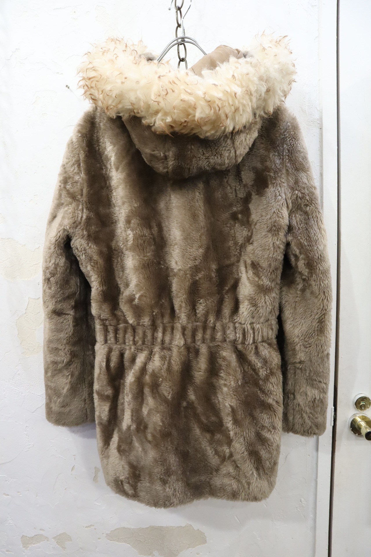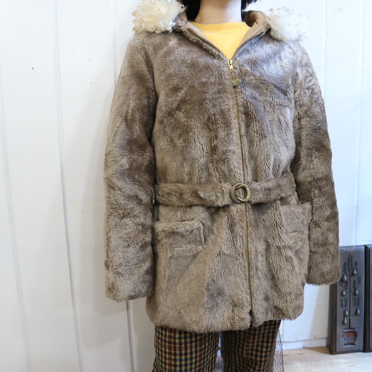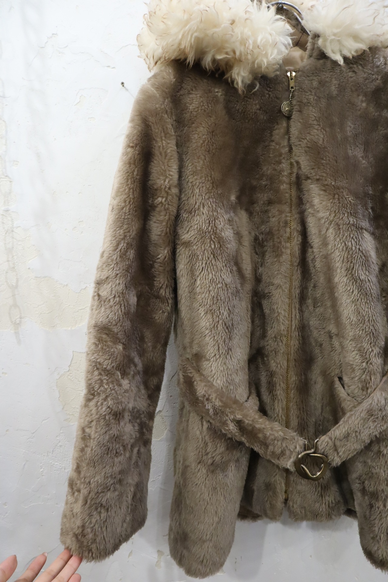 brown×white hood belt fake fur coat [l-2024]