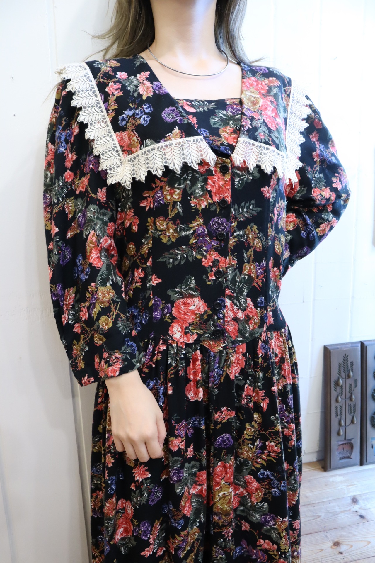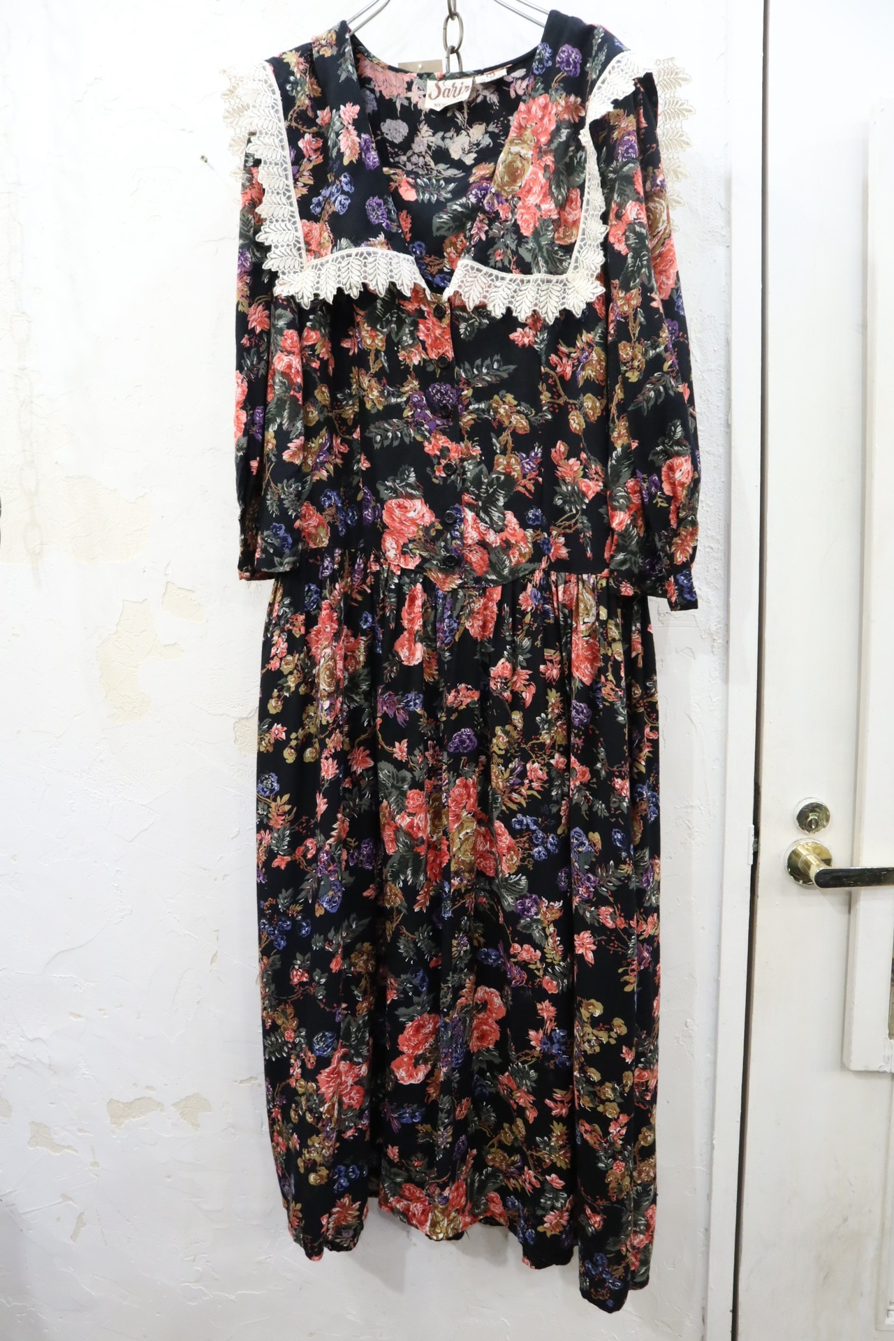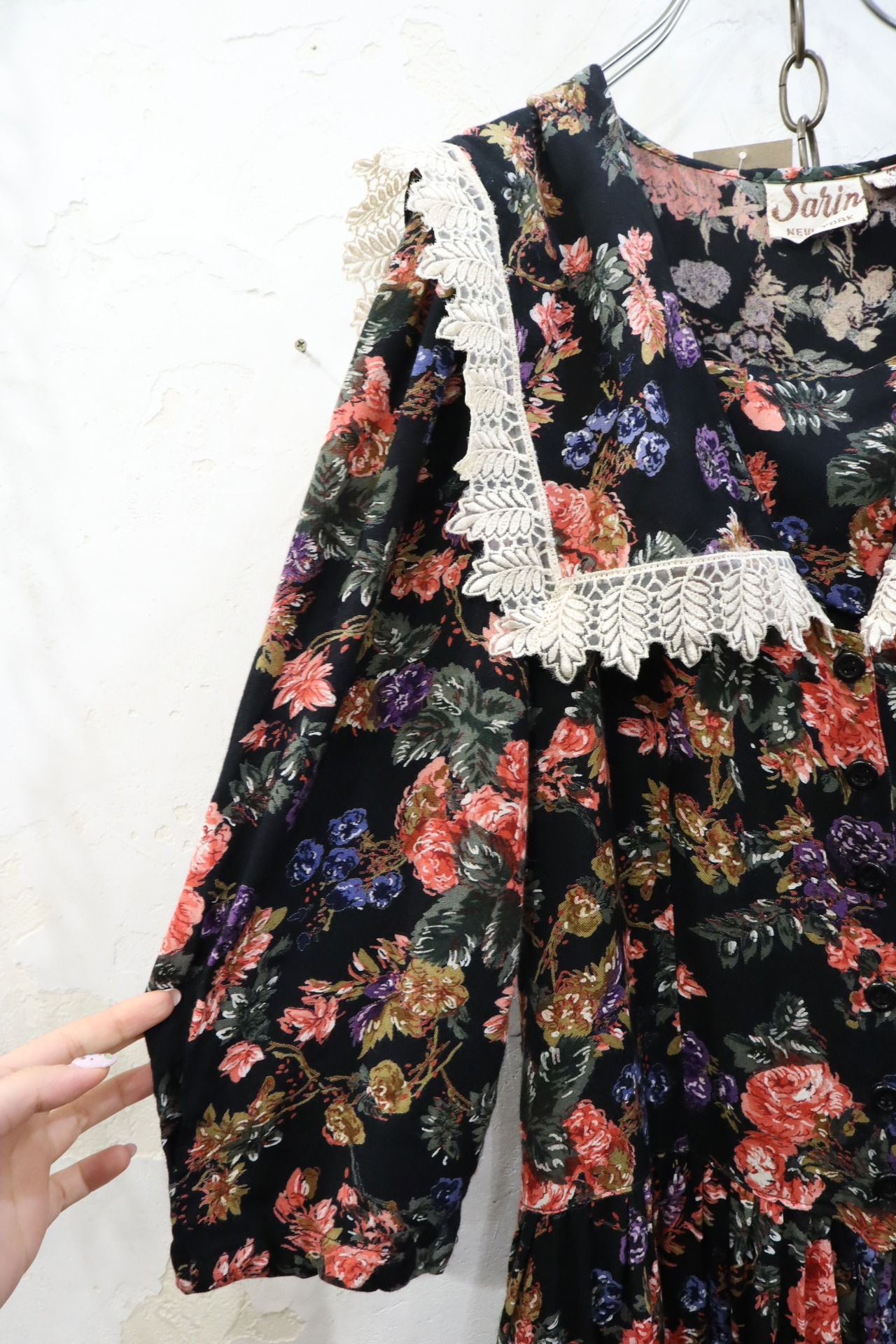 70s black×pink flower sailor collar Indian rayon dress [l-2025]