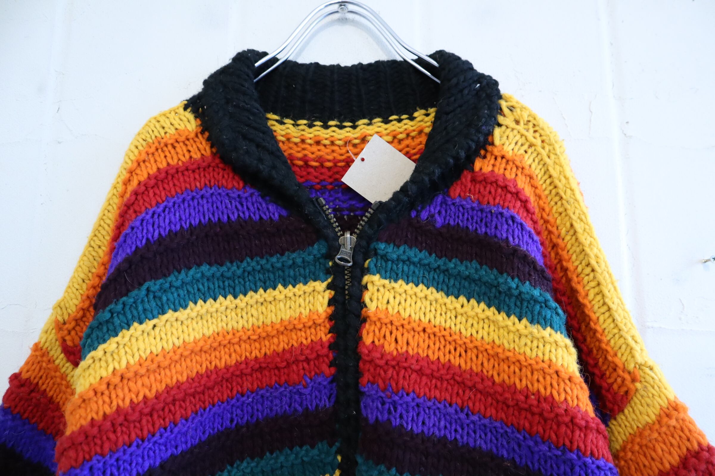 ハッピーなレインボーカラーの襟付きニットカーディガン。