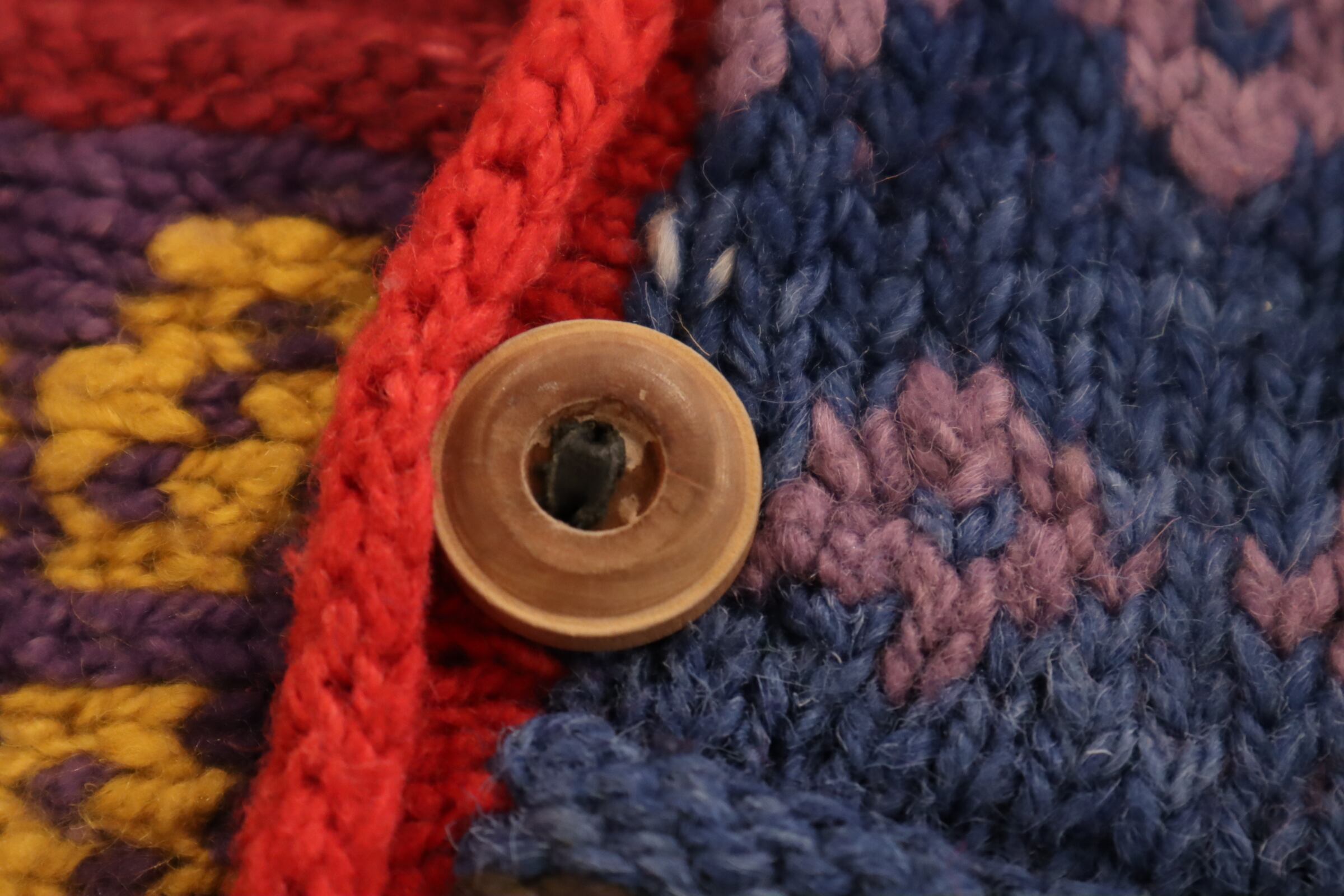 3つのポケット付きが珍しく、ぽこぽこした編みやボタニカルが柄が可愛いです。